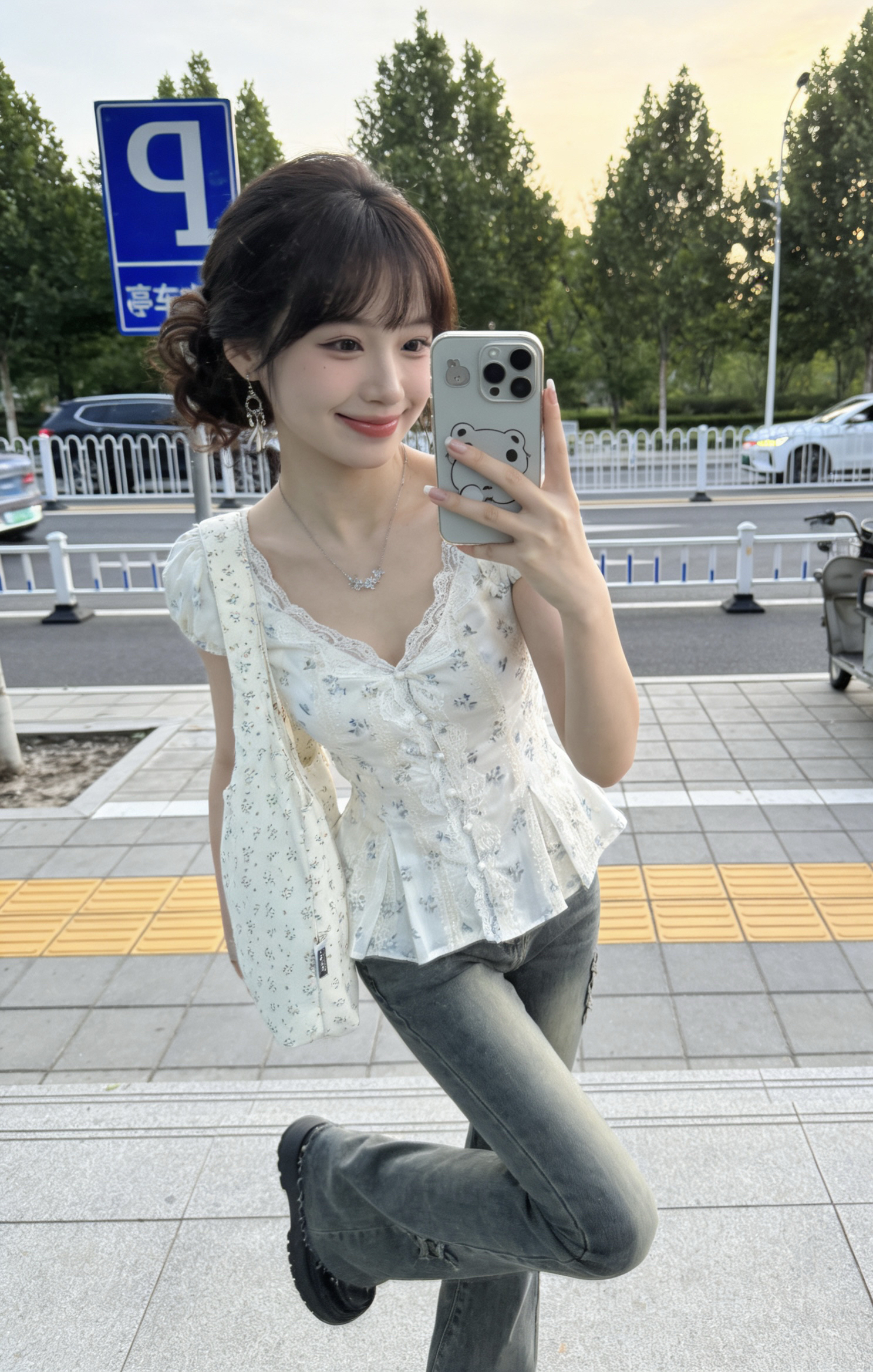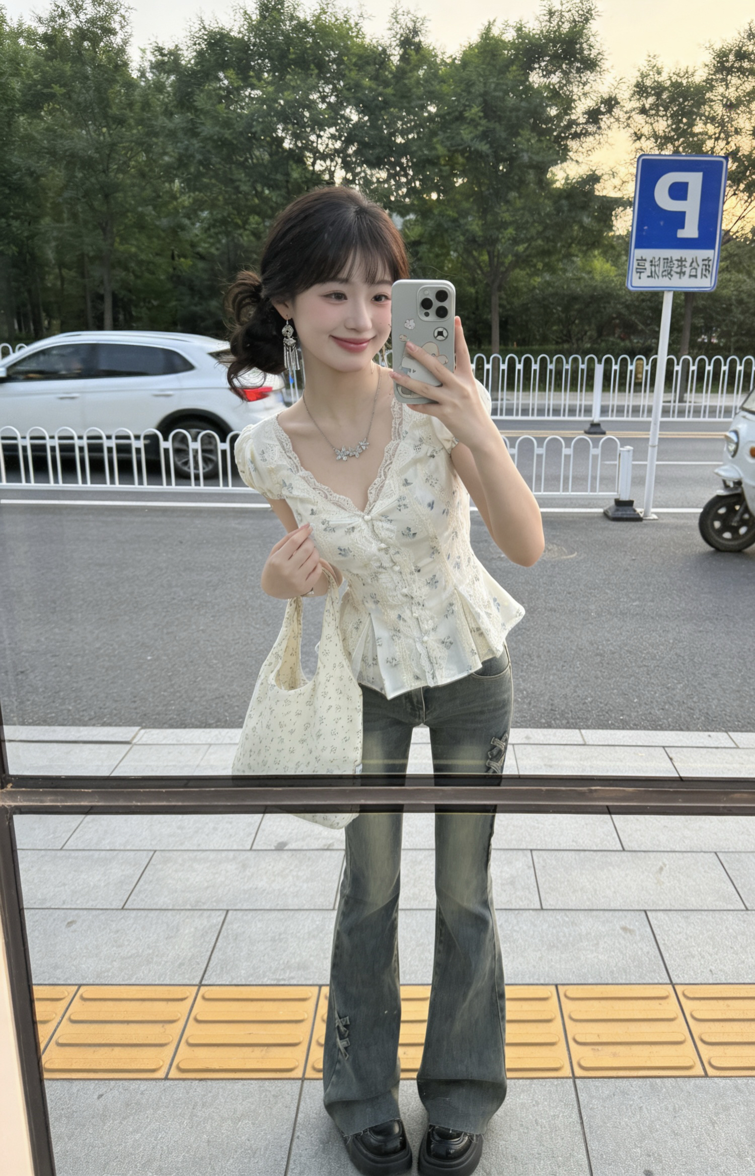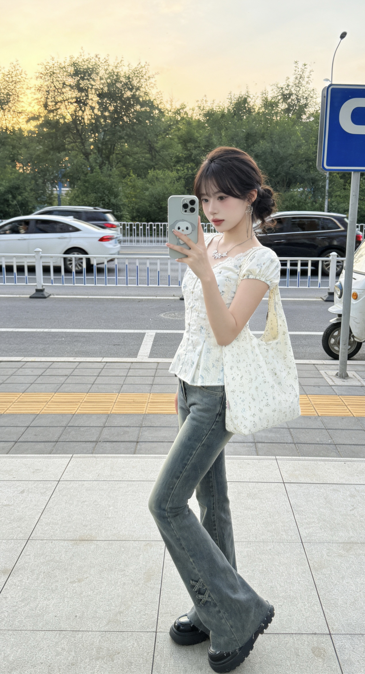 谁懂啊!这套直接把早春氛围感焊在身上了😭 温柔到骨子里的碎花收腰上衣,V领蕾丝边+泡泡袖,巨藏肉还显腰细,梨形身材直接封神! 搭配做旧微喇牛仔裤,交叉绑带设计超有小心机,高腰版型直接把腿拉成1米8,显高显瘦一绝! 同系列碎花托特包+碎钻项链,细节感直接拉满,甜而不腻,韩系女主那味儿不就来了嘛! 早春出街、约会、通勤都能穿,青春活力感直接拉满,黄皮姐妹也能放心冲,显白又减龄,甜妹们快抄作业!