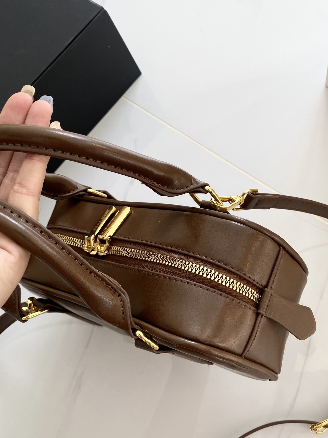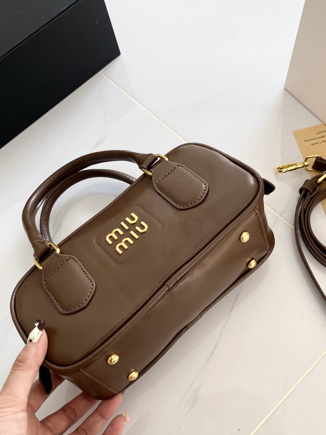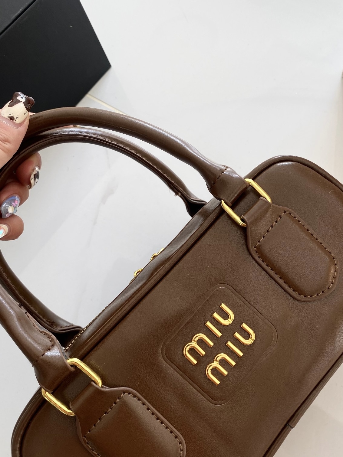 谁能拒绝一只复古感拉满的Miu Miu风保龄球包啊!😭 深棕配金扣真的太显贵了,完全就是秋冬穿搭的万能钥匙! ✅ 包型:迷你保龄球枕头包,挺括不软塌,手提是大小姐,斜挎秒变休闲甜妹 ✅ 细节:正面压印miumiu字母标,亮金五金质感在线,包底防磨钉超实用 ✅ 容量:日常出门的手机、粉饼、口红、钥匙全能装下,打工人通勤/学生党上课都合适 ✅ 百搭度:深棕色真的不挑人!大衣、毛衣、卫衣、牛仔都能搭,一...