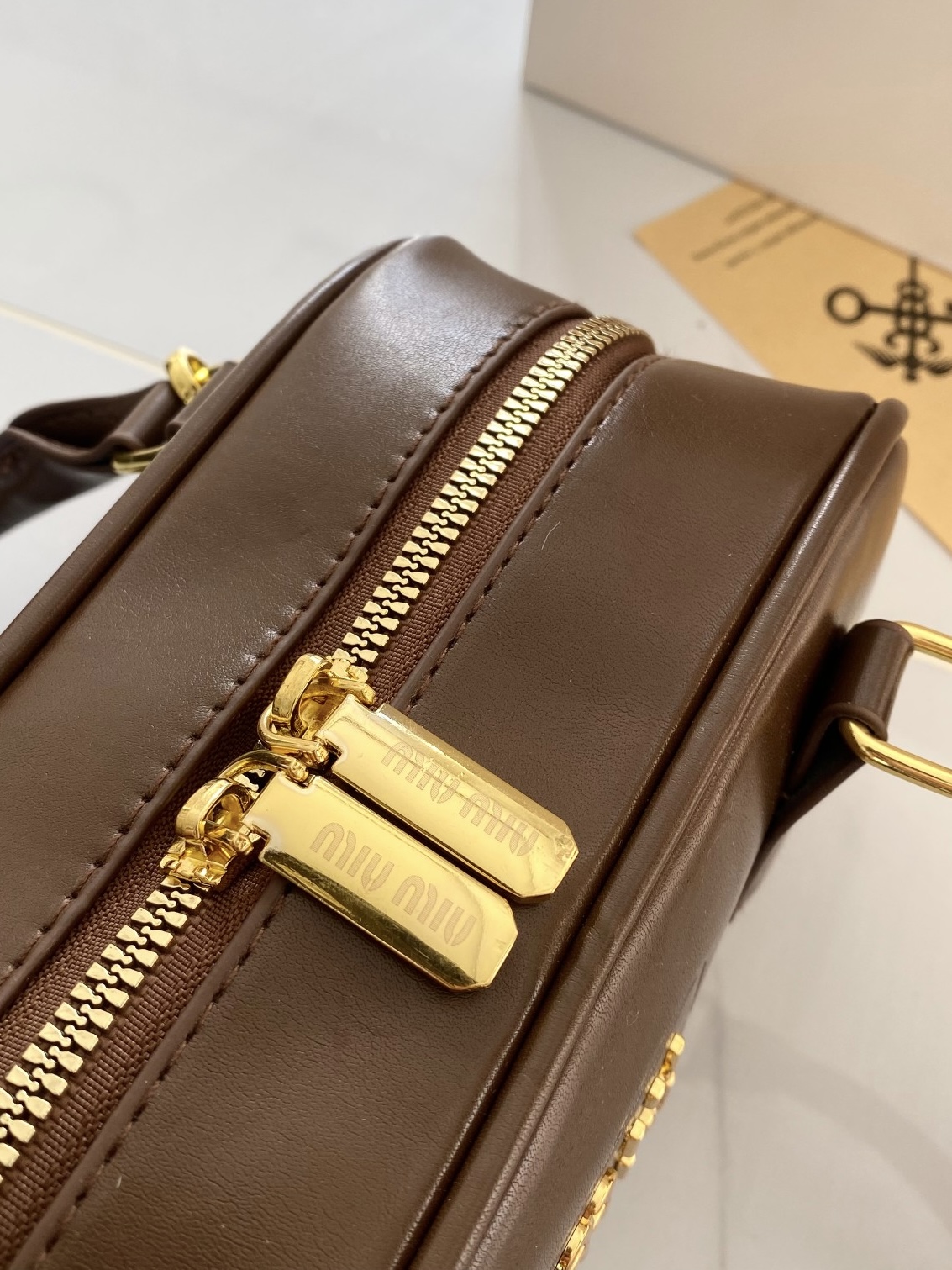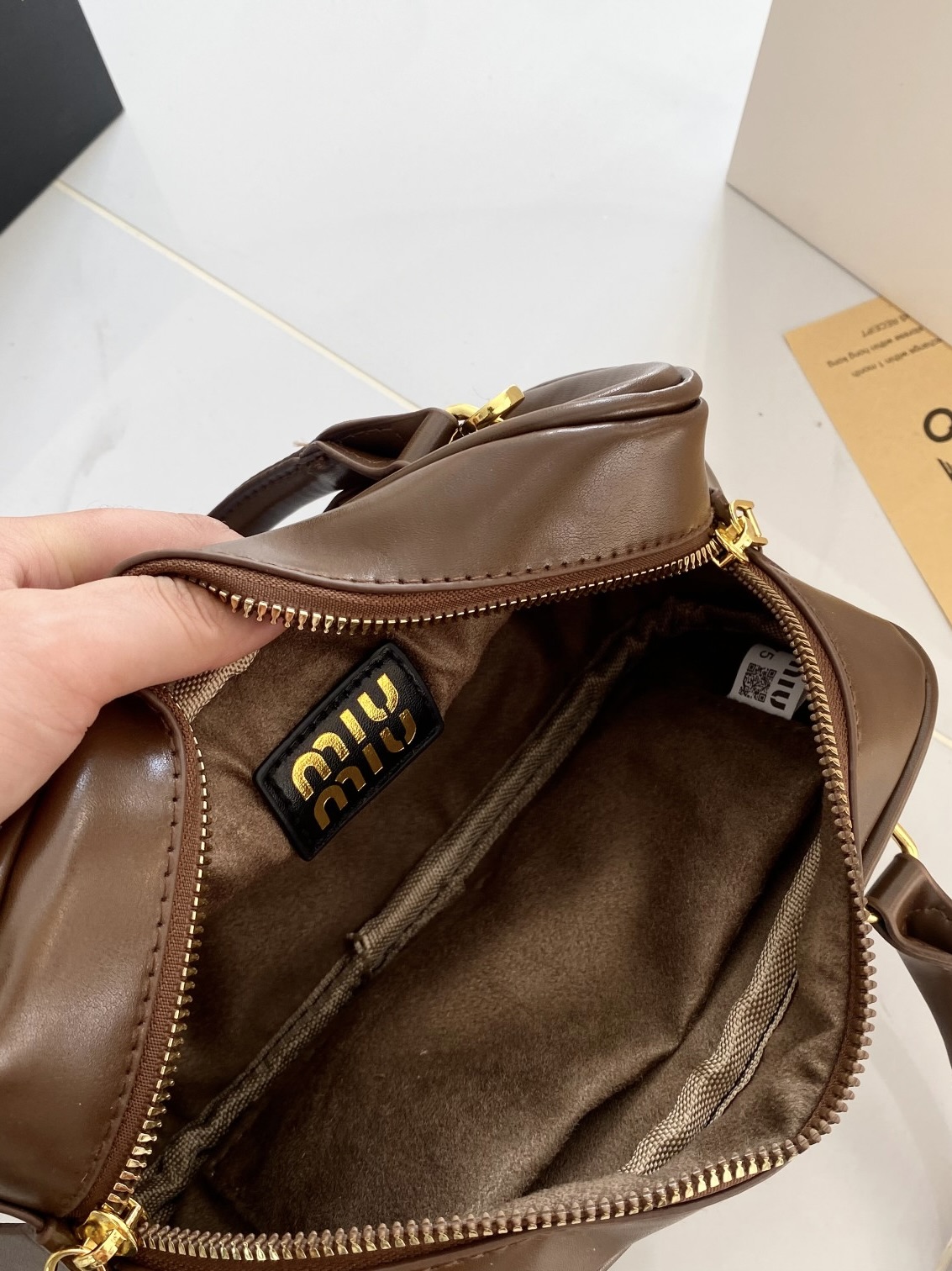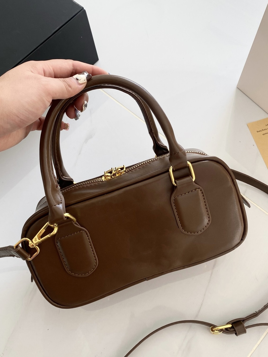 谁能拒绝一只复古感拉满的Miu Miu风保龄球包啊!😭 深棕配金扣真的太显贵了,完全就是秋冬穿搭的万能钥匙! ✅ 包型:迷你保龄球枕头包,挺括不软塌,手提是大小姐,斜挎秒变休闲甜妹 ✅ 细节:正面压印miumiu字母标,亮金五金质感在线,包底防磨钉超实用 ✅ 容量:日常出门的手机、粉饼、口红、钥匙全能装下,打工人通勤/学生党上课都合适 ✅ 百搭度:深棕色真的不挑人!大衣、毛衣、卫衣、牛仔都能搭,一...