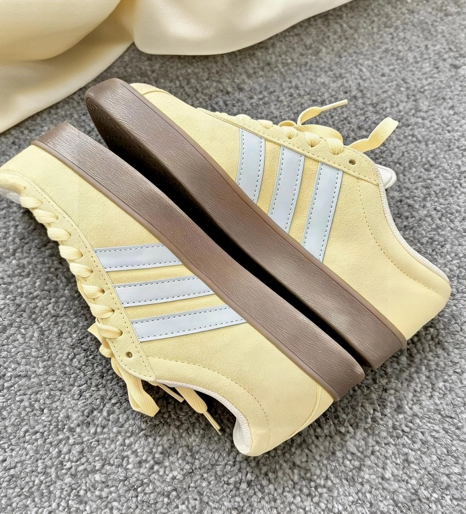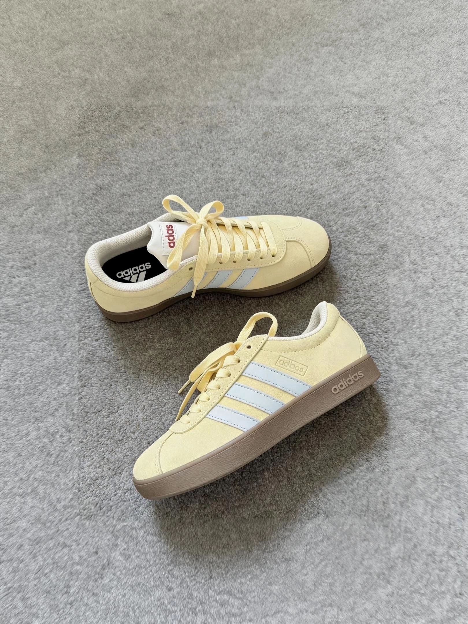 这双阿迪的浅黄色鞋真的太适合夏天了!麂皮材质摸起来软乎乎的,浅黄色很清新,白色三条纹经典又显眼。棕色鞋底厚实,走路舒服。搭配牛仔裤或者短裤都好看,日常上学、逛街穿都很合适。放在灰色地毯上,颜色对比明显,显得干净。鞋子穿一天都不累脚,性价比可以,推荐考虑!