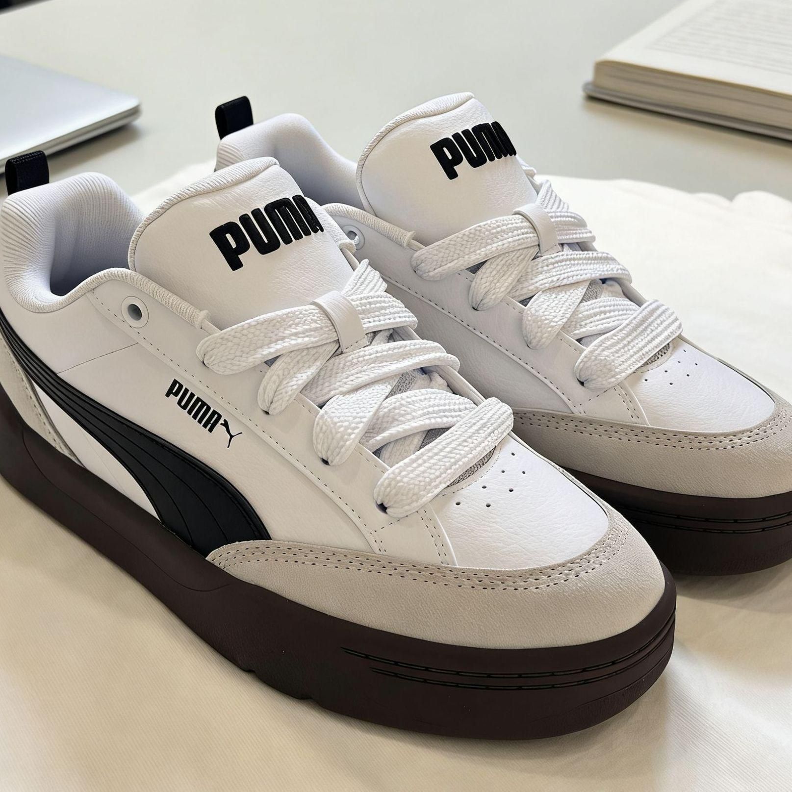 被这双PUMA面包鞋狠狠拿捏了🤍 白黑生胶的经典配色真的永不过时,厚底面包版型超显腿细,小个子直接秒变大长腿! 鞋面是细腻的皮革+麂皮拼接,质感拉满,粗鞋带设计更显随性,日常穿超有氛围感。 上脚软乎乎的,走路完全不磨脚,通勤、上学、出街都能搭,牛仔裤、运动裤、短裙随便配都好看。