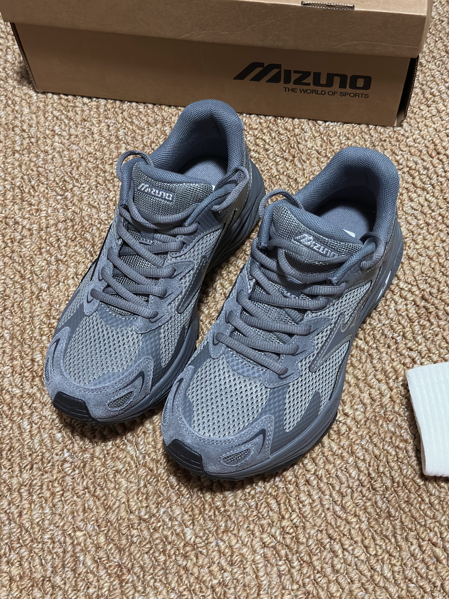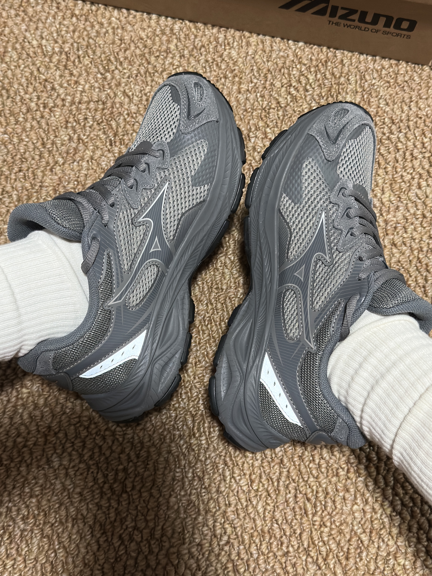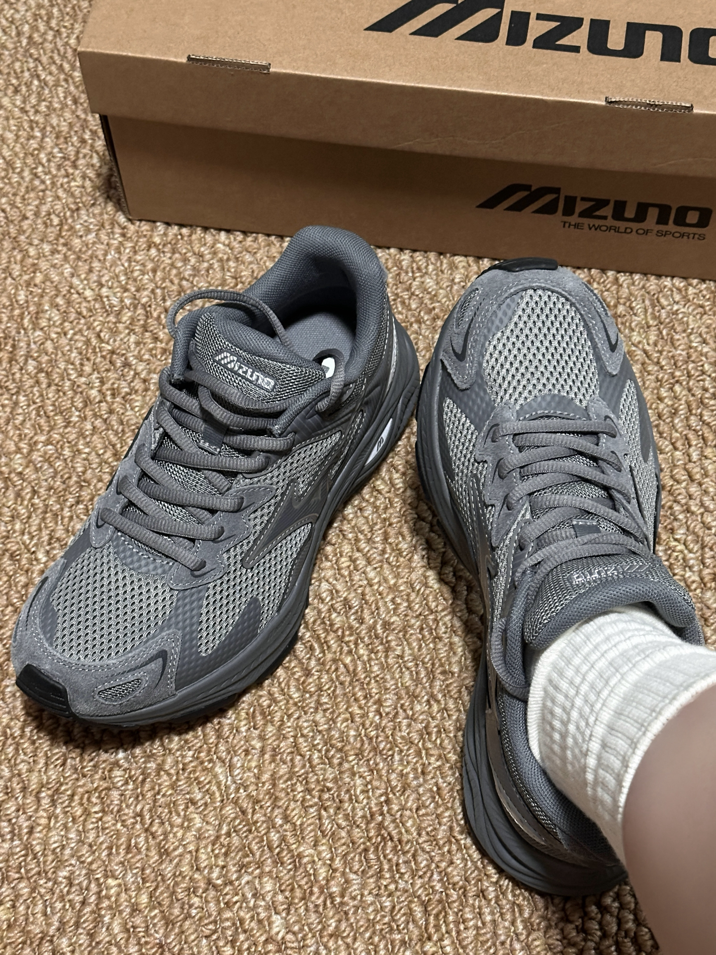 拆箱Mizuno就被戳中!深灰配色低调百搭,网面透气不闷脚,上脚试了下,中底缓震很稳,走路像踩云又带支撑感。复古轮廓配休闲装超和谐,通勤、慢跑都能穿,性价比绝了,真心推荐给想找双“全能鞋”的友友们☺️☺️☺️