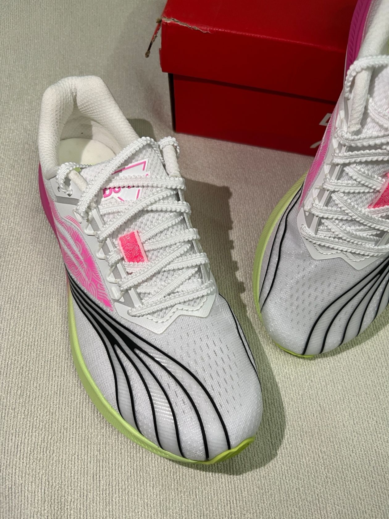 收到这双跑鞋后就赶紧试了一下,上脚还是挺舒服的,鞋面摸着就感觉很透气,质感不错~ 整体包裹性也可以,颜色是我喜欢的,像日常用它跑步🏃🏻♀️什么的都不错,自带全掌碳板,让跑步也舒服~