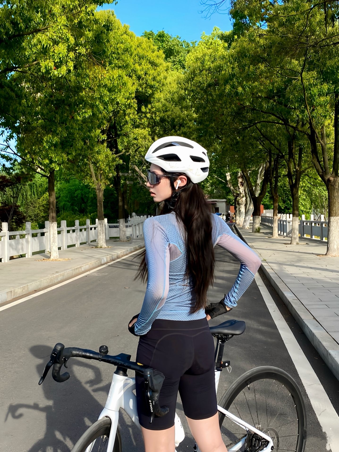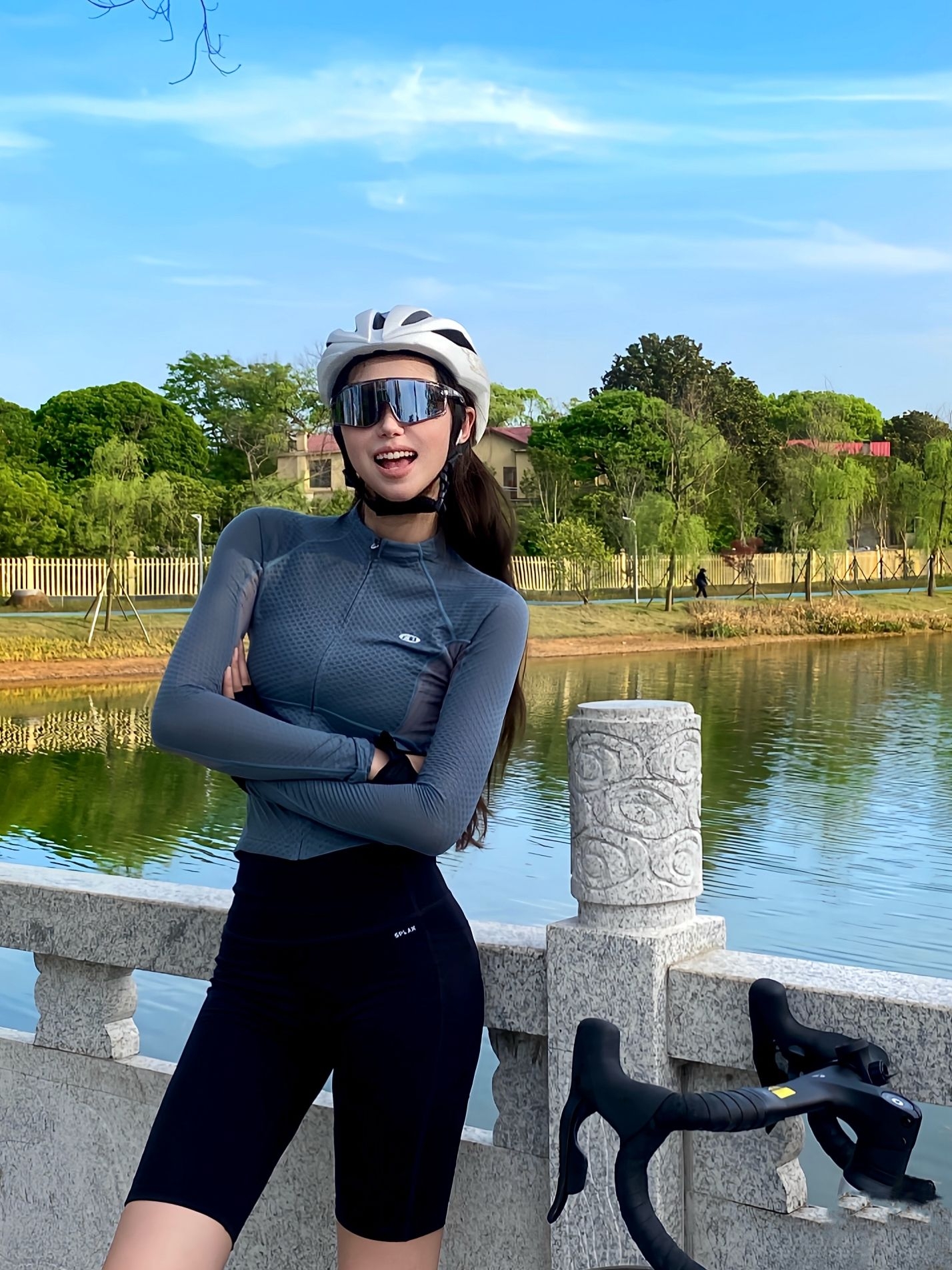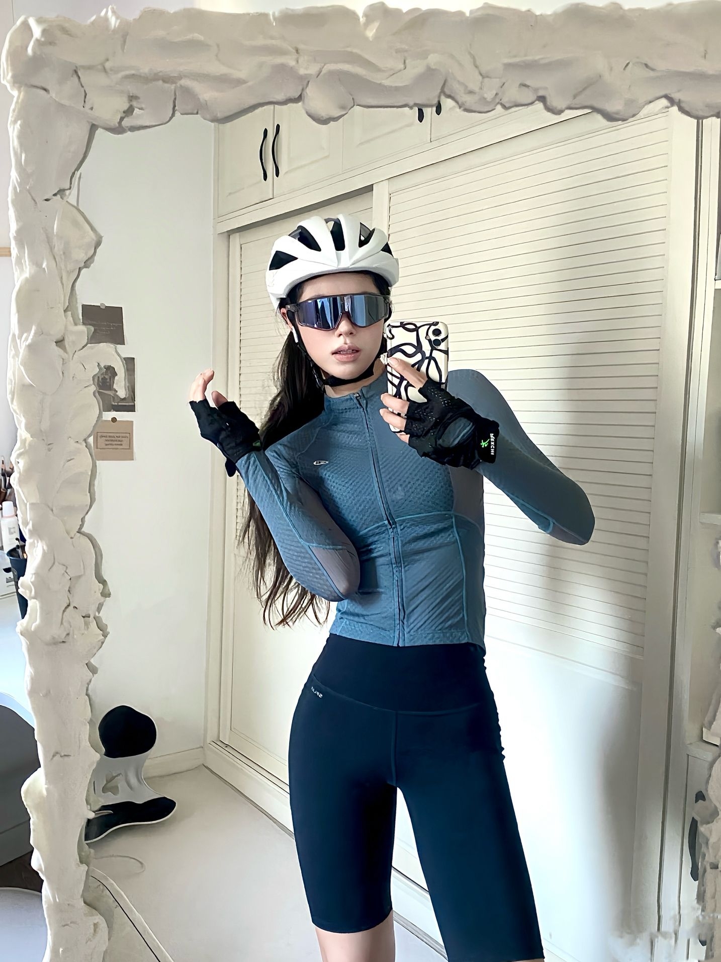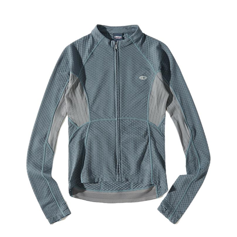 上身这件灰蓝色长袖骑行服,面料轻薄透气,贴身穿毫无束缚感,长时间骑行也清爽不闷汗。衣身的网眼纹理设计,既提升了透气性,又让造型多了几分利落的运动感,修身的剪裁刚好勾勒出线条,不会显得臃肿。