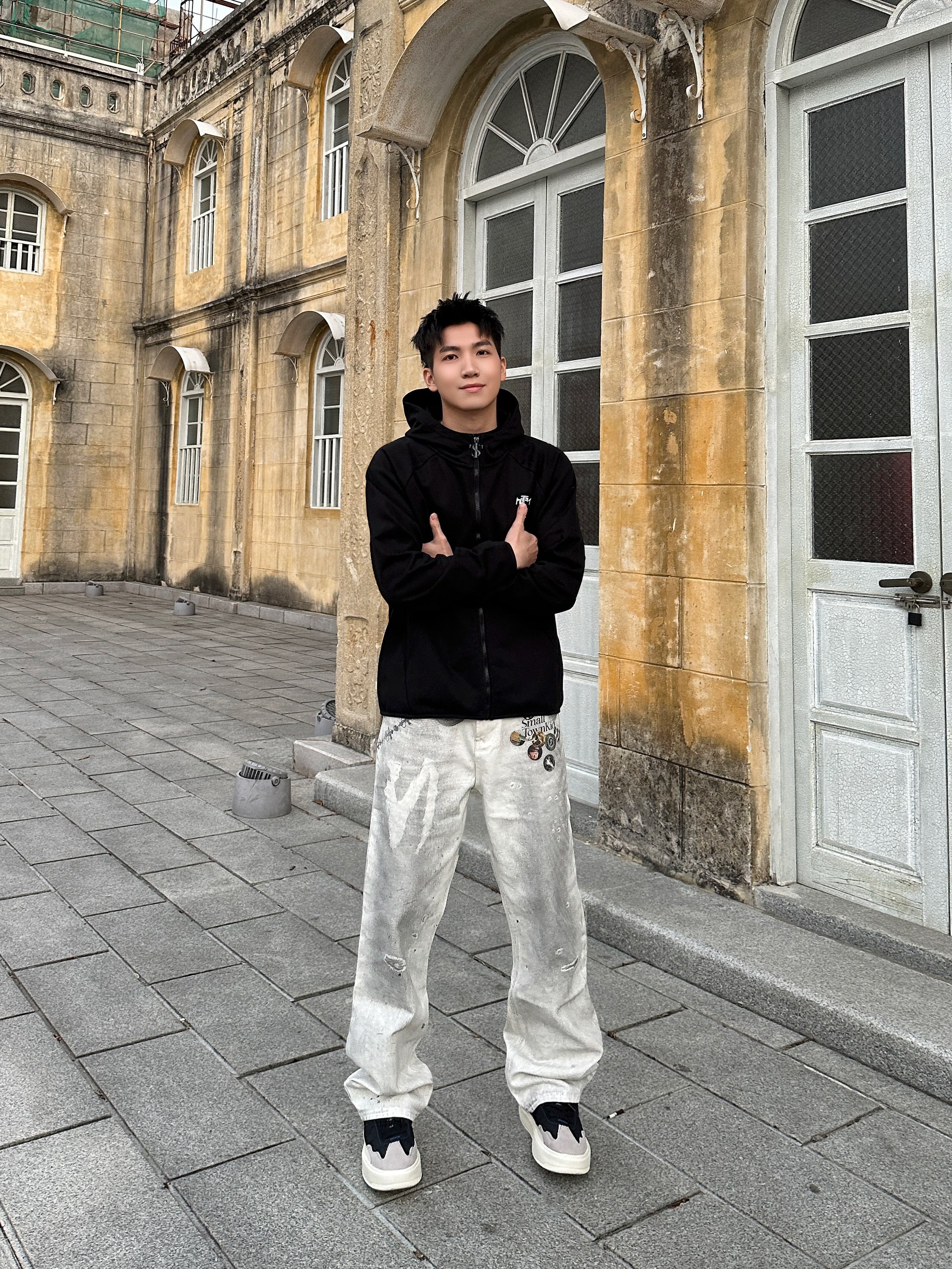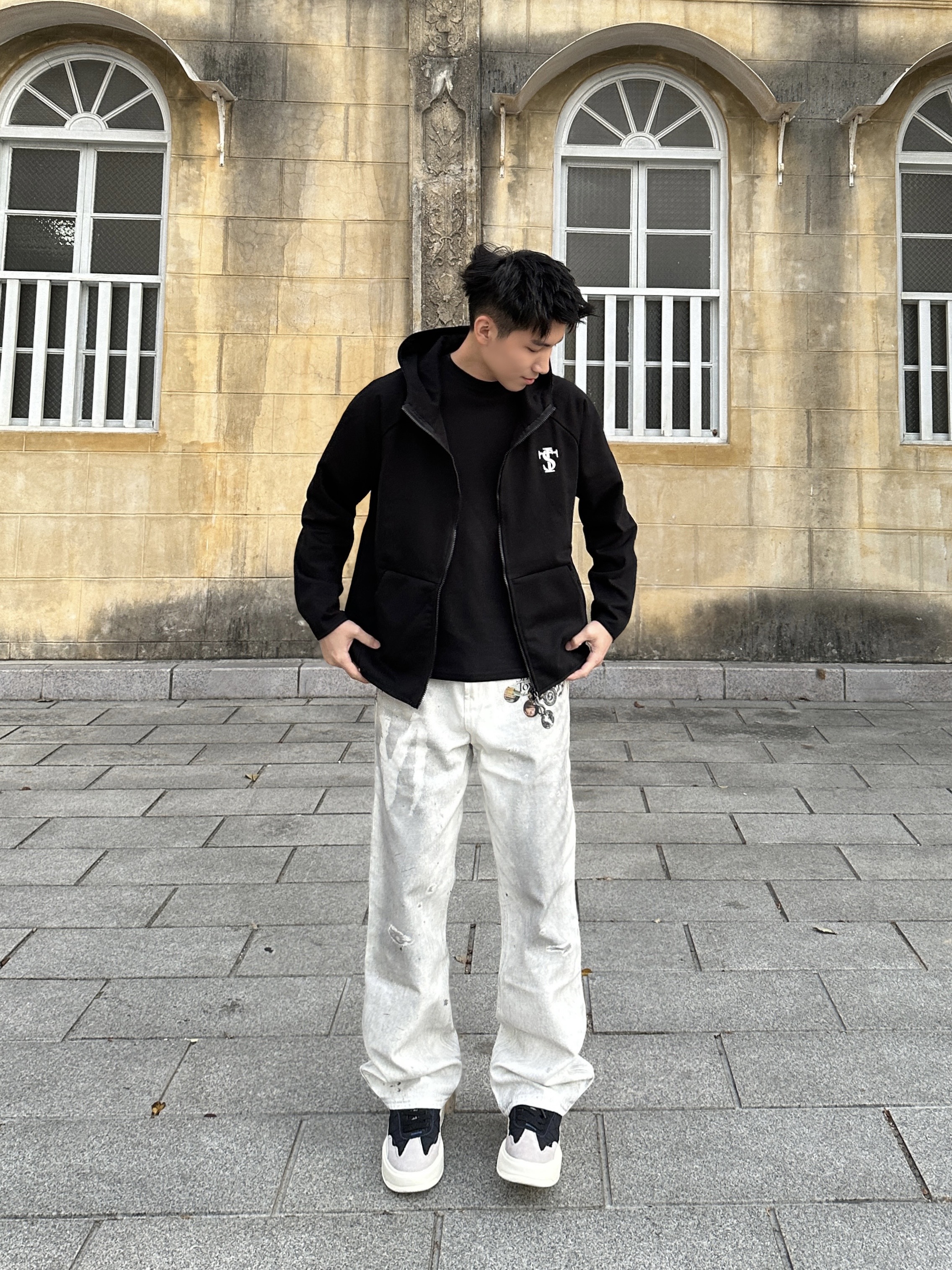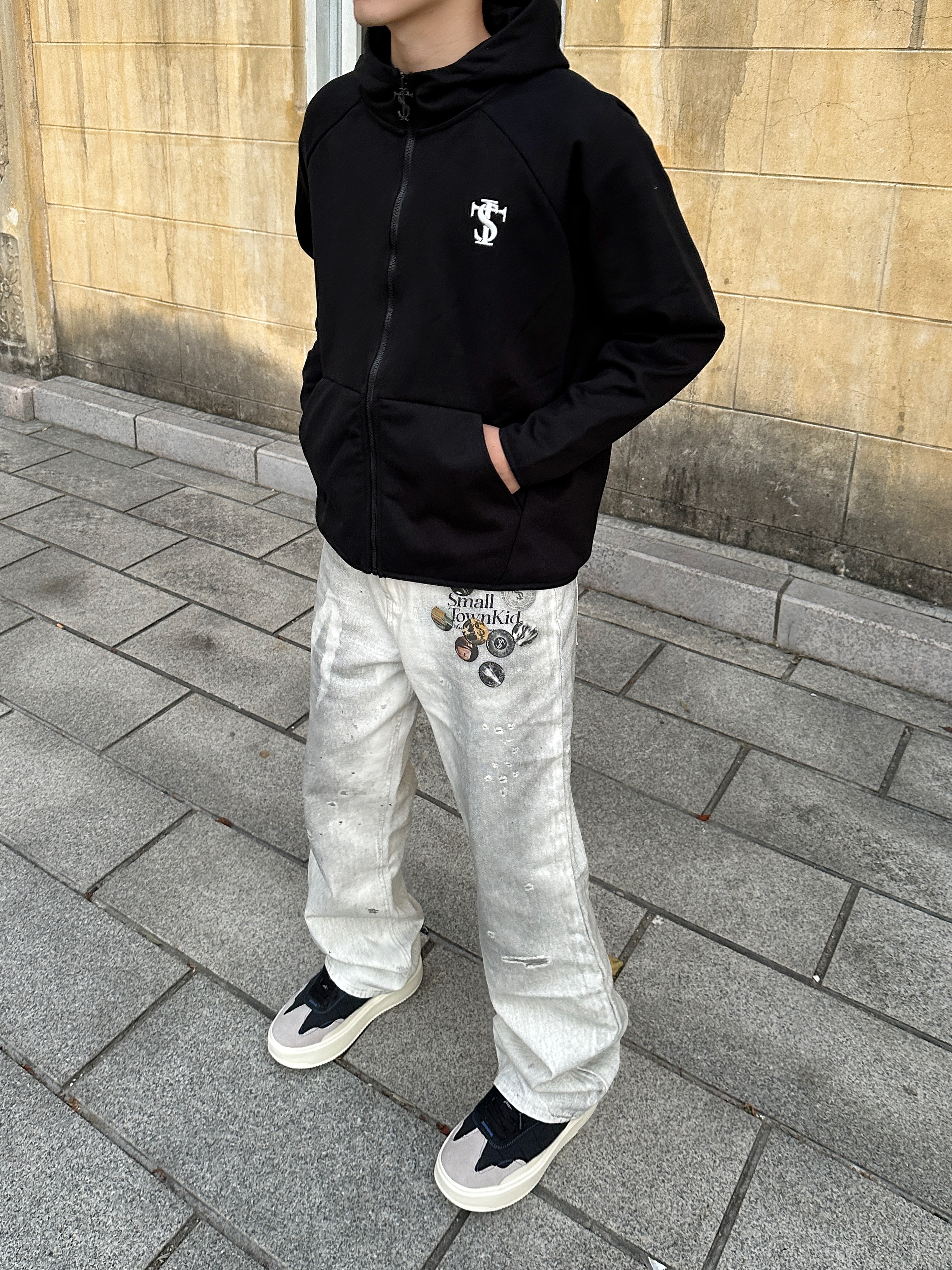 出街就要穿出街头感🆙 👕上身 STK SMALL TOWN KID 卫衣外套,经典黑色连帽拉链款是永不过时的百搭单品,胸口印花设计点睛之笔,宽松版型不挑身材,随便一套就很好看! 👖裤子搭配 STK SMALL TOWN KID 白色牛仔裤,水洗做旧效果很帅啊!徽章印花设计感满满,面料硬挺有型质感在线! 版型上身是真的好看,街头感十足! 👟鞋子是 #玲吾玖二 的黑色德训鞋,采用多材质拼接设...