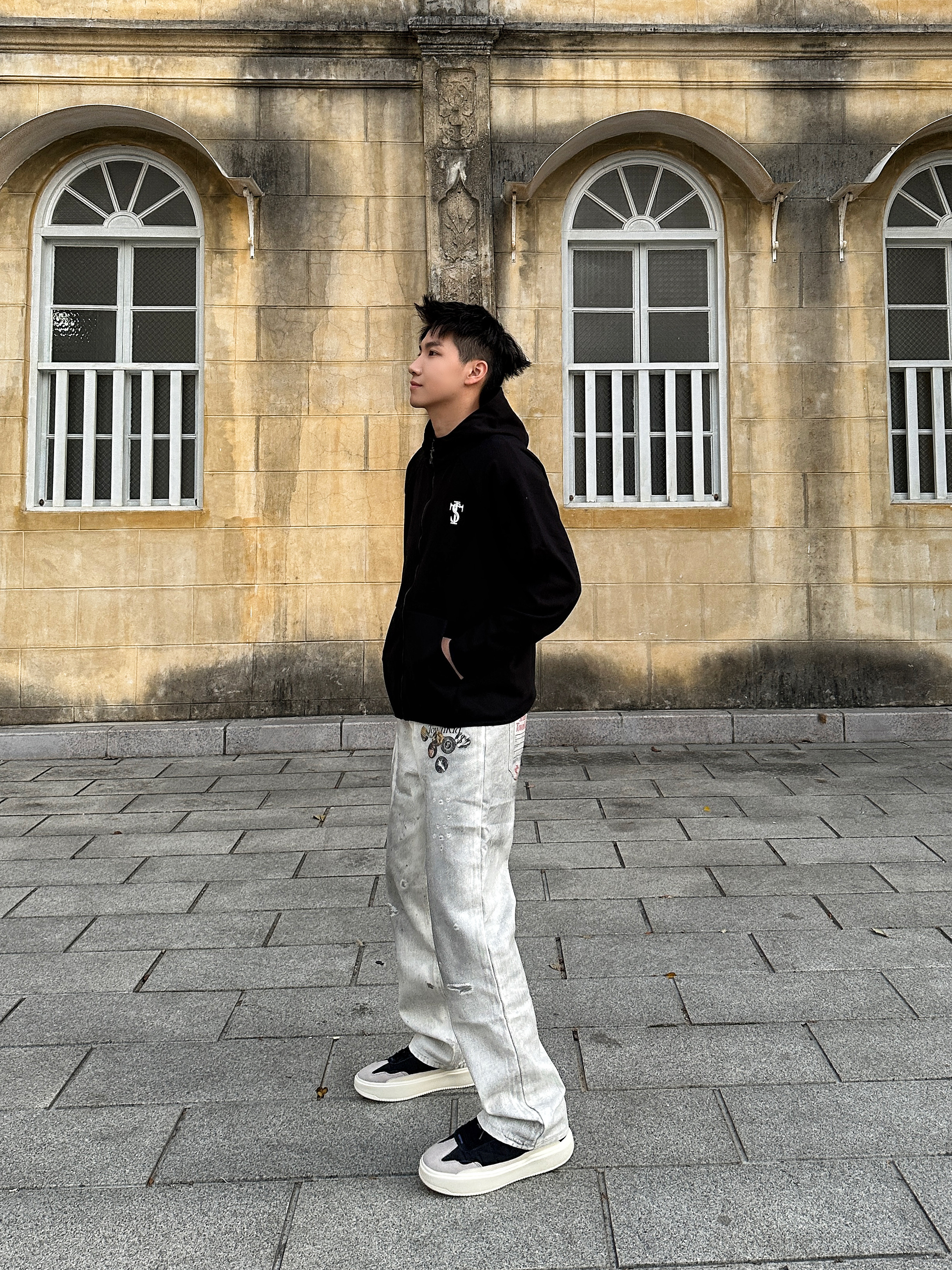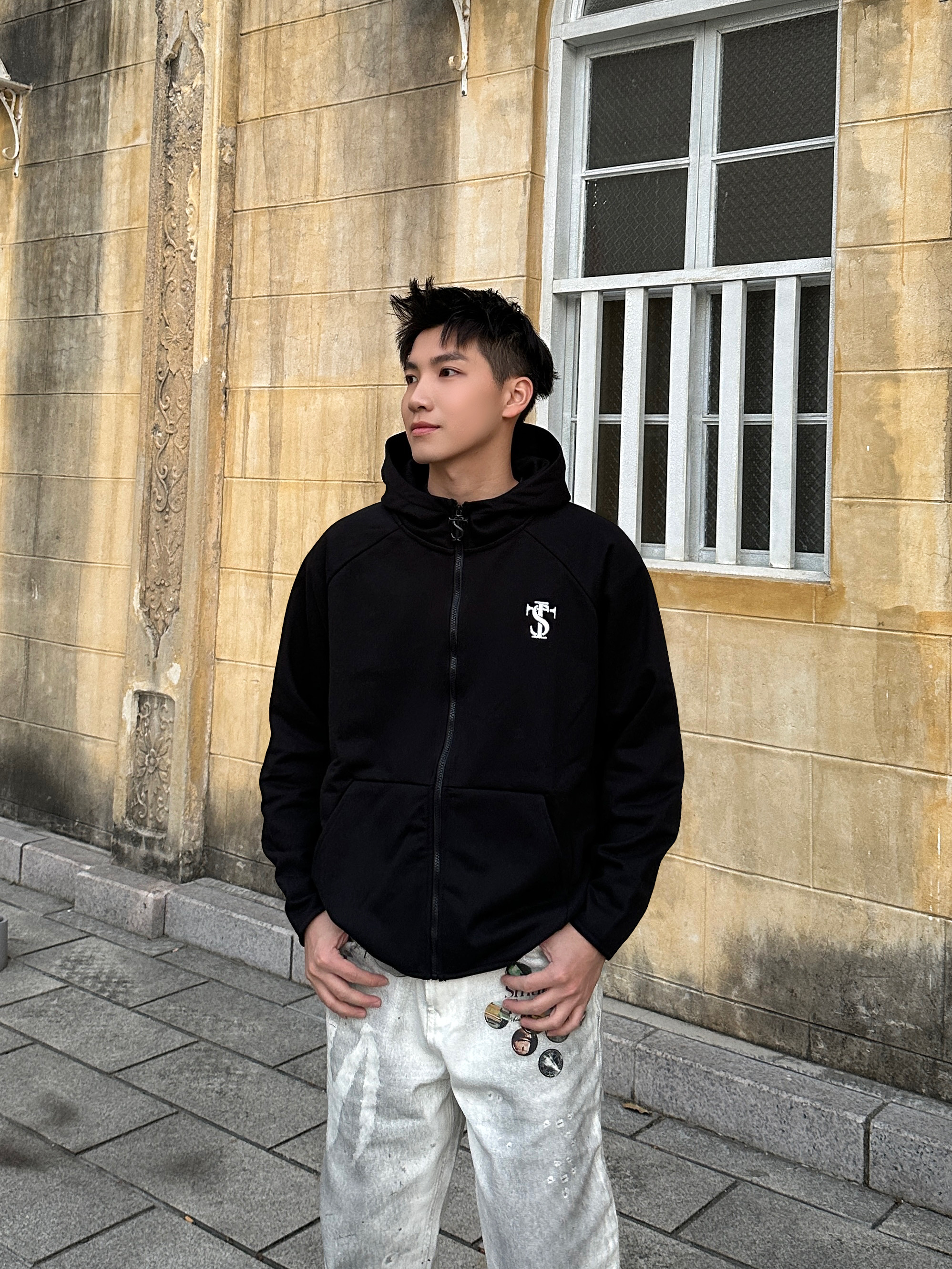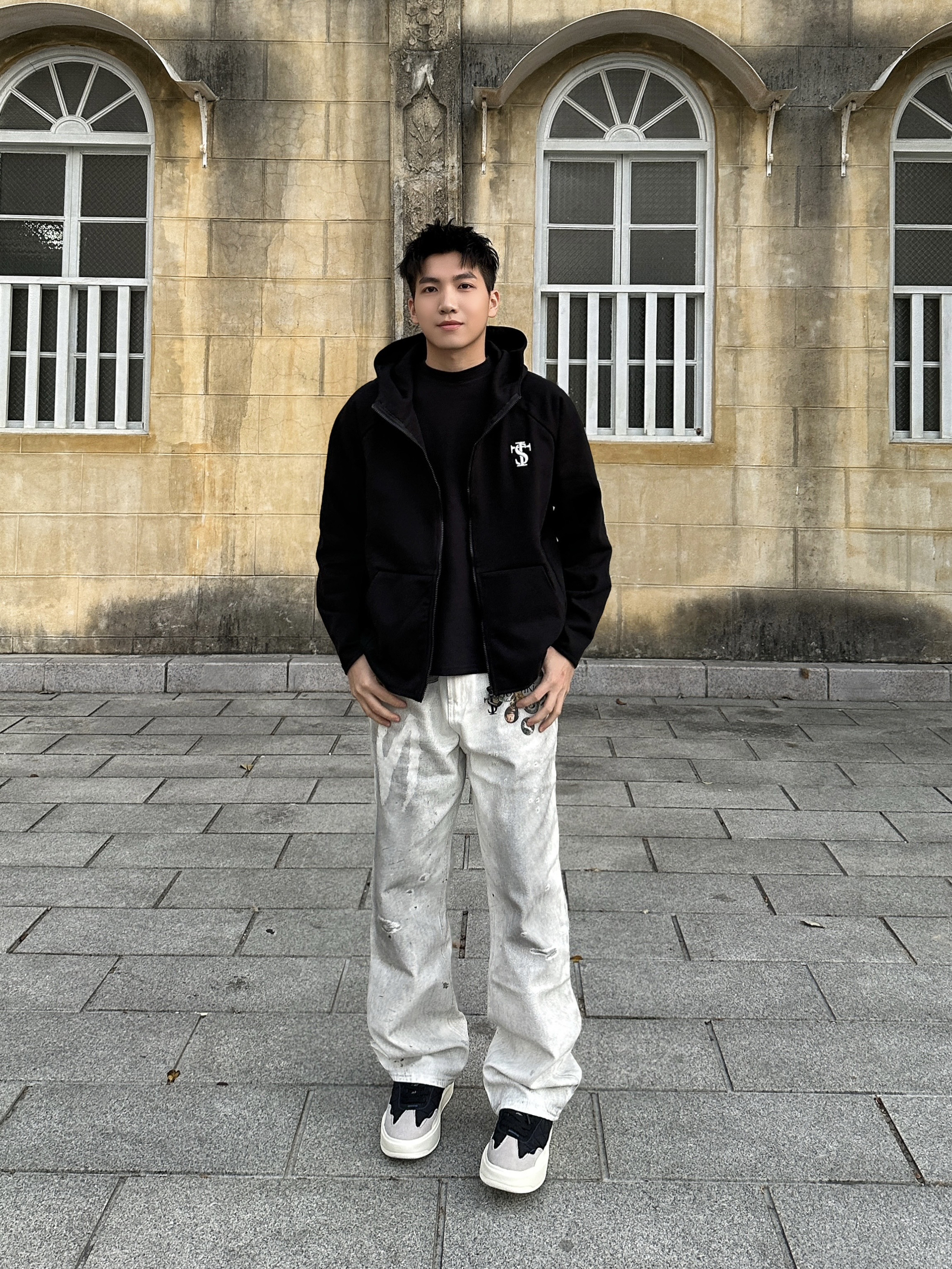 出街就要穿出街头感🆙 👕上身 STK SMALL TOWN KID 卫衣外套,经典黑色连帽拉链款是永不过时的百搭单品,胸口印花设计点睛之笔,宽松版型不挑身材,随便一套就很好看! 👖裤子搭配 STK SMALL TOWN KID 白色牛仔裤,水洗做旧效果很帅啊!徽章印花设计感满满,面料硬挺有型质感在线! 版型上身是真的好看,街头感十足! 👟鞋子是 #玲吾玖二 的黑色德训鞋,采用多材质拼接设...
