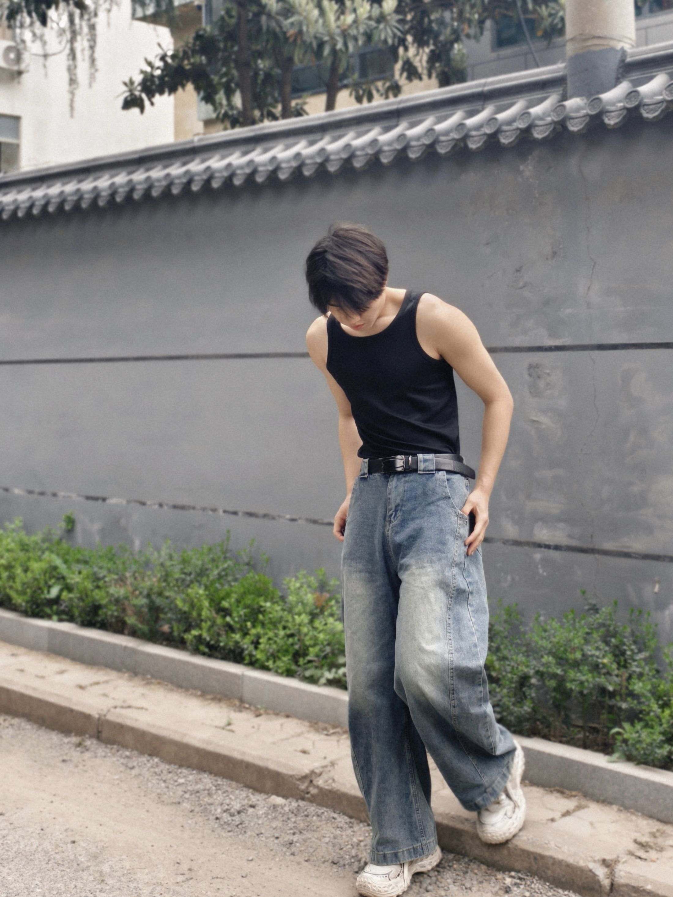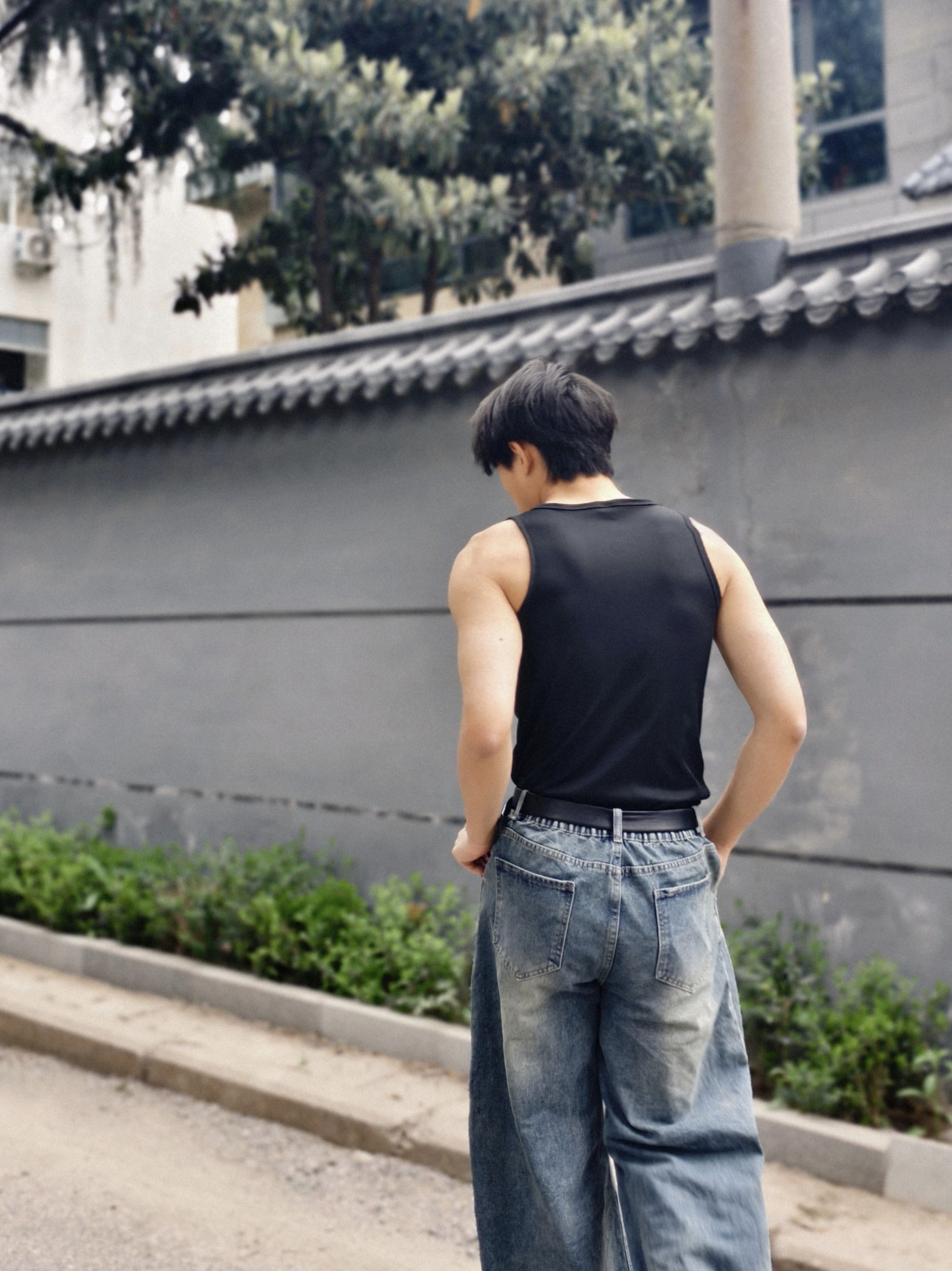 基础款黑背心真的太百搭了 修身不紧绷,刚好勾勒出线条感 搭一条做旧阔腿牛仔裤,秒变松弛感帅哥 老巷子、街头随便拍都出片 日常通勤、出街都能穿,不挑身材不挑场景 男生夏天直接抄这个穿搭公式就对了!