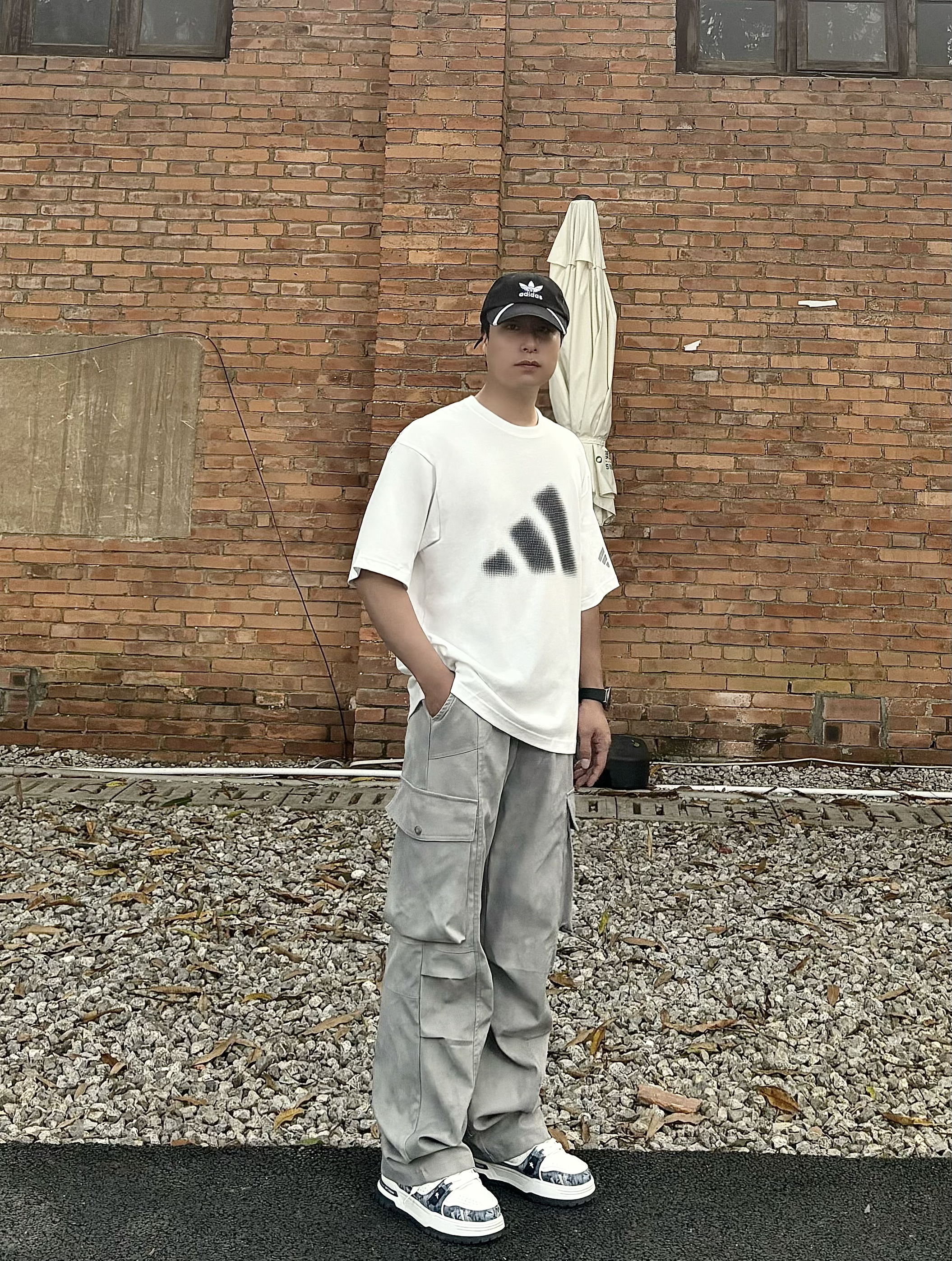 夏天男生穿搭,松弛感才是顶流! 阿迪宽松白T,点阵渐变logo设计感拉满💕宽松版型不挑身材 做旧灰工装阔腿裤👖垂感满分,藏肉显瘦,走路带风🔥 黑白板鞋+棒球帽,整套穿搭简单干净😎不费力就很帅! citywalk、约会、日常通勤都能穿,懒人直接一套出门📸轻松拿捏夏日松弛感🌻男生夏天穿搭直接抄作业!