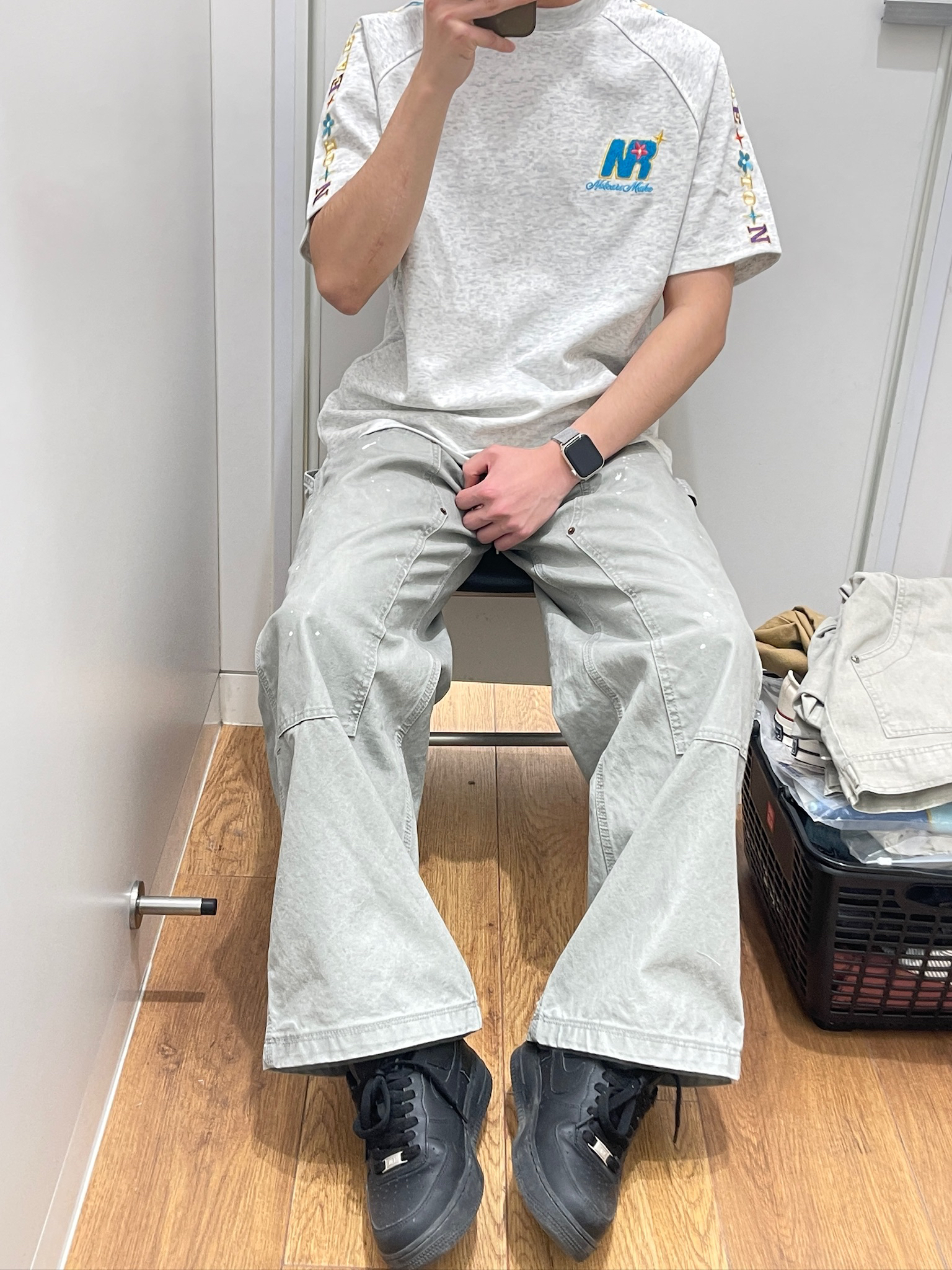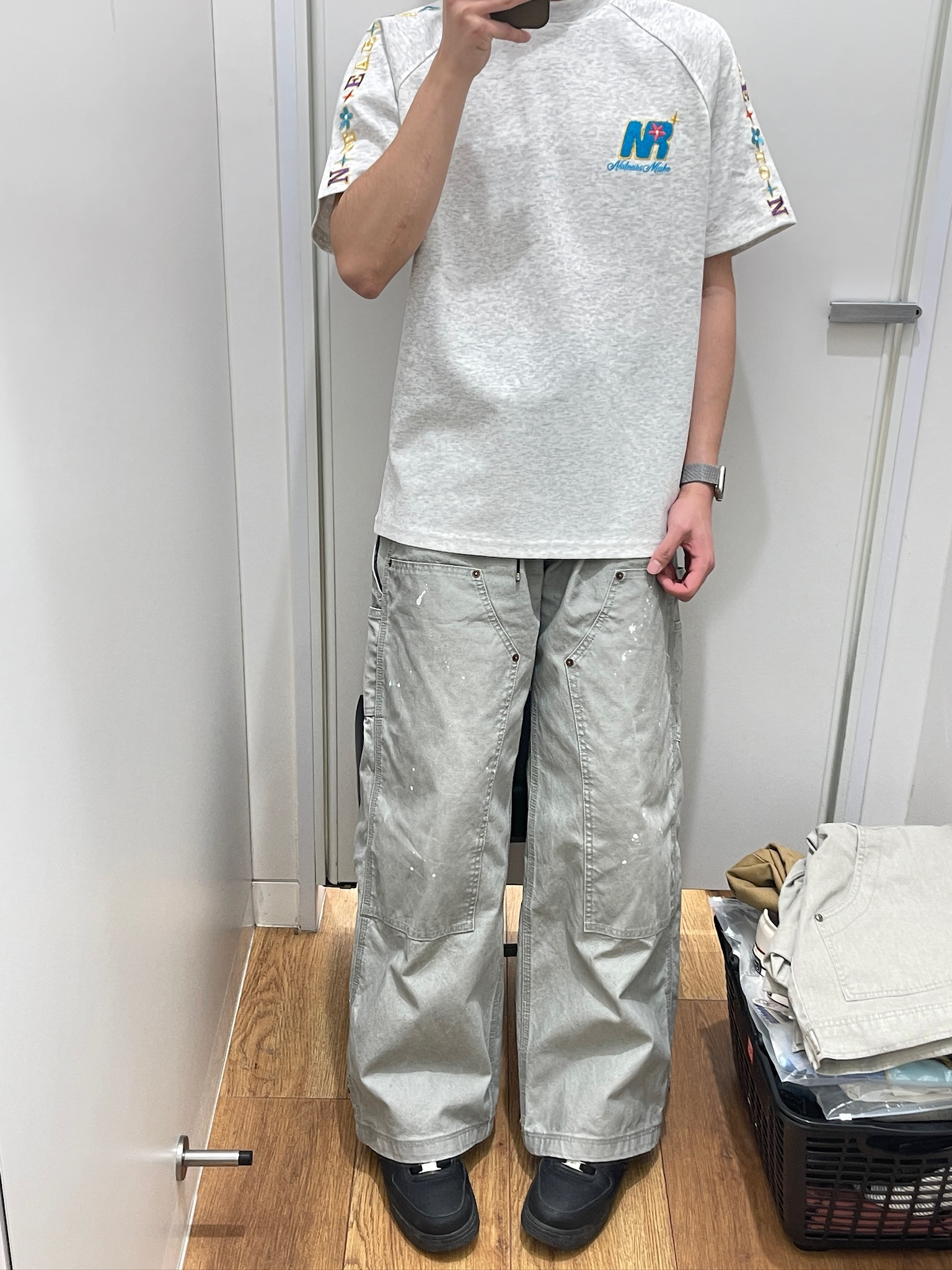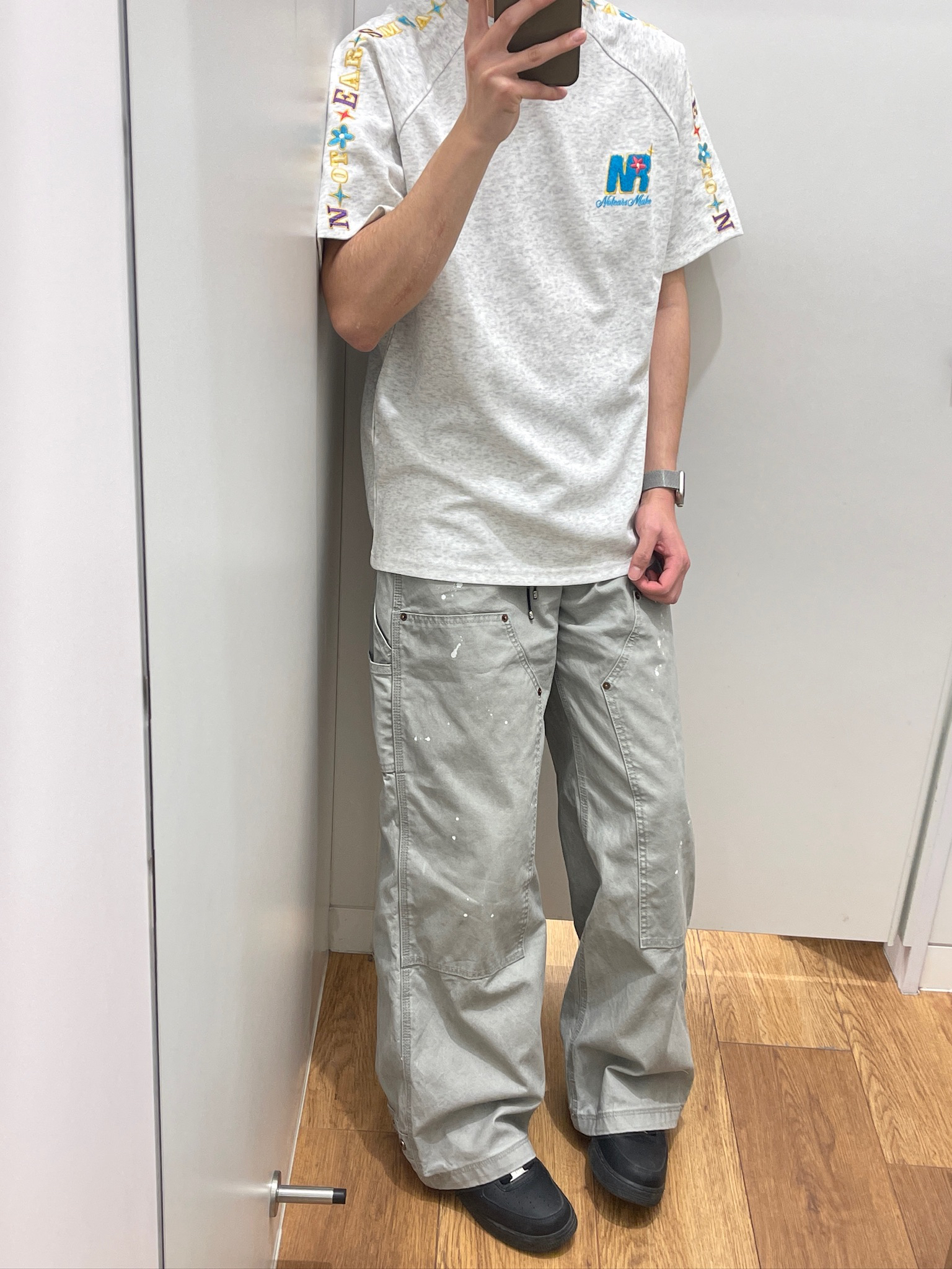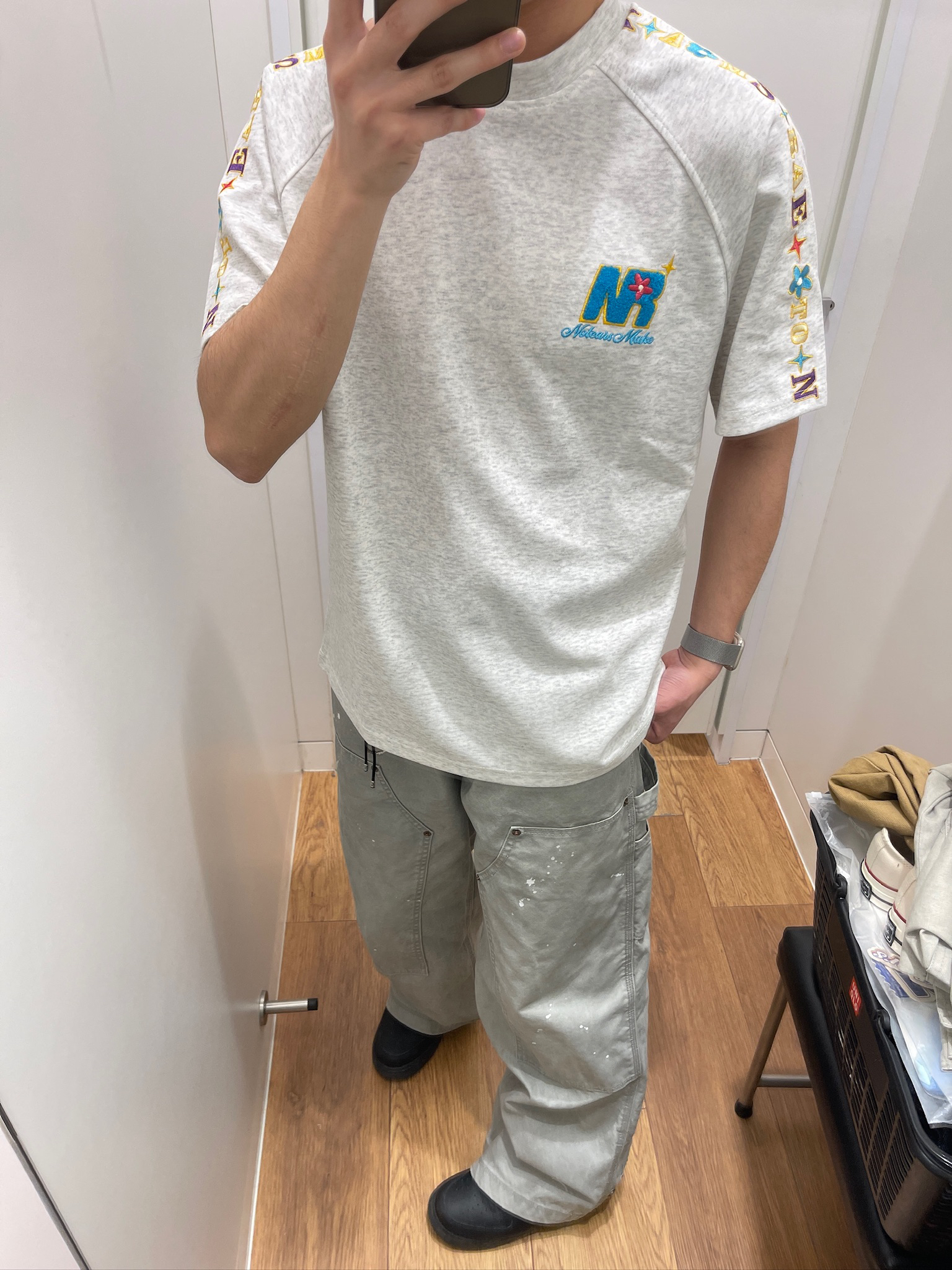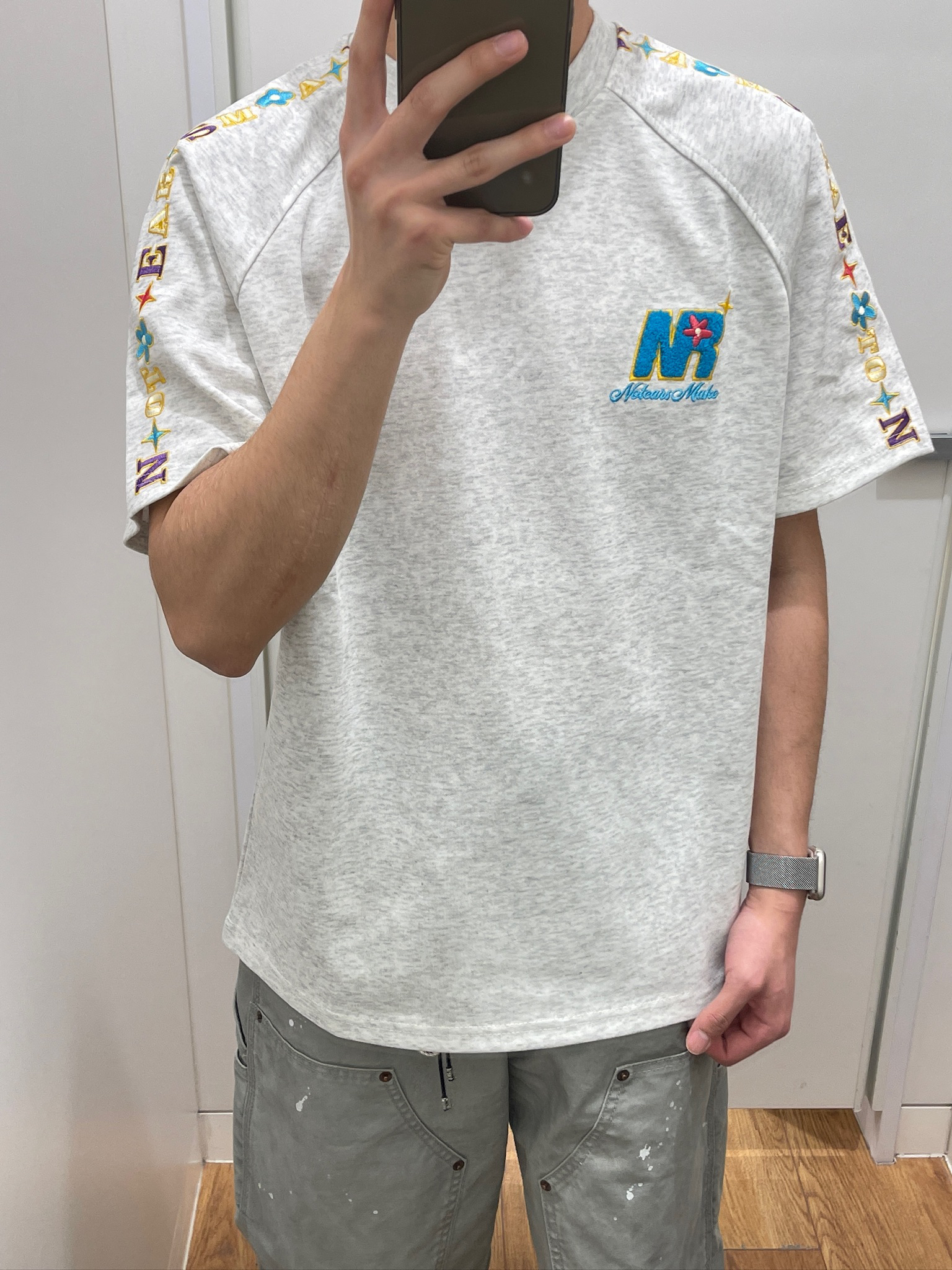 今天这套就是我夏天常穿的舒服搭配!这件浅灰T恤拿到手就觉得面料软乎乎的,贴身穿不闷汗,花灰色也很耐脏。手臂的彩色刺绣是小亮点,不夸张但又不会像普通白T那么单调,配我的工装裤刚好,日常出门随便一套就很清爽,完全不用费脑想搭配~😌
