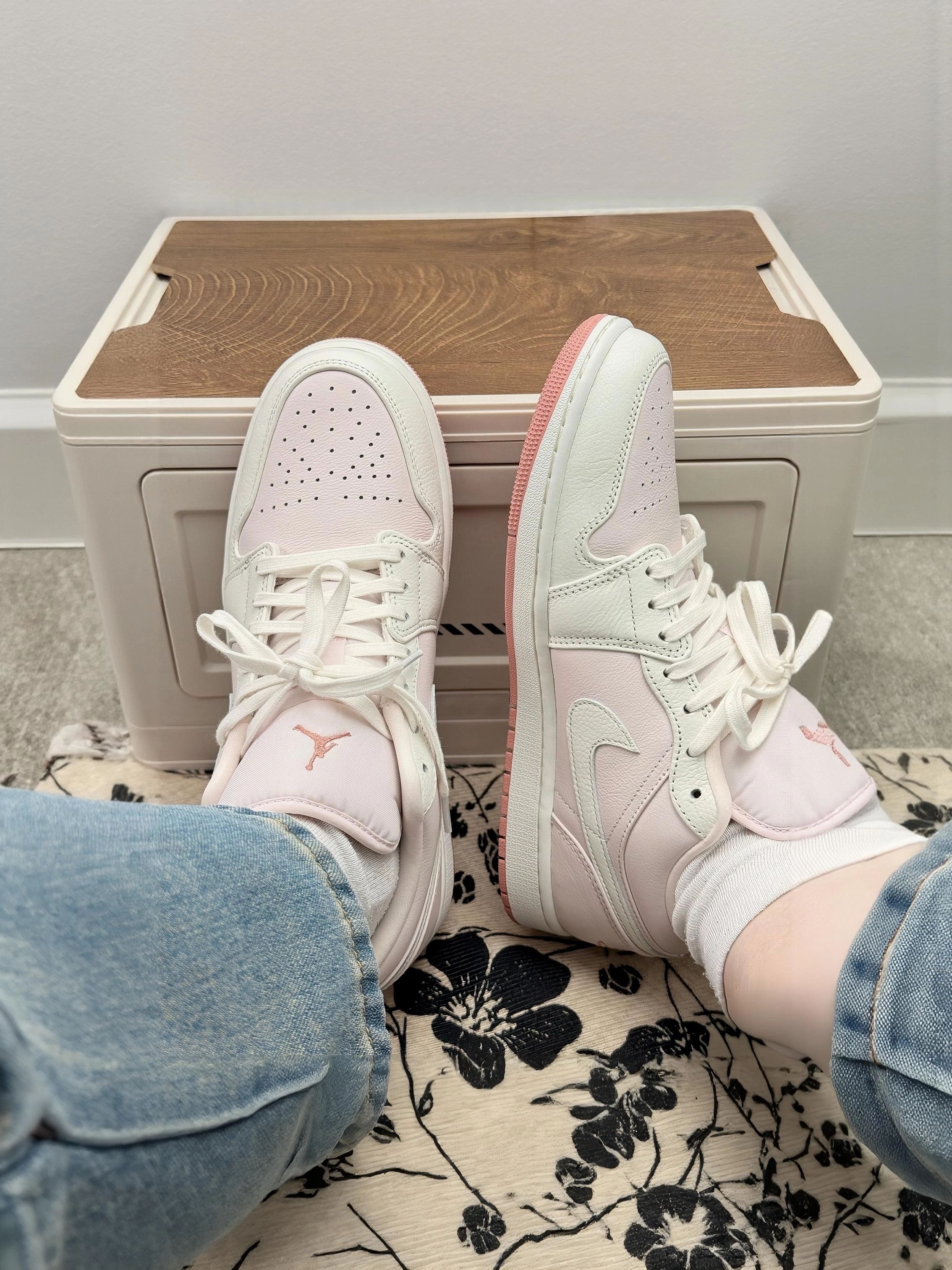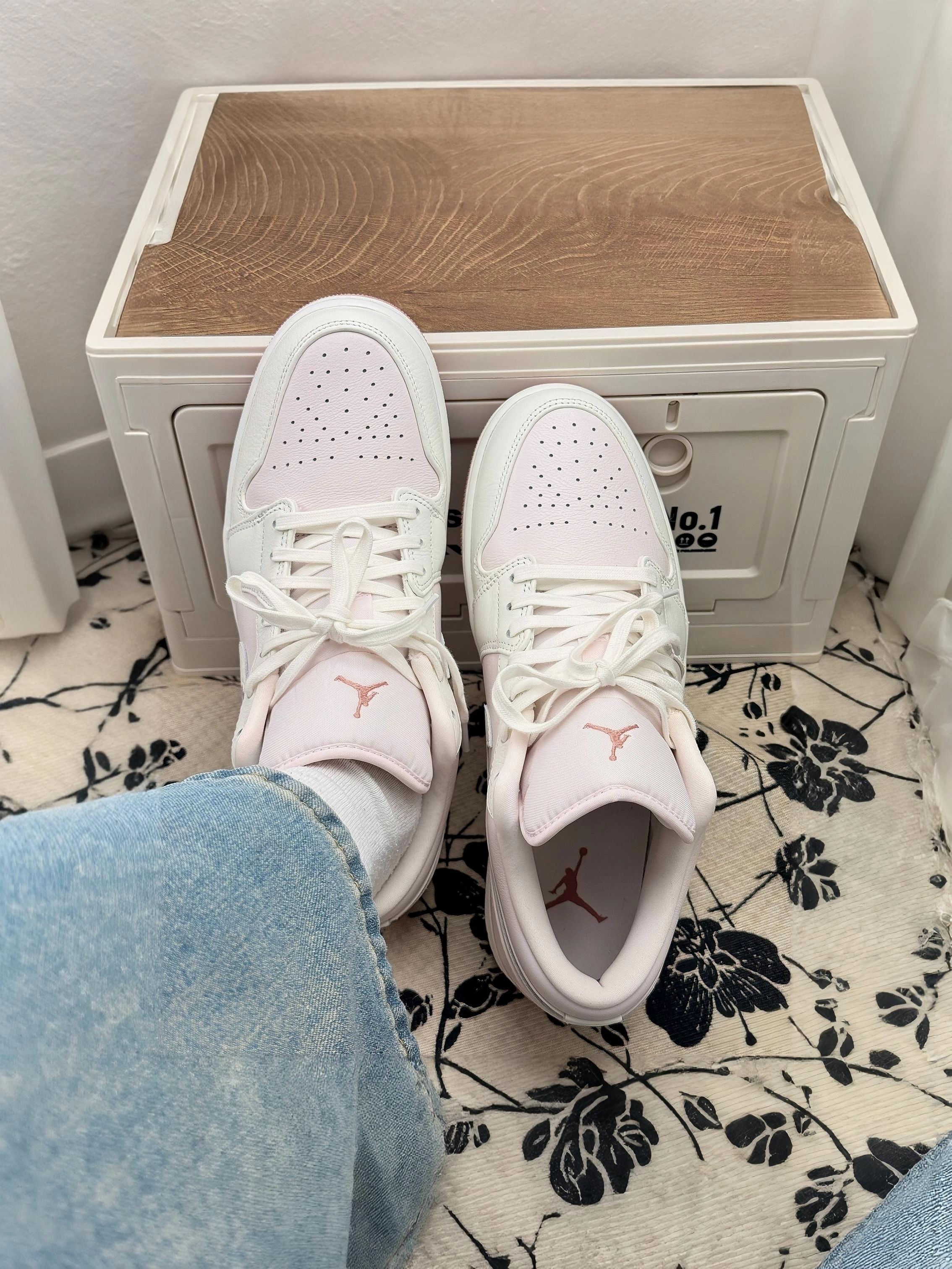 上脚这双樱花粉AJ1 Low有阵子了,说点实在的感受🌸。脚感就是基础款的水平,不软不硬,日常走路没什么问题,久站的话前掌会有点闷,毕竟是皮革材质的鞋面。鞋型偏窄,宽脚的话得选大半码,我正常码数穿,脚趾处会有点挤🥲。颜值确实戳我,浅粉拼白很温柔,搭配牛仔裤、运动裤都不违和,细节处的粉色刺绣也很精致。但鞋边的白色部分特别容易沾灰,得经常擦,鞋底的粉色橡胶也容易蹭黑,打理起来有点麻烦。整体来说,就是一...