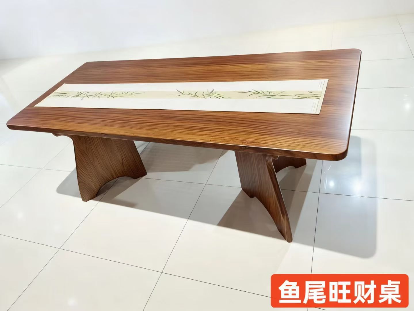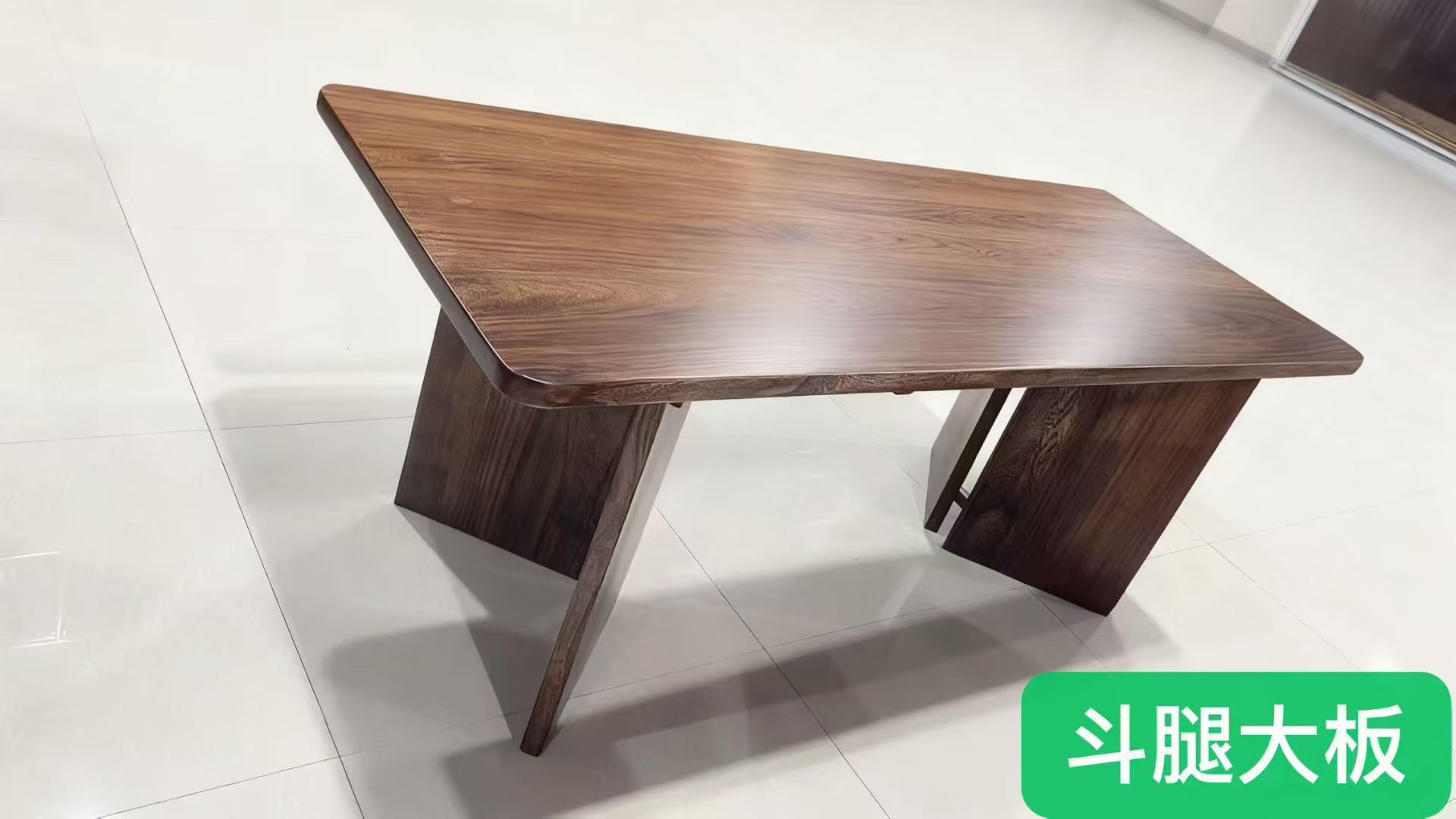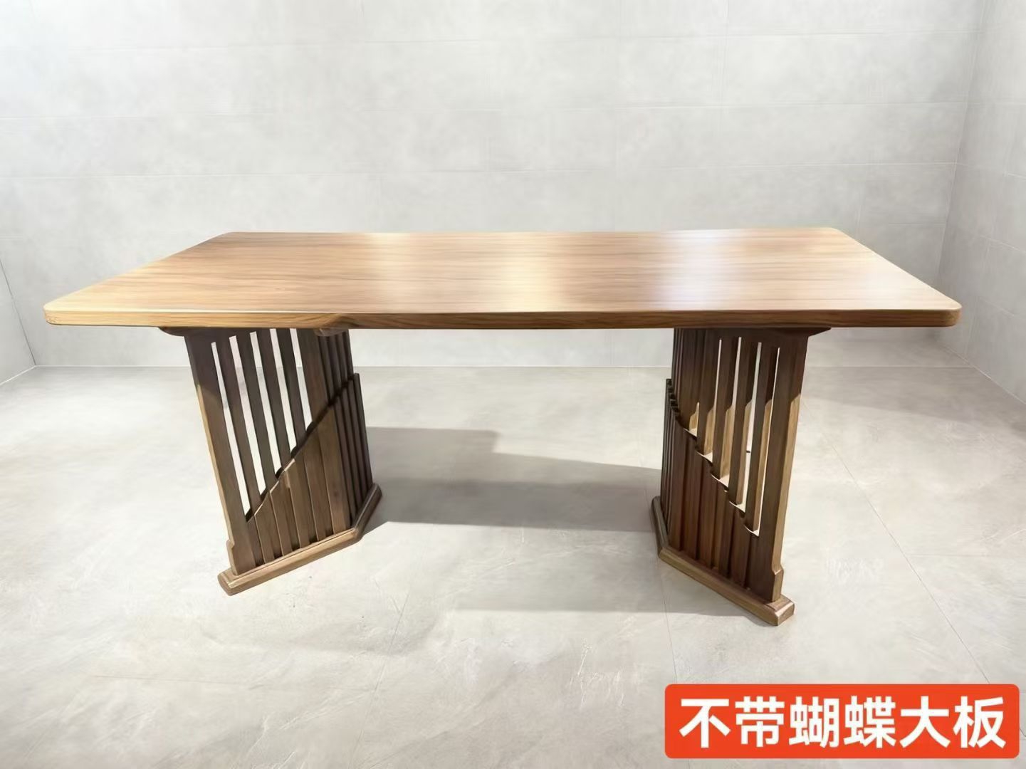 款式名称:斗腿大板(也常被称作“斗腿桌”或“回腿大板”),是实木大板桌中极具辨识度的一款造型。 - 视觉特征:桌腿采用了方正厚实的斗型结构,图片中桌腿呈宽底座、向内收分的造型,视觉上稳重敦厚,与常规的直腿、叉腿大板有明显区别。 - 桌面工艺:桌面为整板或直拼工艺,纹理清晰可见,边缘做了圆角打磨,触感更温润安全;表面光泽度高,且带有环保漆层保护。 🪵 材质与工艺 - 木材推测:从深褐色的纹理...
