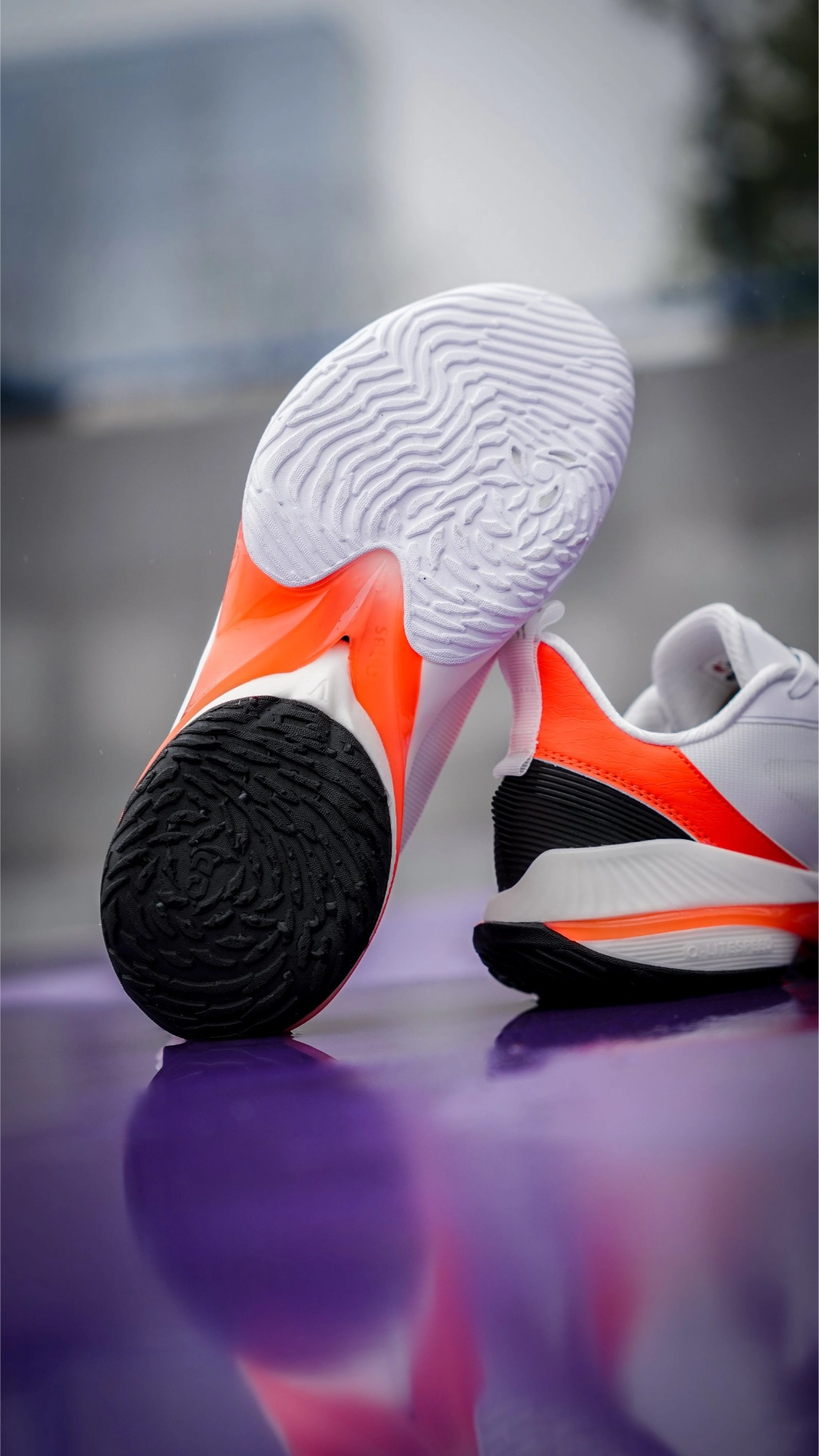 之前给兄弟们分享过FE4.0,这双TEAM版本颜值我觉得一点不输啊~同样是超跑外观设计,侧面FE字母图案设计很有速度感,这个配色橙色的点缀也是很吸睛的。 这双鞋我体验下来,很适合夏季外场实战。一来外底前后分离橡胶很硬,打外场耐磨扛得住,二来鞋面透气性很不错又有加固,强度够用。中底咻轻速缓震极限我觉得180斤以下问题不大。整体性价比我觉得挺高的~