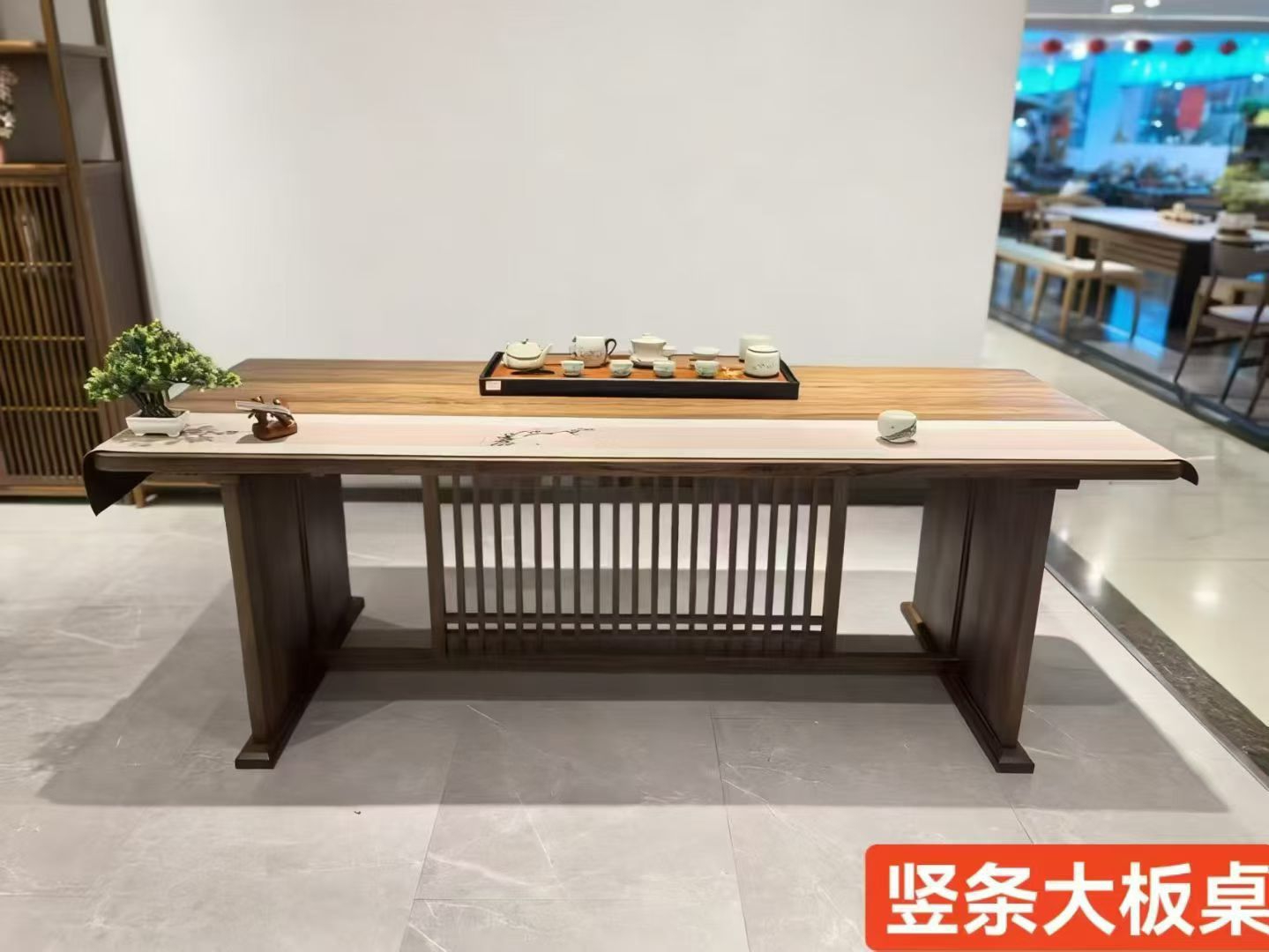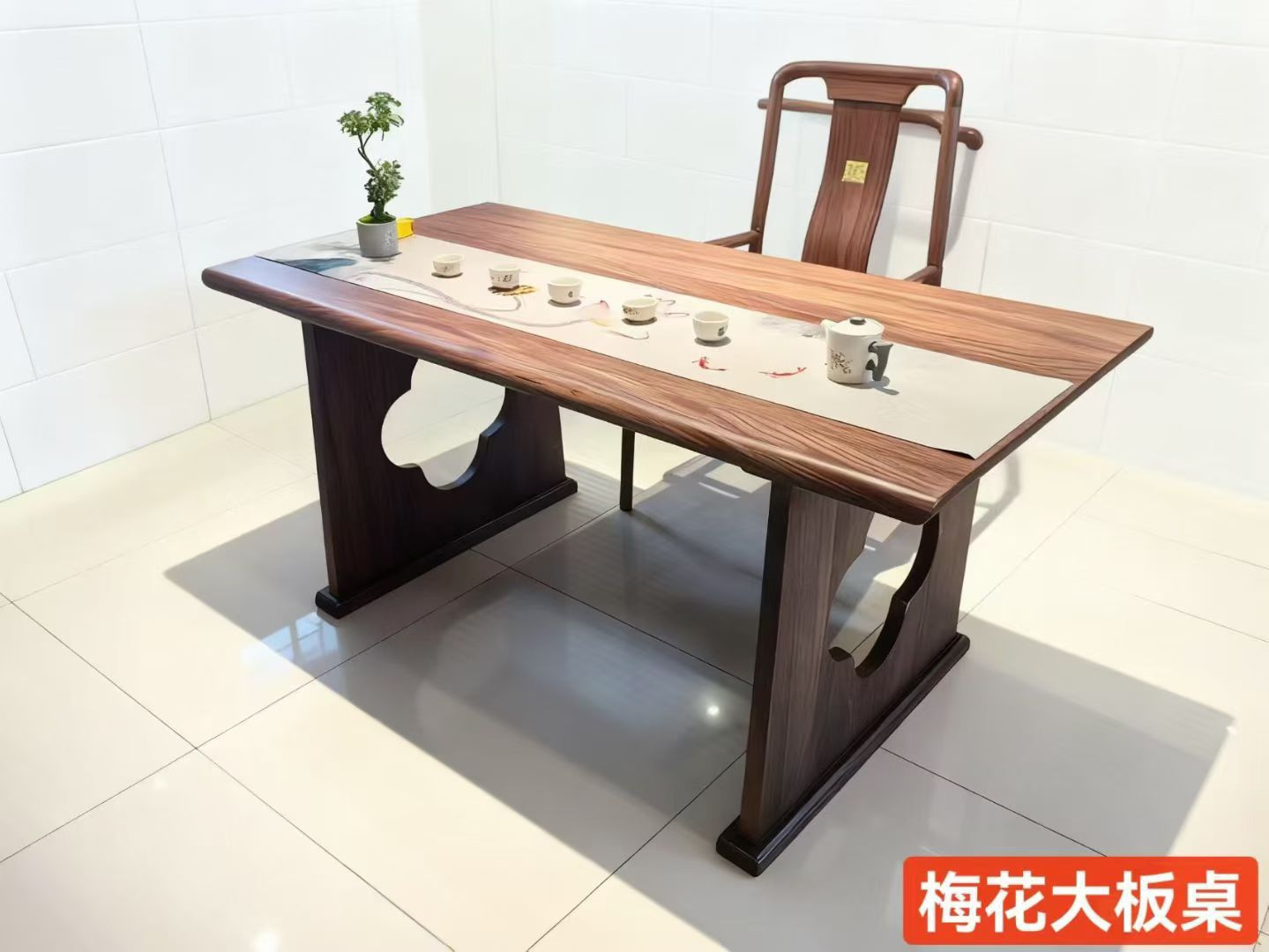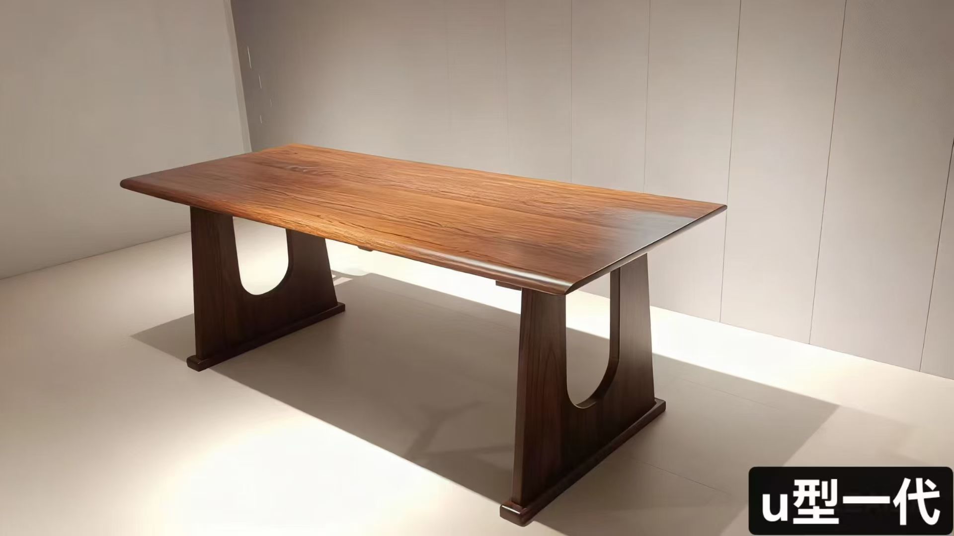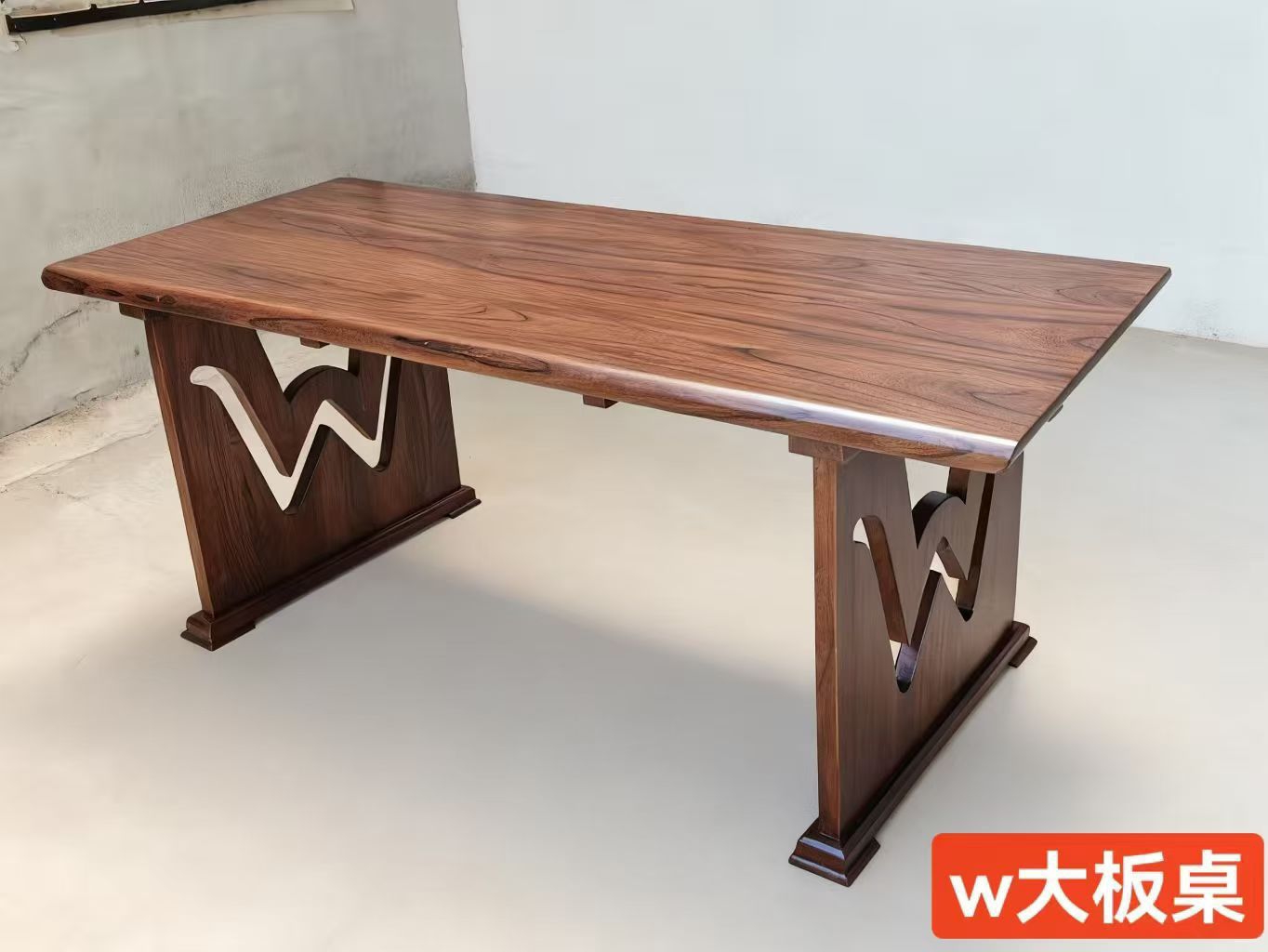 - 款式名称:实木大板桌中极具辨识度的一款造型。 - 视觉特征:桌腿采用了方正厚实的斗型结构,图片中桌腿呈宽底座、向内收分的造型,视觉上稳重敦厚,与常规的直腿、叉腿大板有明显区别。 - 桌面工艺:桌面为整板工艺,纹理清晰可见,边缘做了圆角打磨,触感更温润安全;表面光泽度高,且带有环保漆层保护。 🪵 材质与工艺 - 从深褐色的纹理和质感来看,是胡桃木类(美黑胡桃或南美胡桃木)或高品质的乌金木...