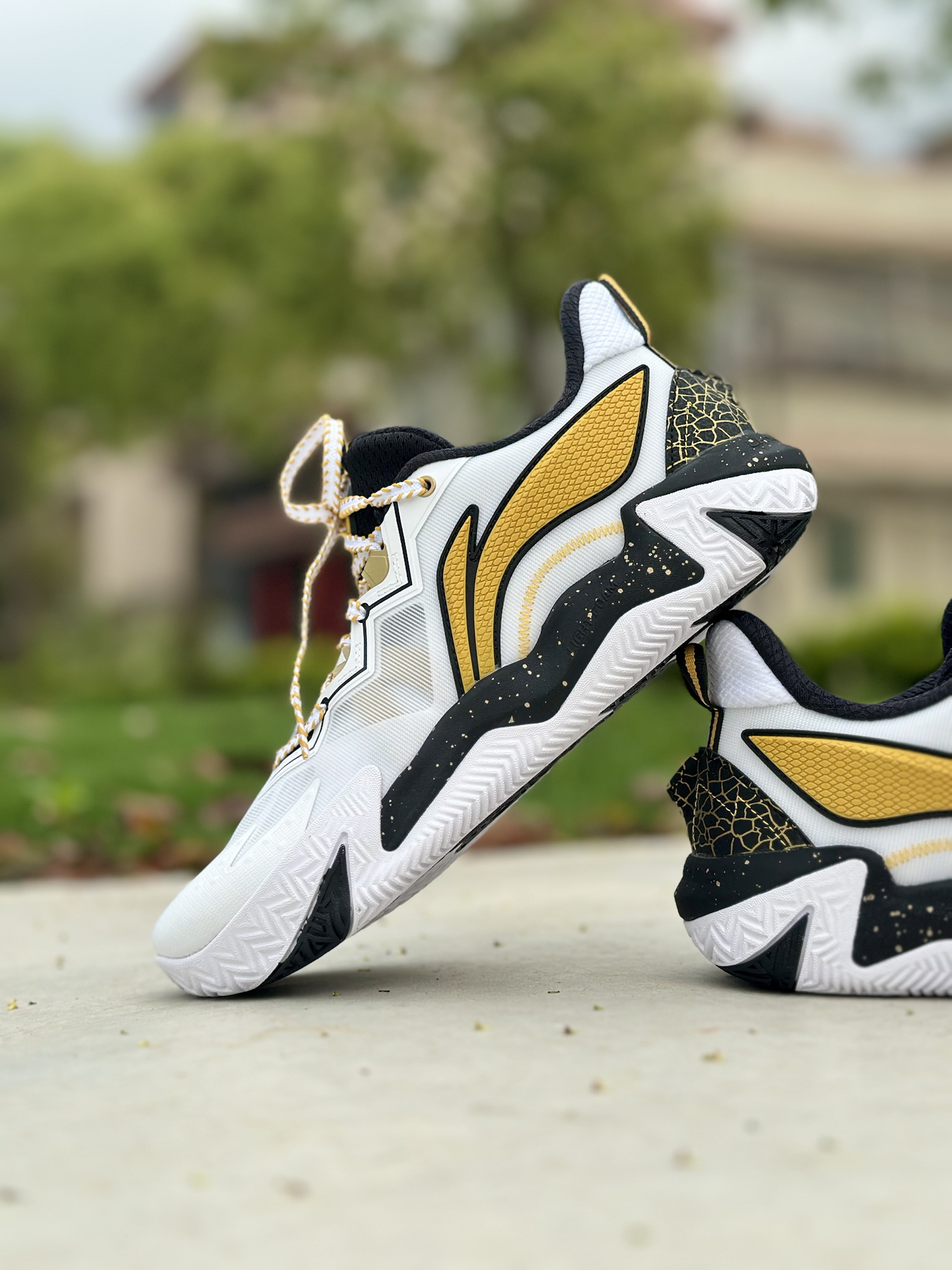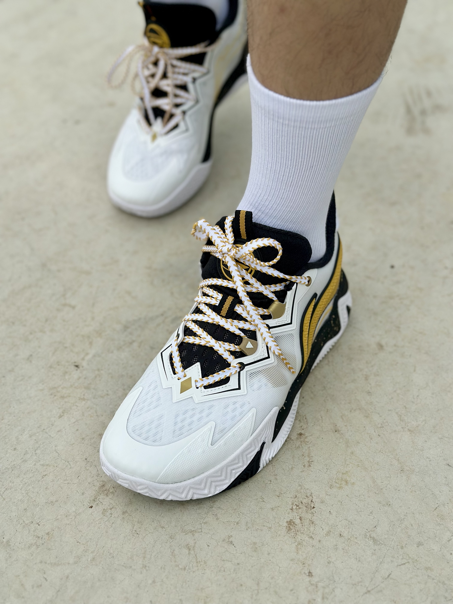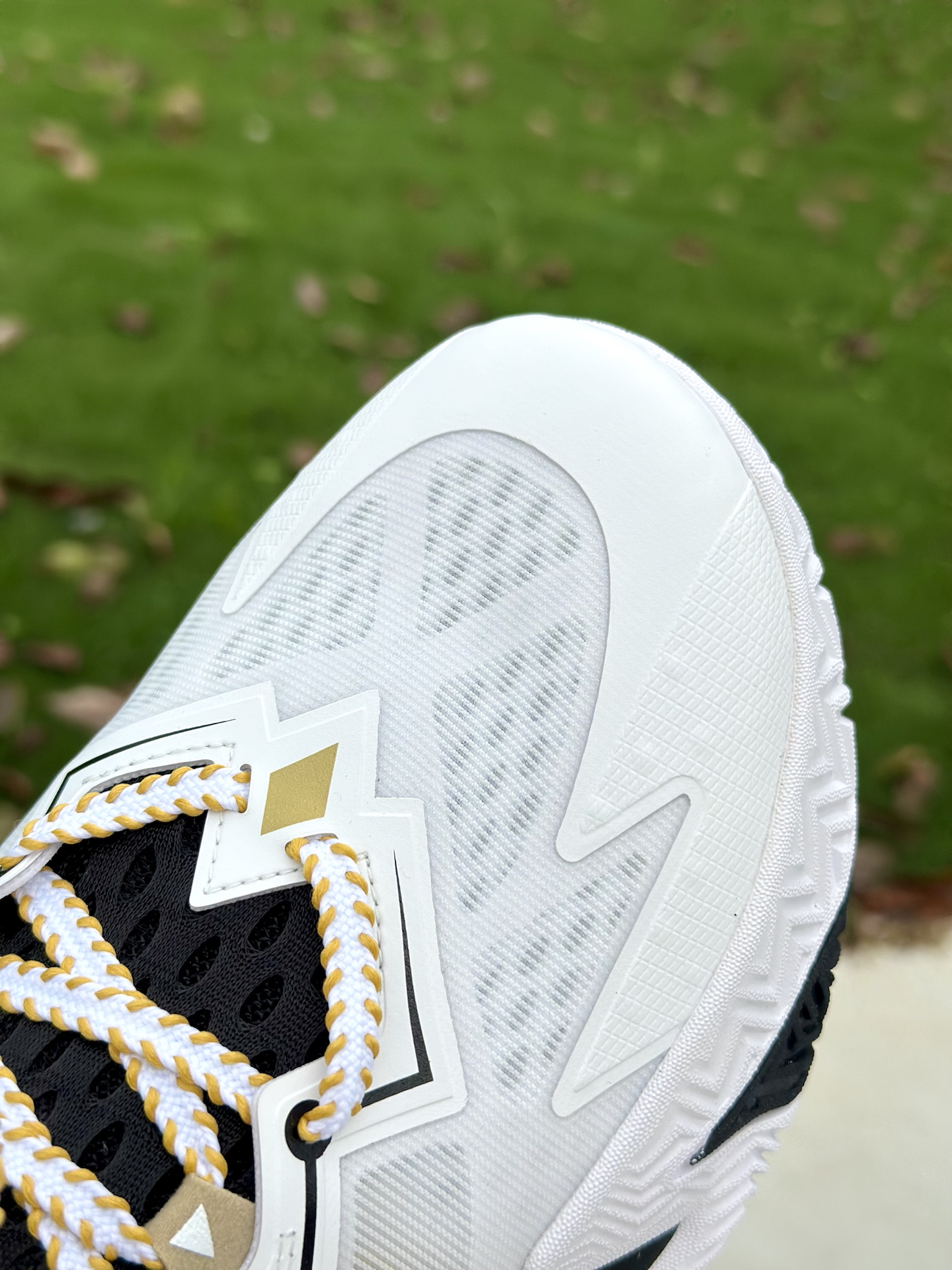 李宁儿童疆域2这款白金黑的配色球鞋确实非常有质感,黑金点缀显得大气 鞋身侧面的李宁LOGO采用了金色描边,鞋带采用了白黄相间的编织设计,增加了层次感和精致度✅ 搭载李宁常用的轻量发泡中底,脚感偏弹韧,跑跳训练都ok