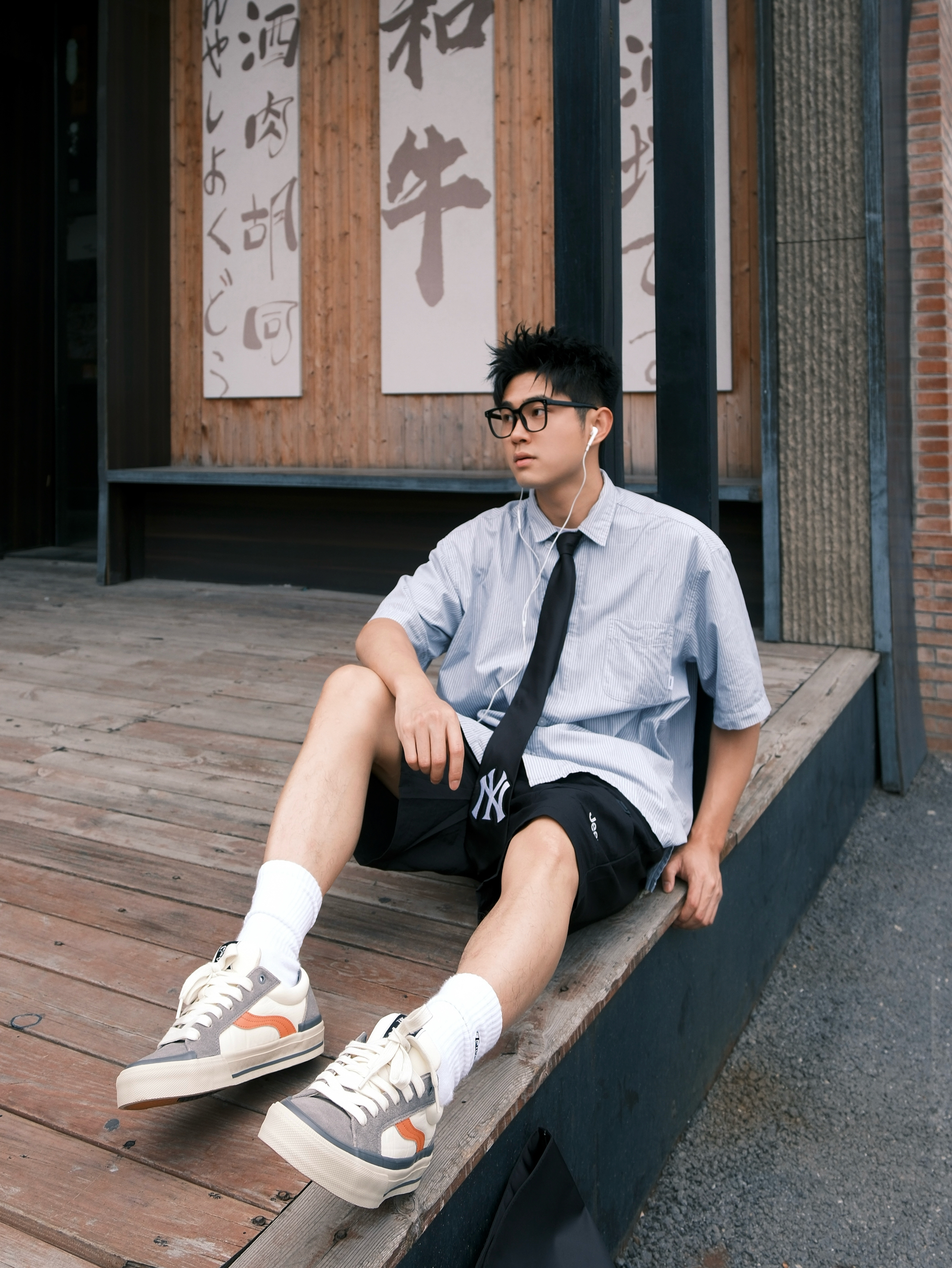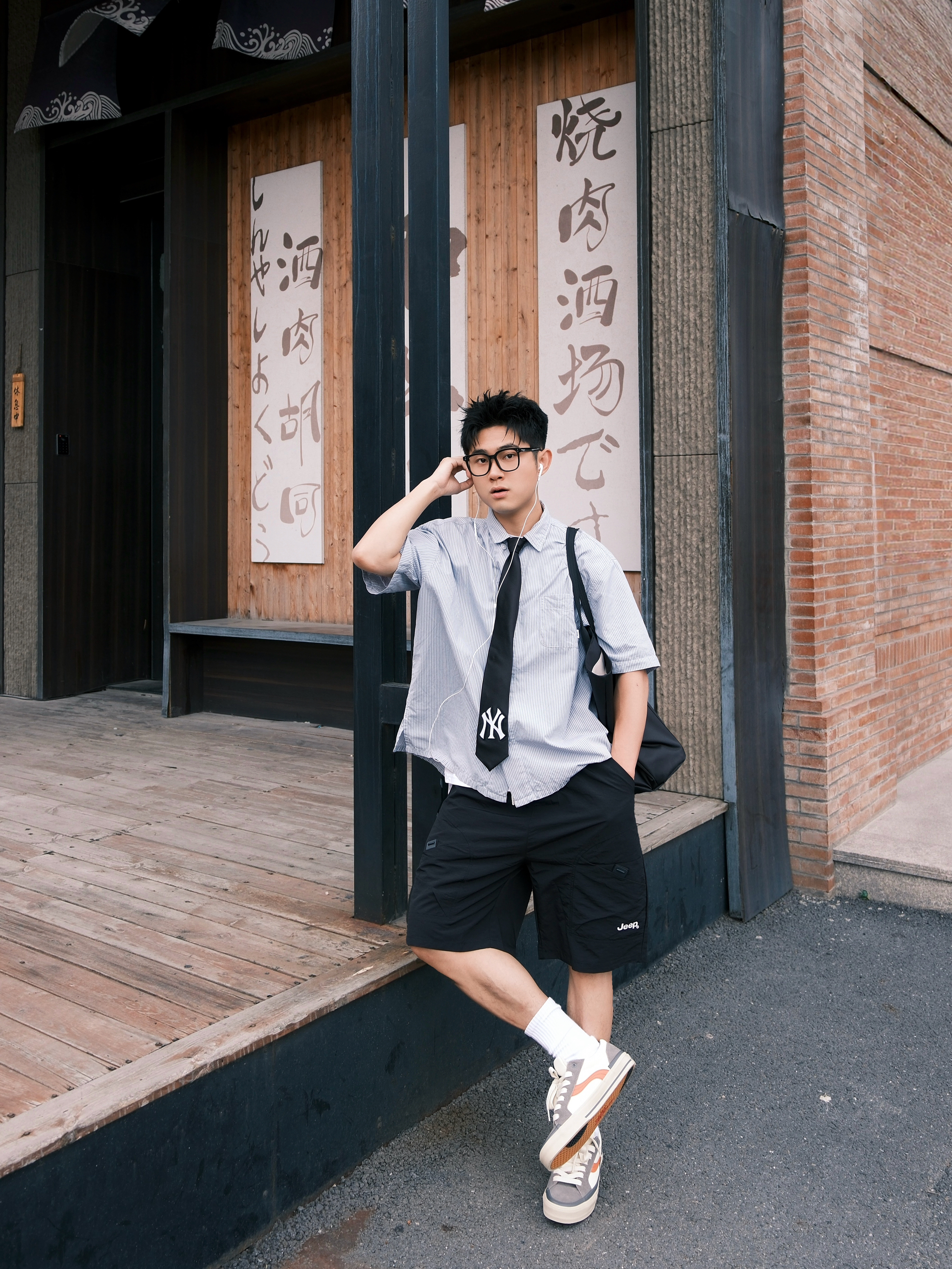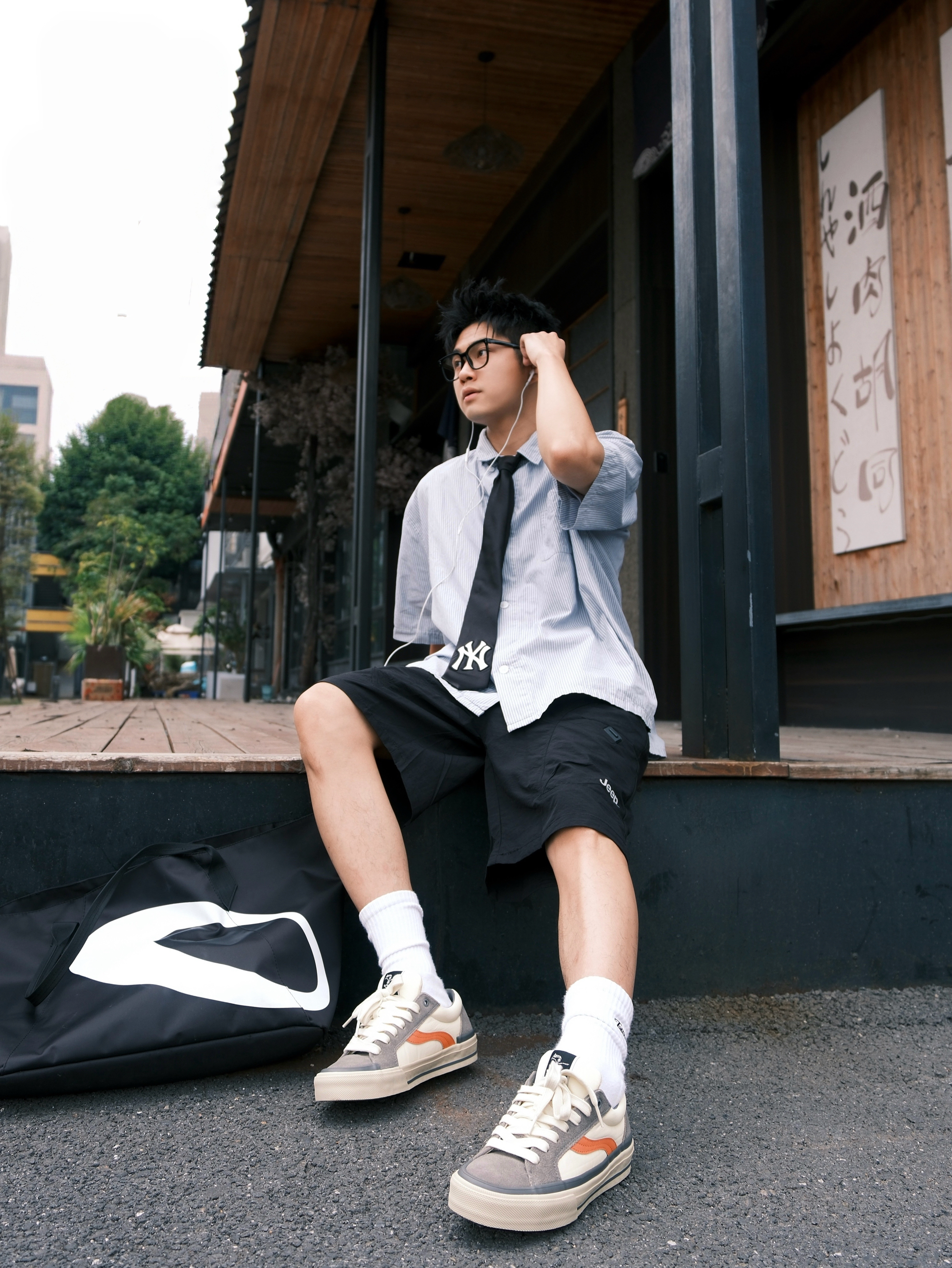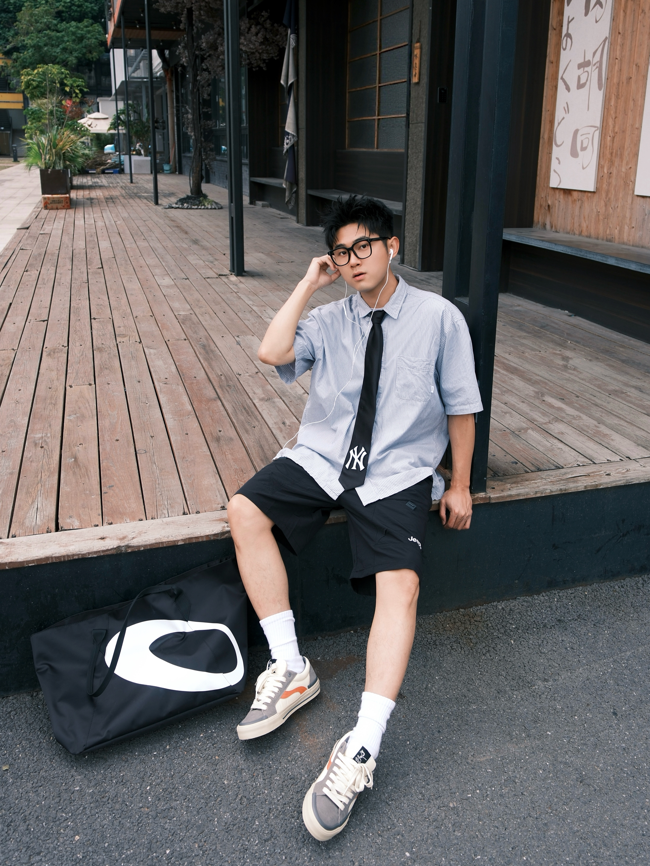 最近好像犯了春困💤 一整天都懒洋洋的不想动弹 今天下午天气不会太闷热,出门溜溜 ~ 蓝色条纹衫简直就是少年感利器 上身干净又减龄,内搭件白T就OK 打条领带点缀一下还挺加分 裤子是黑色的户外工装短裤 再上脚这双拼色街头板鞋 一整个日系少年感轻松拿捏咯