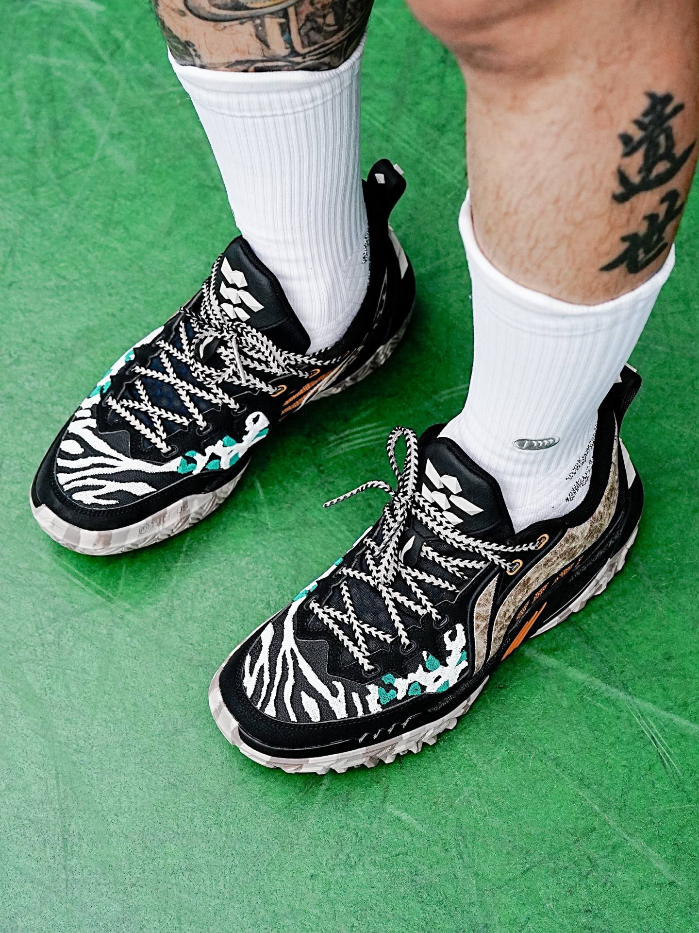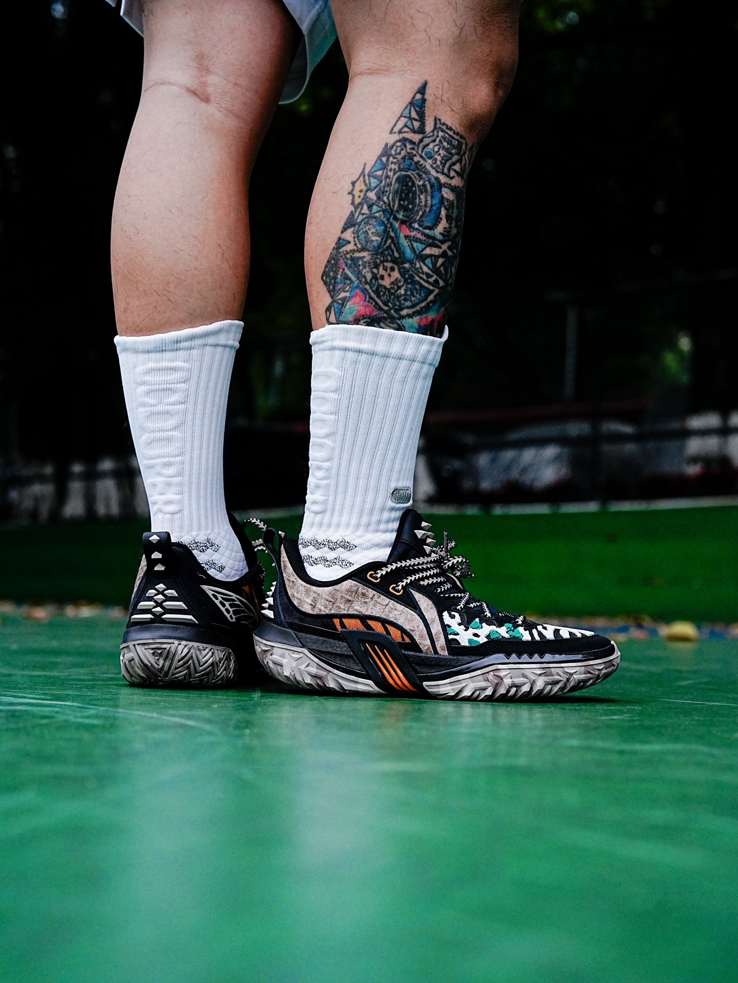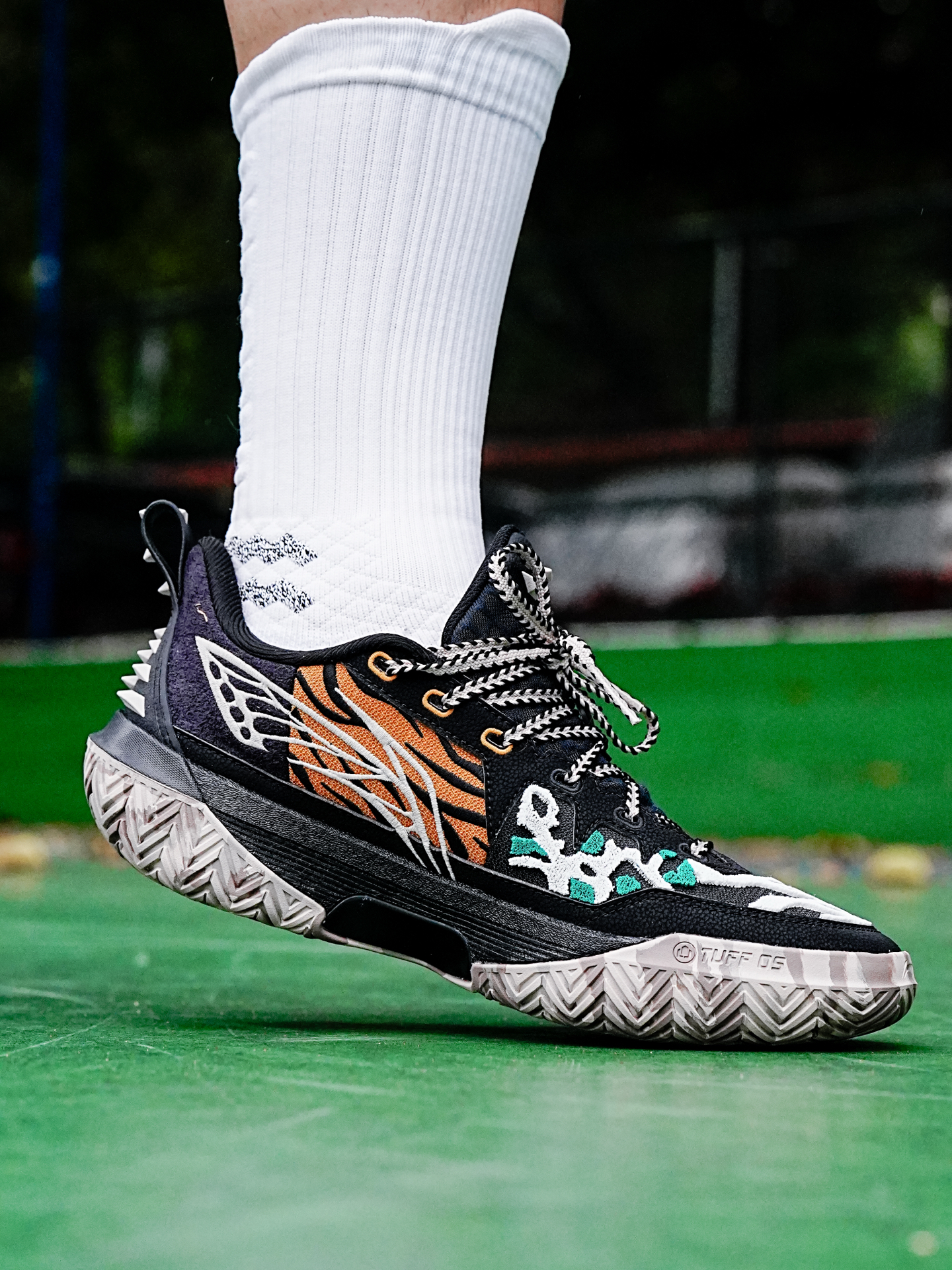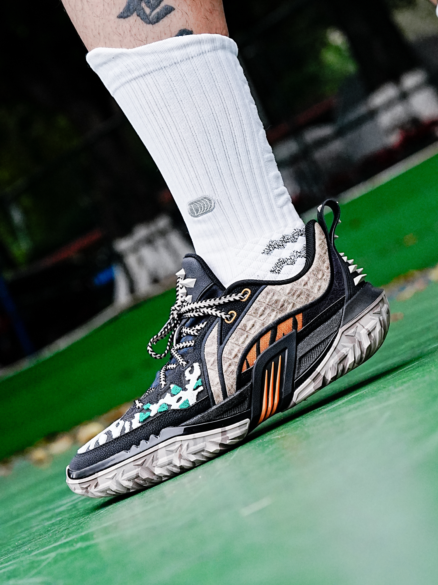 李宁的桀骜也是外场野兽的代表,今天分享的这个桀骜3还是万兽之王主题配色,粗犷的鞋型加上动物图案的设计,配色花里胡哨,真的很有辨识度。 这一代桀骜依旧是非常适合打外场的鞋子,在水泥地实战止滑耐磨都很足够,偶尔穿这个到室内场实战也没有问题,码数的话按照正常入即可。