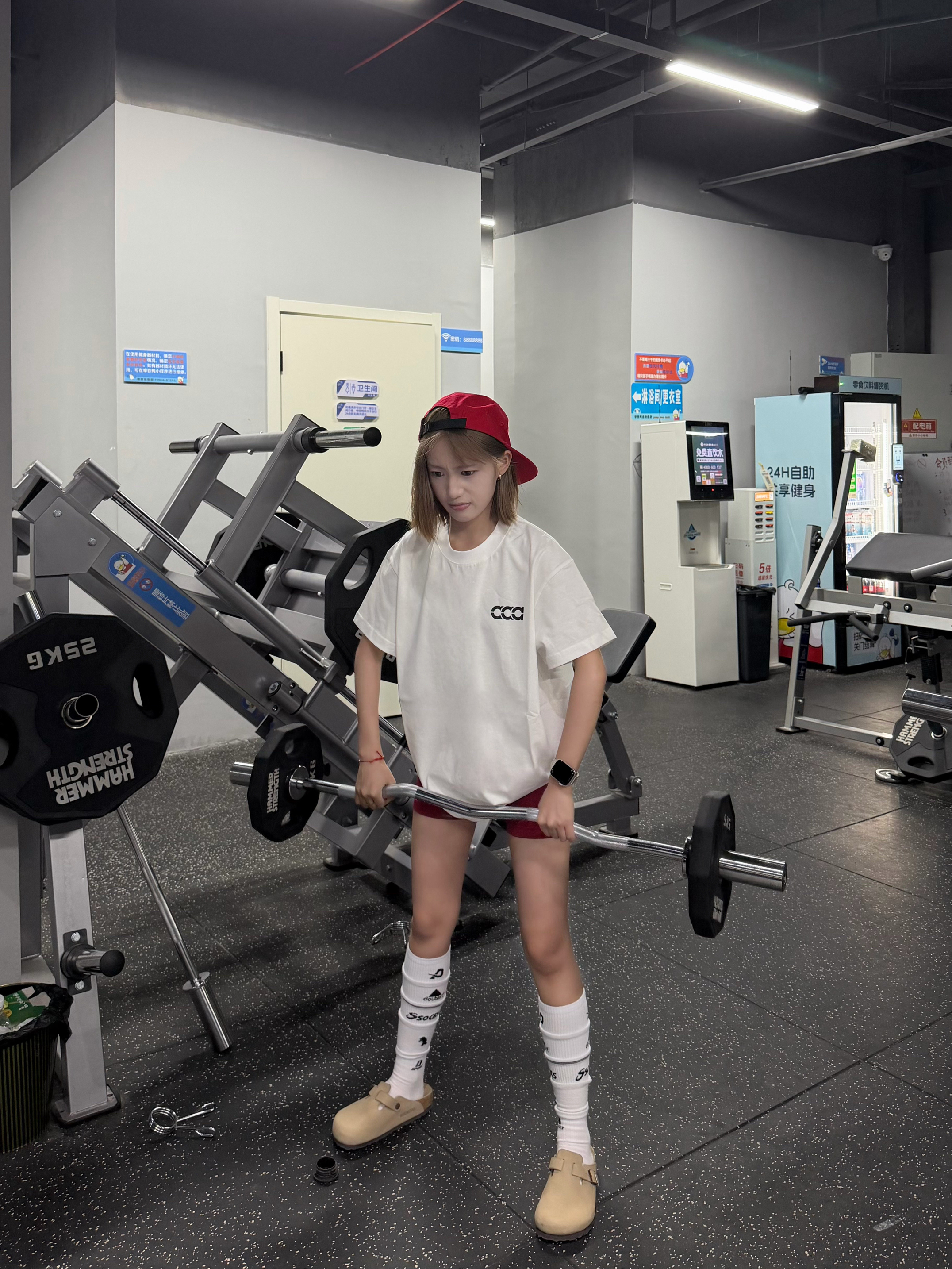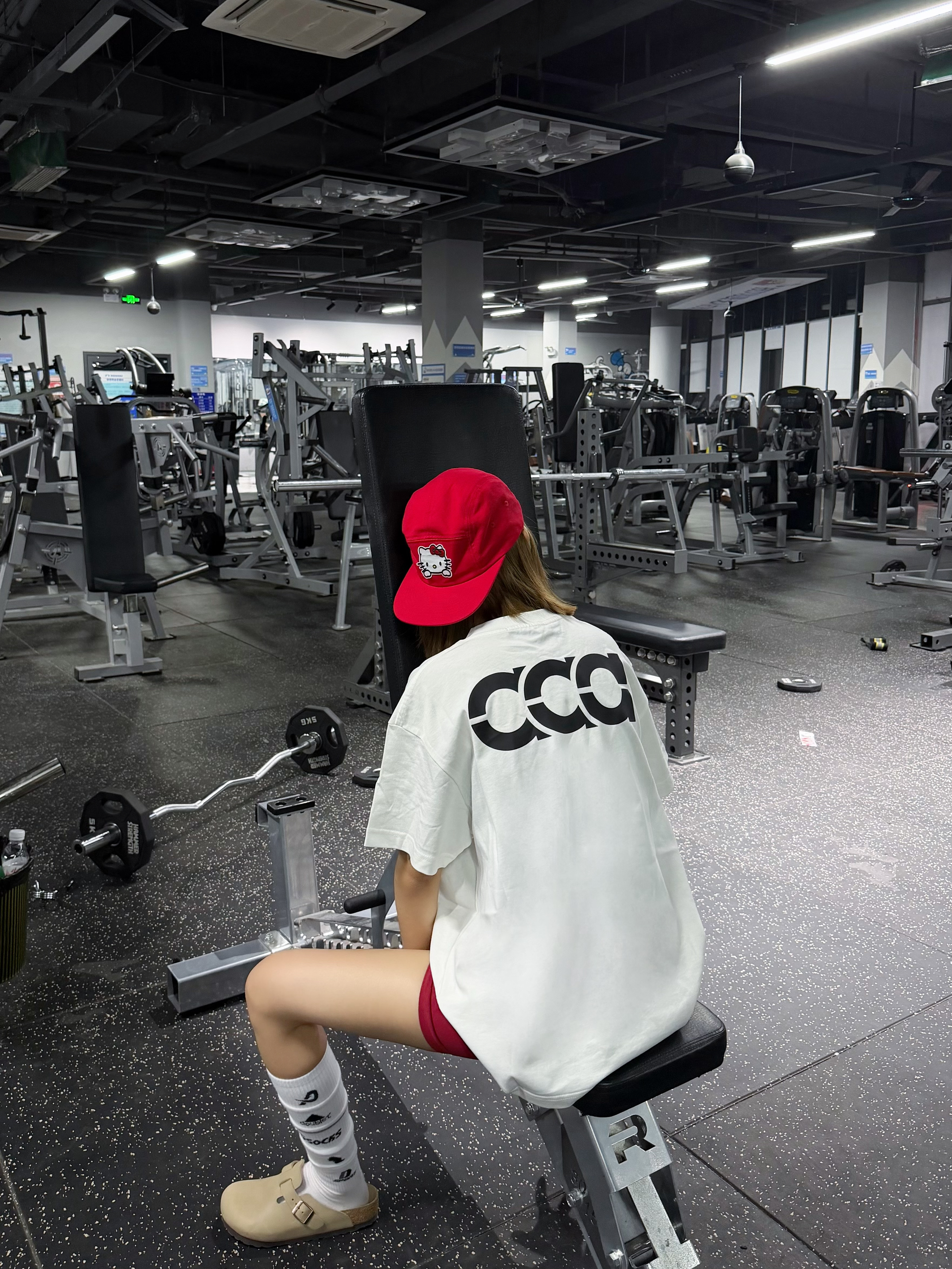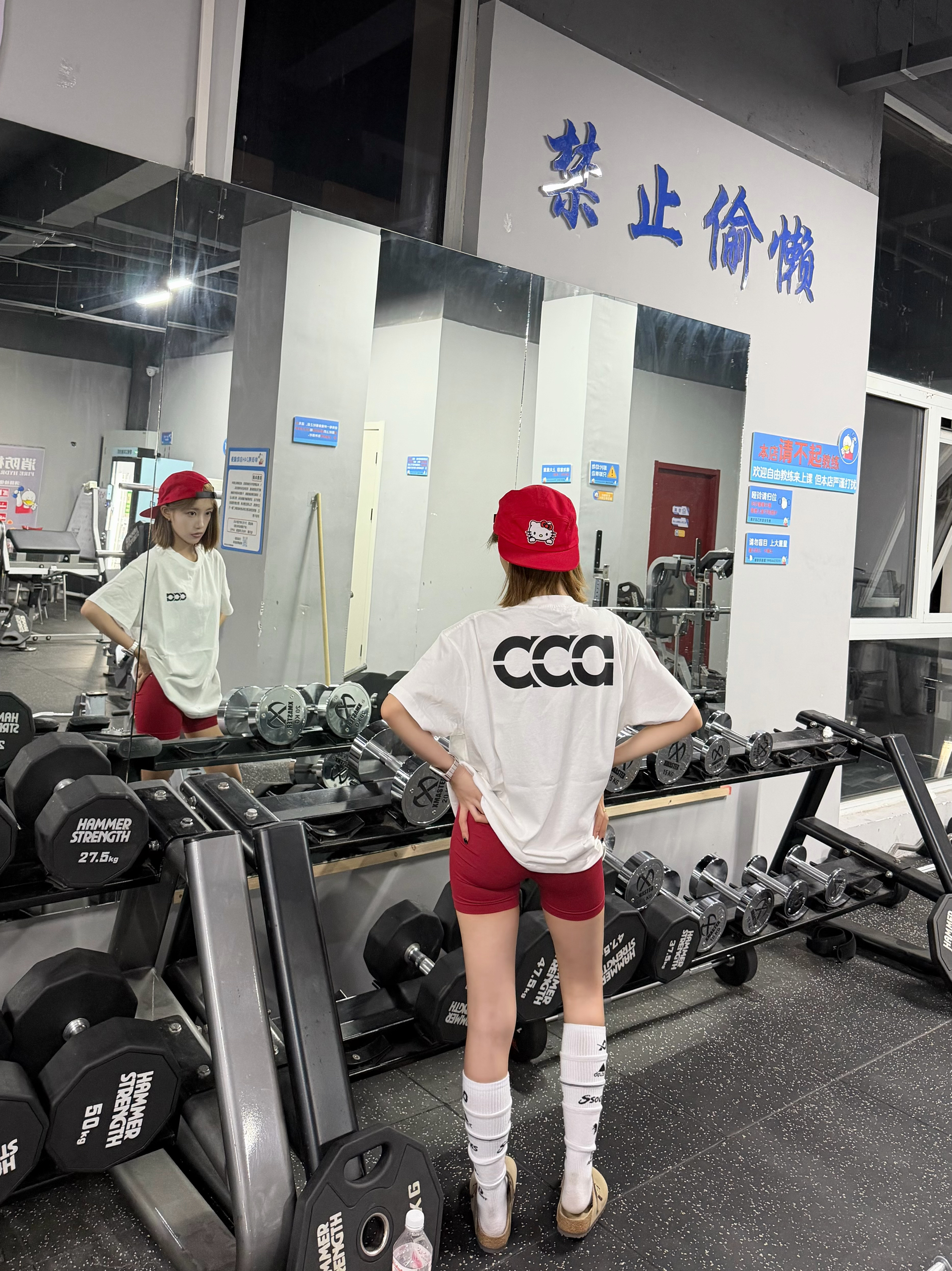 谁懂啊!这件白T直接把健身氛围感拉满了! 宽松版型藏肉又显肩线,背后字母印花超有设计感,搭酒红骑行裤+堆堆袜,甜酷感直接拉满。 HelloKitty红帽更是点睛之笔,健身也要做最靓的崽,练完拍照直接出片!