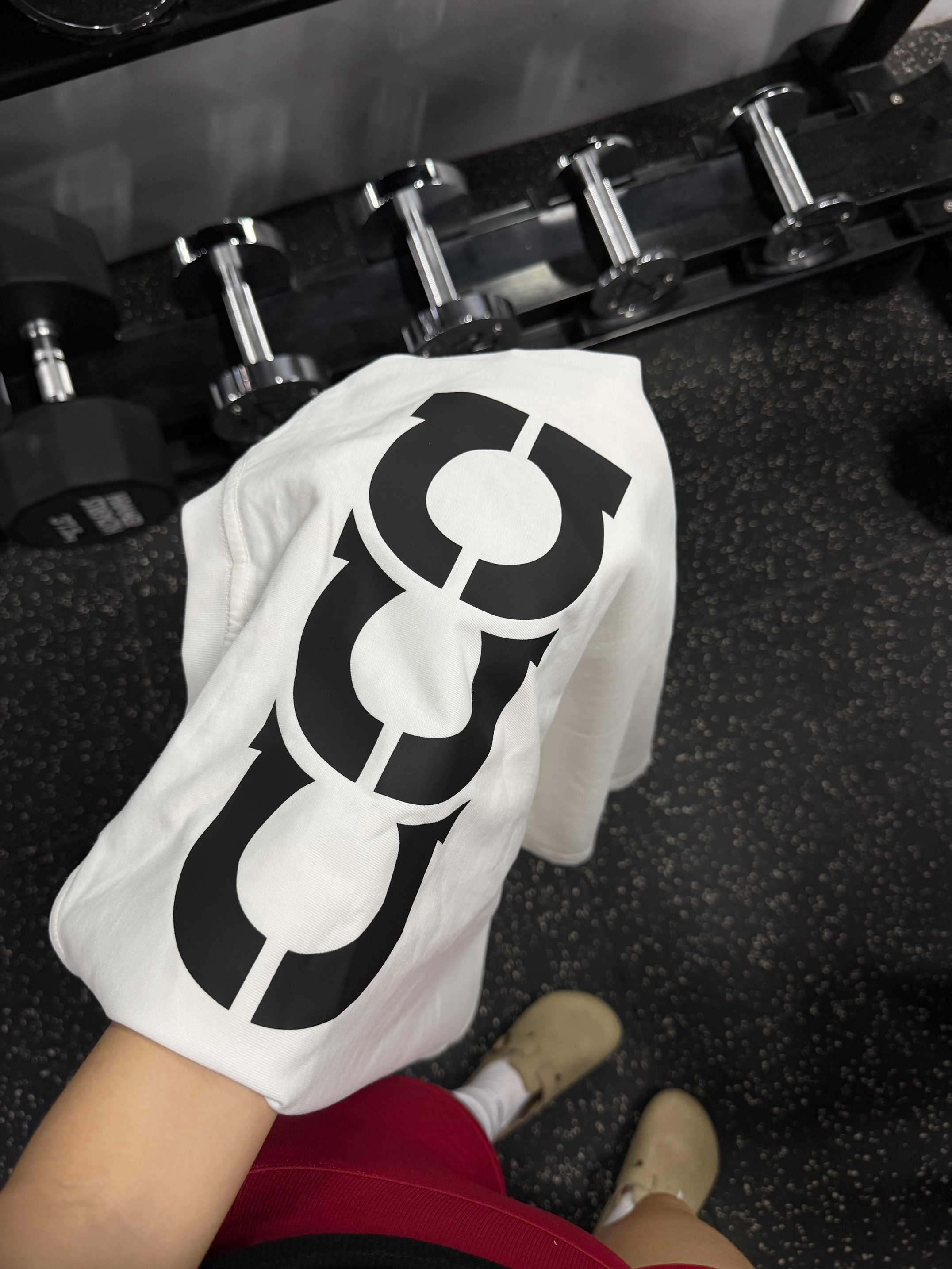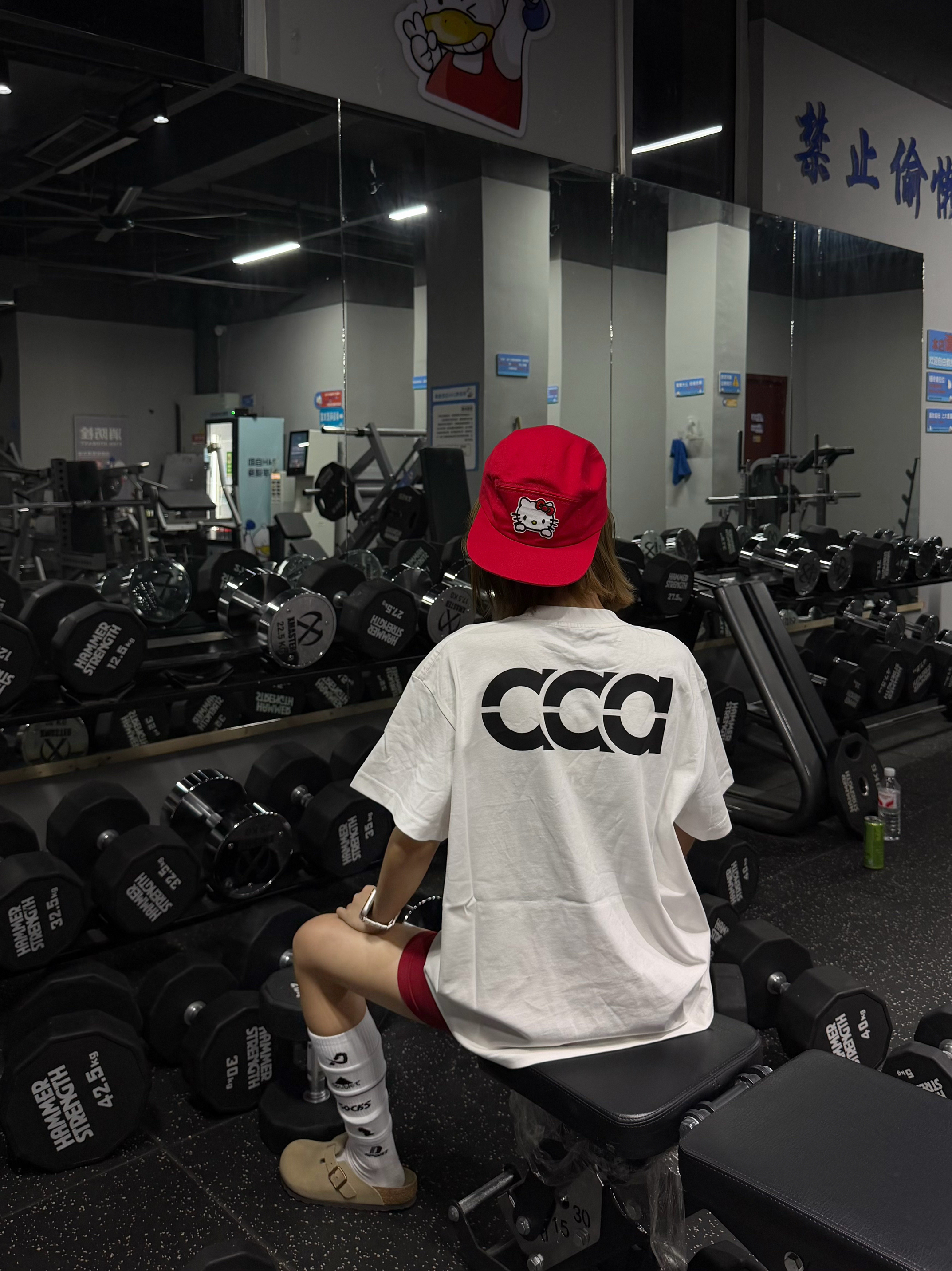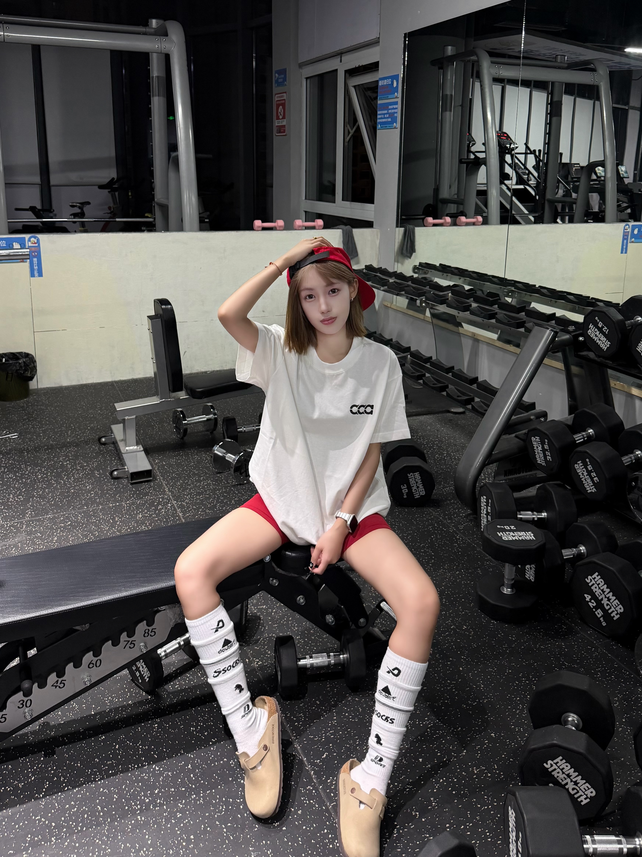 谁懂啊!这件白T直接把健身氛围感拉满了! 宽松版型藏肉又显肩线,背后字母印花超有设计感,搭酒红骑行裤+堆堆袜,甜酷感直接拉满。 HelloKitty红帽更是点睛之笔,健身也要做最靓的崽,练完拍照直接出片!