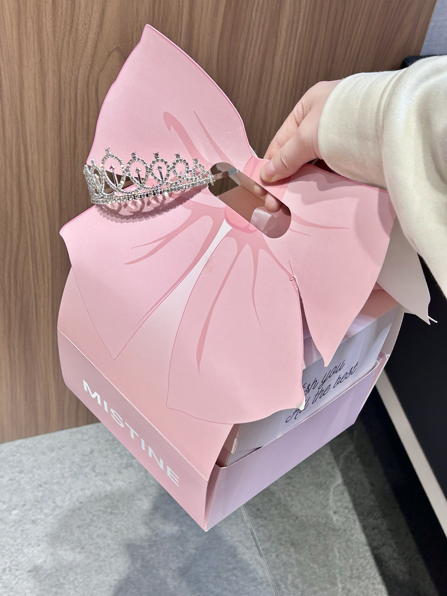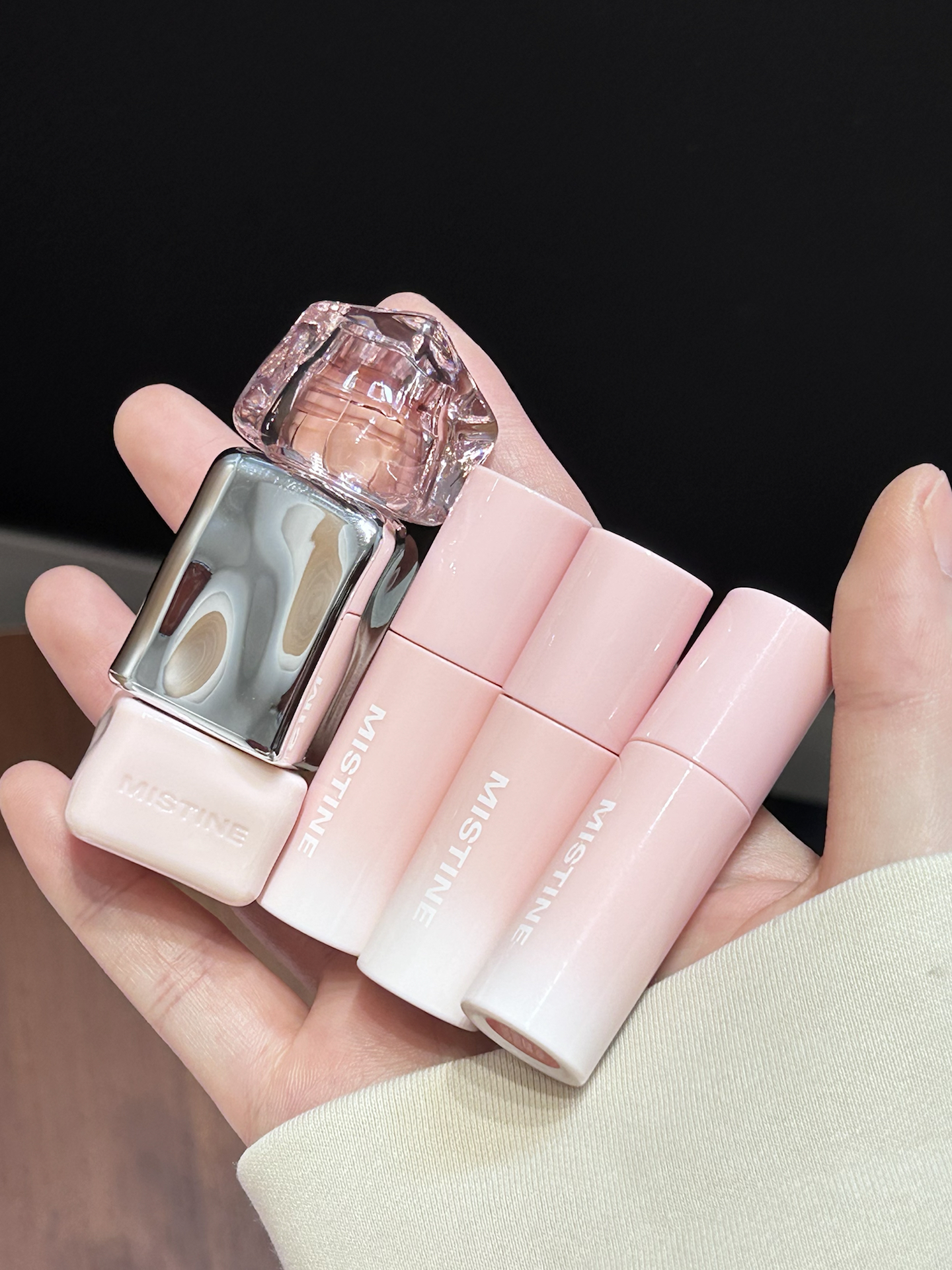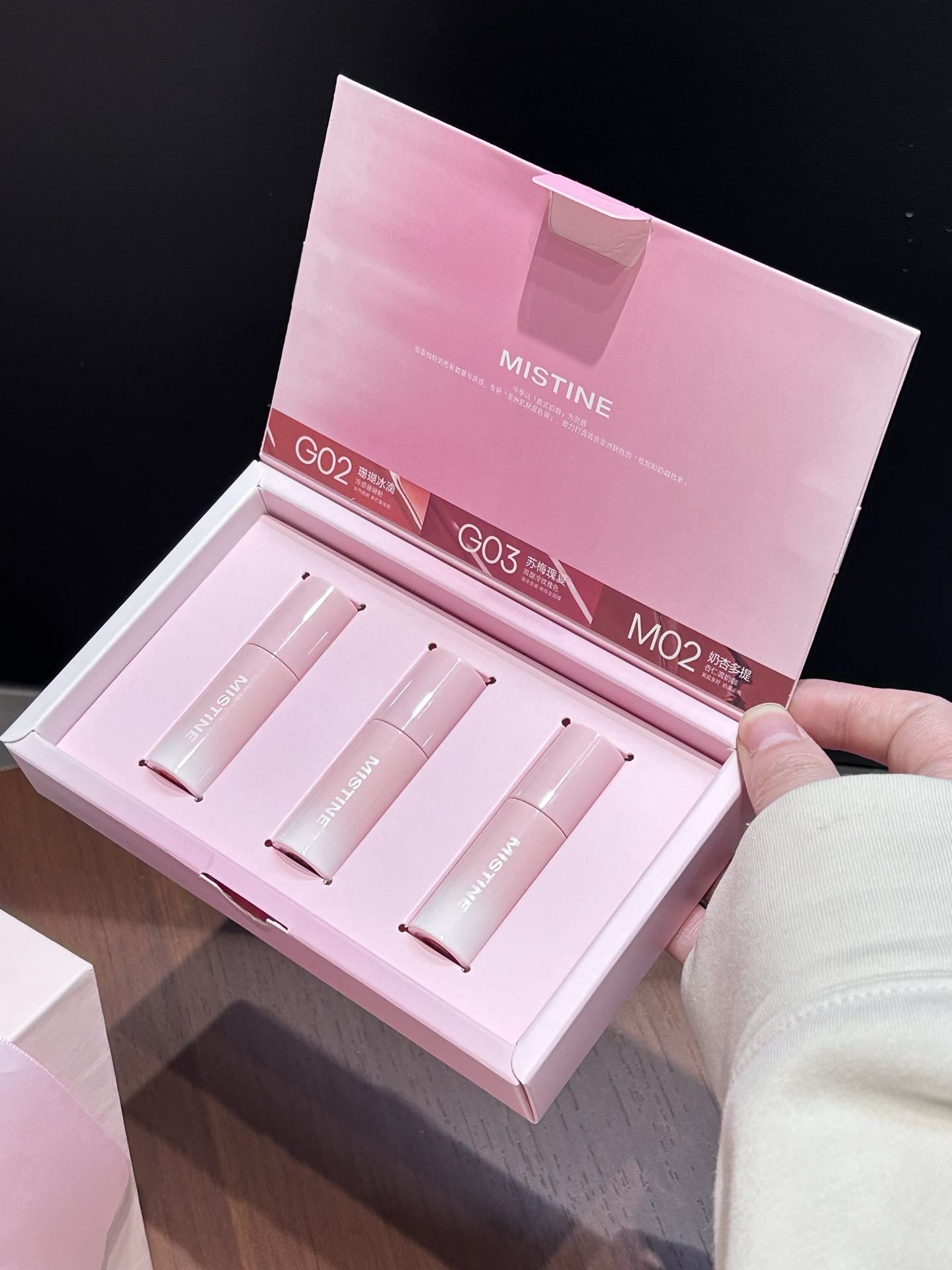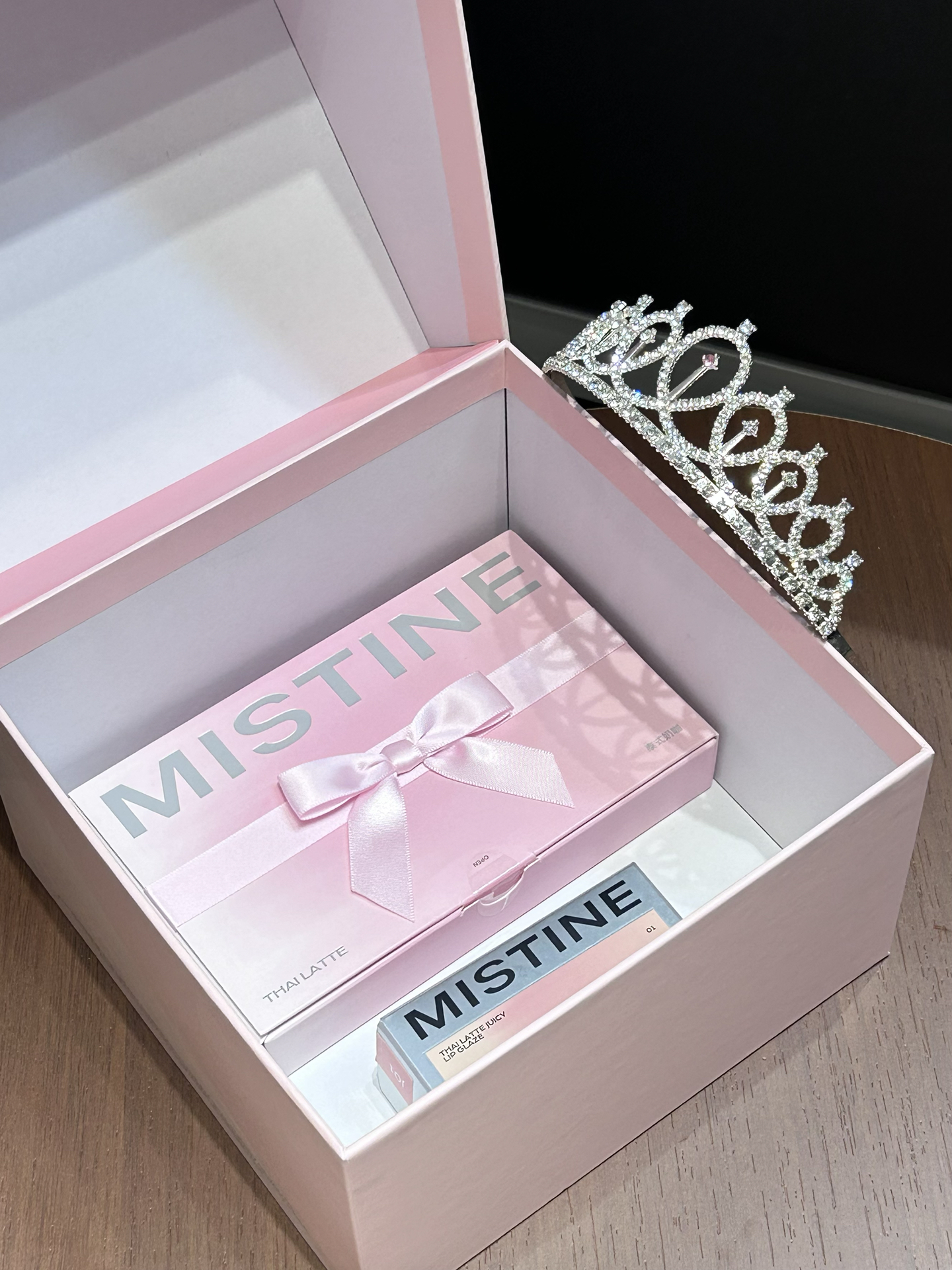 不愧是misitine啊 这个直接把我拿捏住了 粉粉嫩嫩的大蝴蝶结礼盒好浪漫 还送blingbling的小皇冠 谁收到不迷糊啊 里面有迷你唇釉套装还有一支唇釉正装 唇釉质地蛮润的 上嘴就是嘟嘟果冻唇 四个颜色全是日常挂 素颜涂也提气色 成膜后不拔干 持妆一整天都ok 我觉得自用或者送人都好有仪式感诶