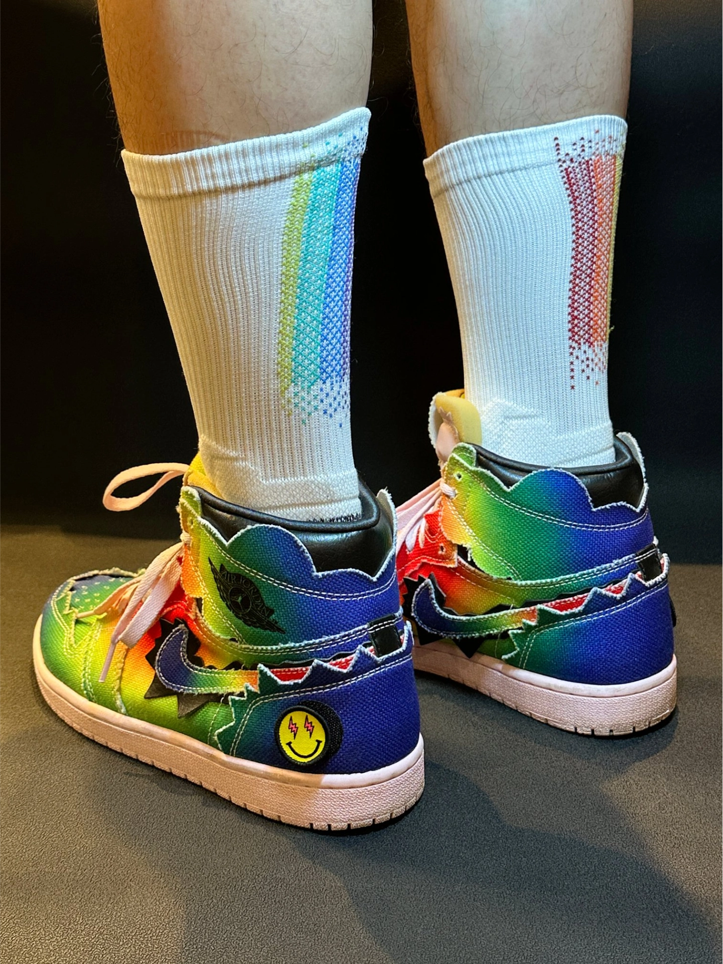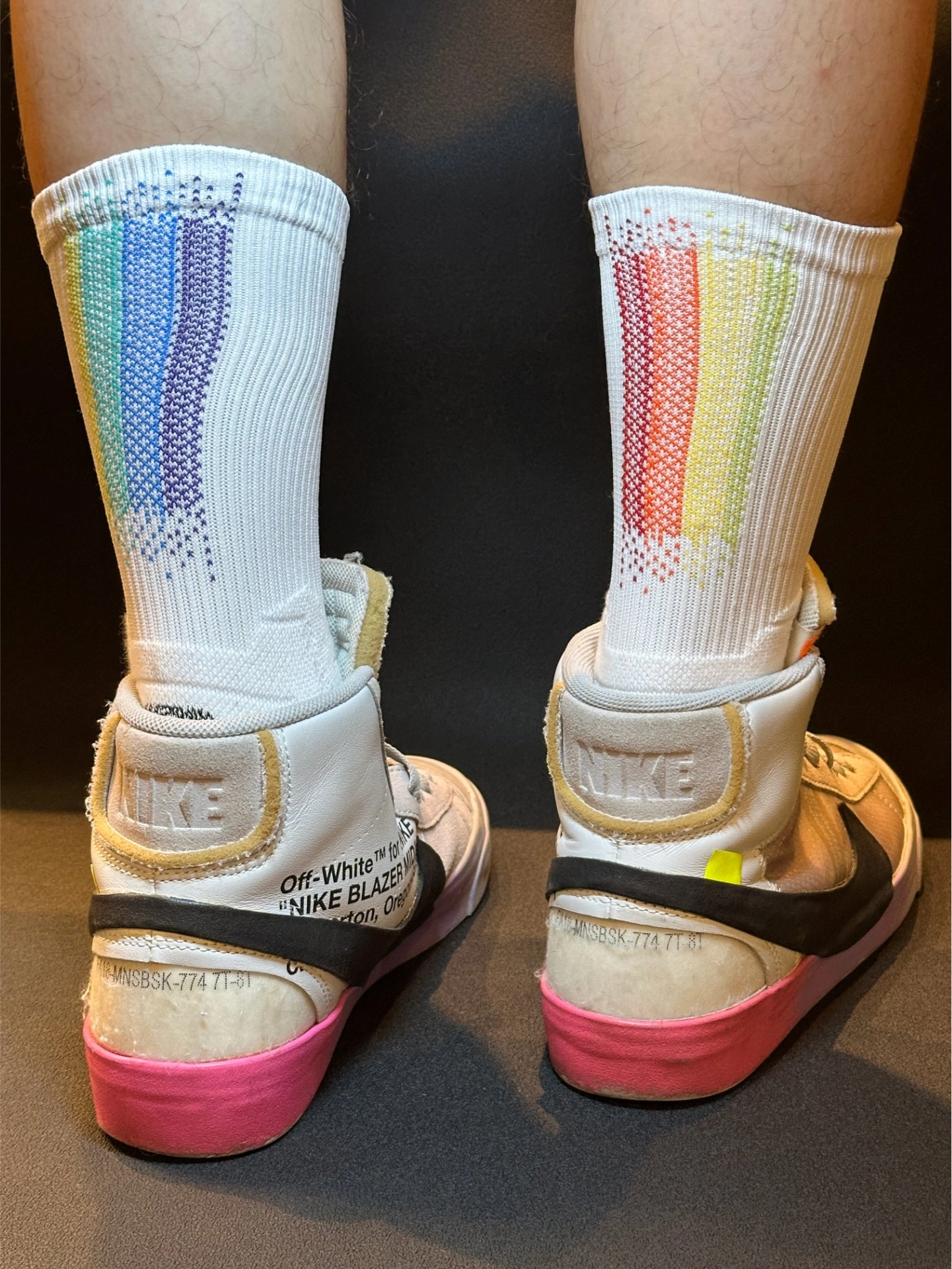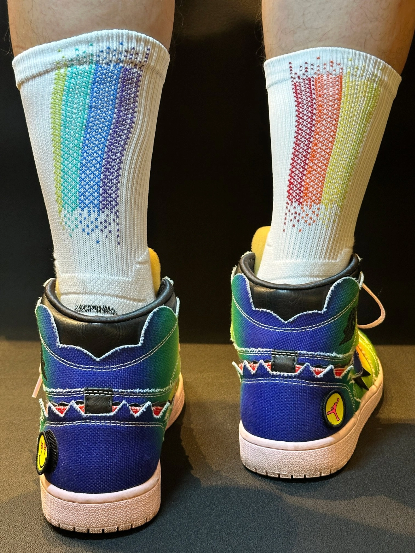 这双维动马年彩虹独角兽篮球袜配耐克鞋也太绝了!🌈 袜子直接把彩虹渐变玩明白了,主体那层渐变就像独角兽的梦幻彩衣,从浅蓝到粉紫慢慢过渡,看着就超治愈。加上彩色小点做点缀,像是彩虹光在闪,层次感一下就拉满,穿脚上特别吸睛。 再搭耐克鞋简直是神仙组合!不管是AJ那双彩虹渐变鞋,还是OW Blazer这种经典款,都能完美适配。上脚后袜子成了亮点,球场回头率直接拉满,既有时髦感,又有独角兽带来的活力bu...