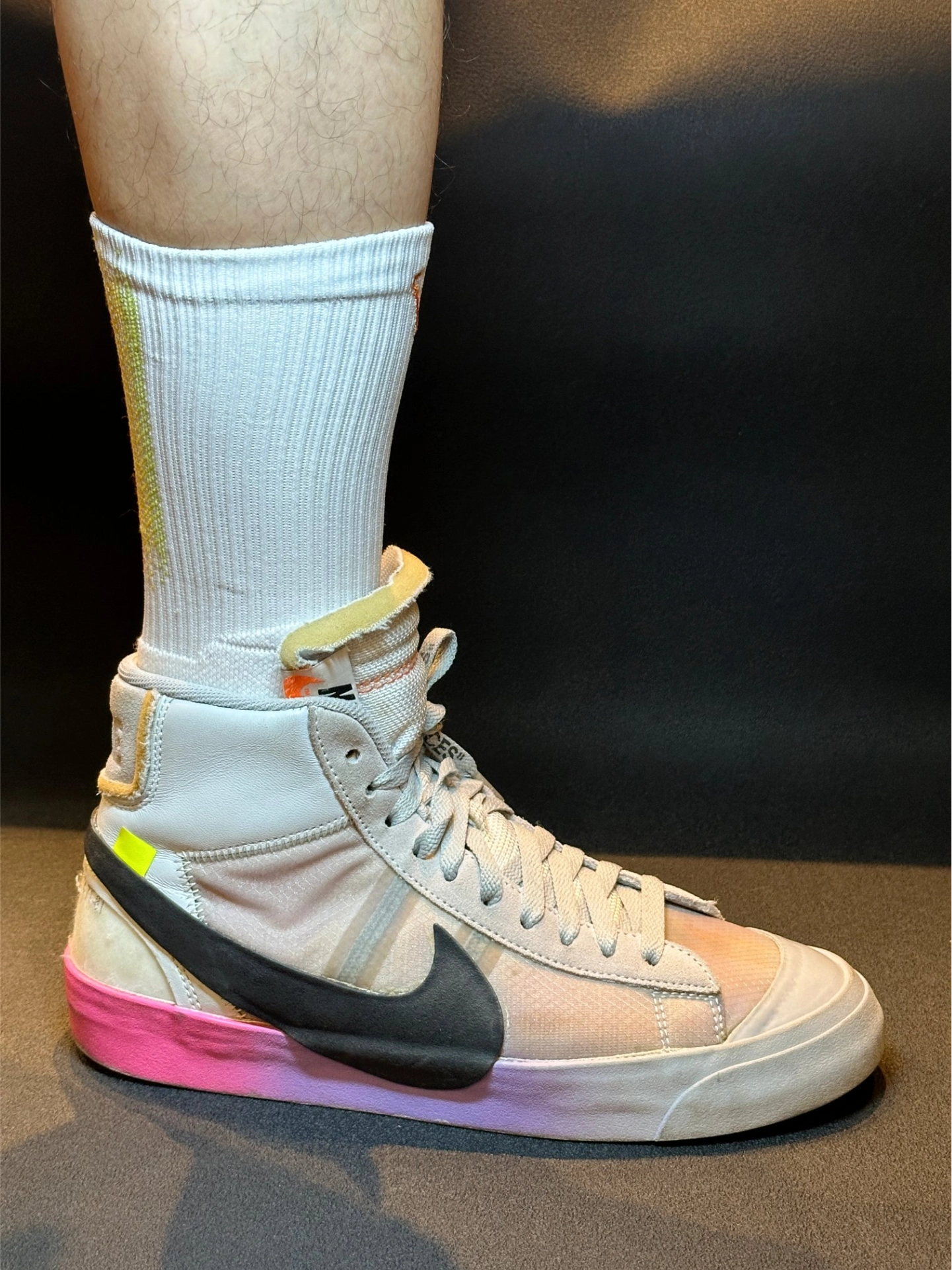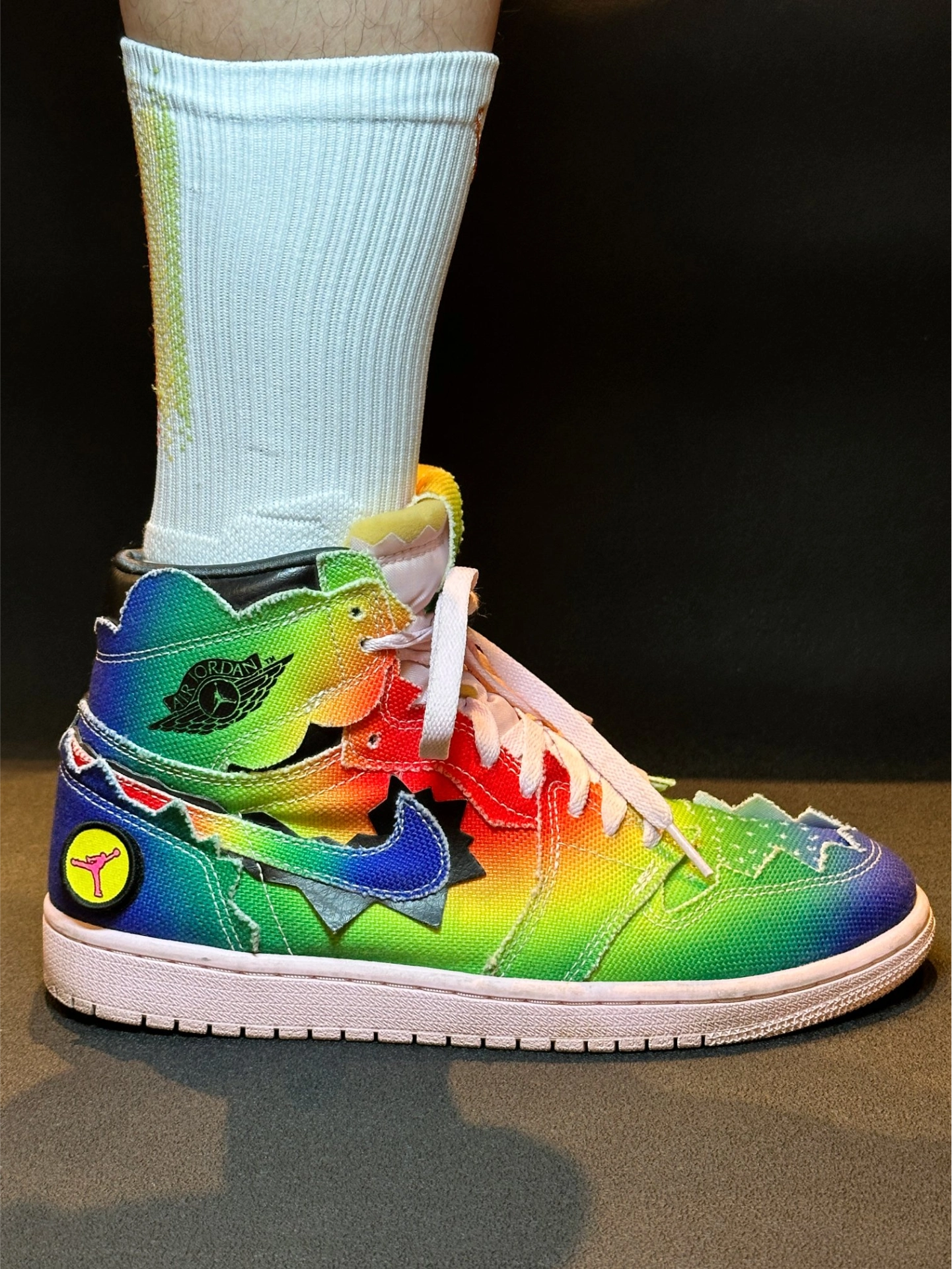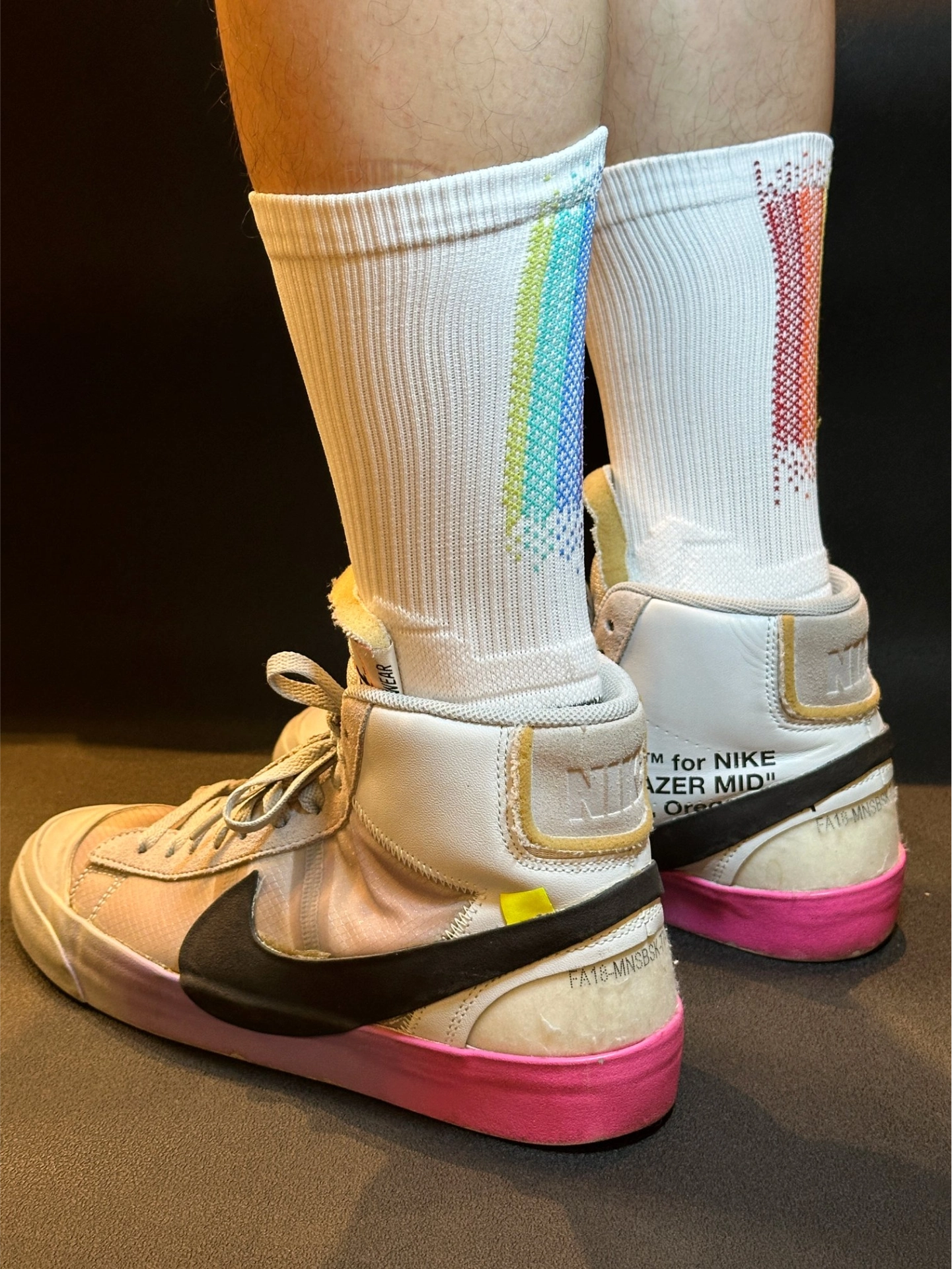 这双维动马年彩虹独角兽篮球袜配耐克鞋也太绝了!🌈 袜子直接把彩虹渐变玩明白了,主体那层渐变就像独角兽的梦幻彩衣,从浅蓝到粉紫慢慢过渡,看着就超治愈。加上彩色小点做点缀,像是彩虹光在闪,层次感一下就拉满,穿脚上特别吸睛。 再搭耐克鞋简直是神仙组合!不管是AJ那双彩虹渐变鞋,还是OW Blazer这种经典款,都能完美适配。上脚后袜子成了亮点,球场回头率直接拉满,既有时髦感,又有独角兽带来的活力bu...