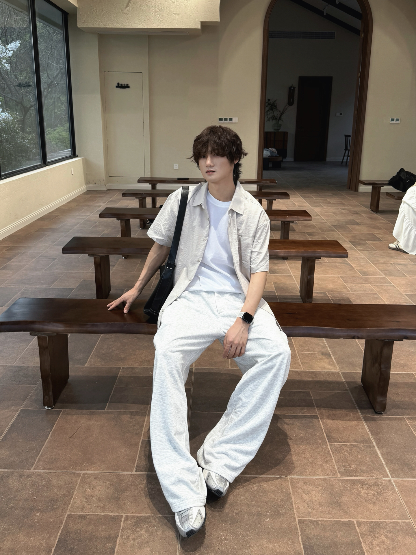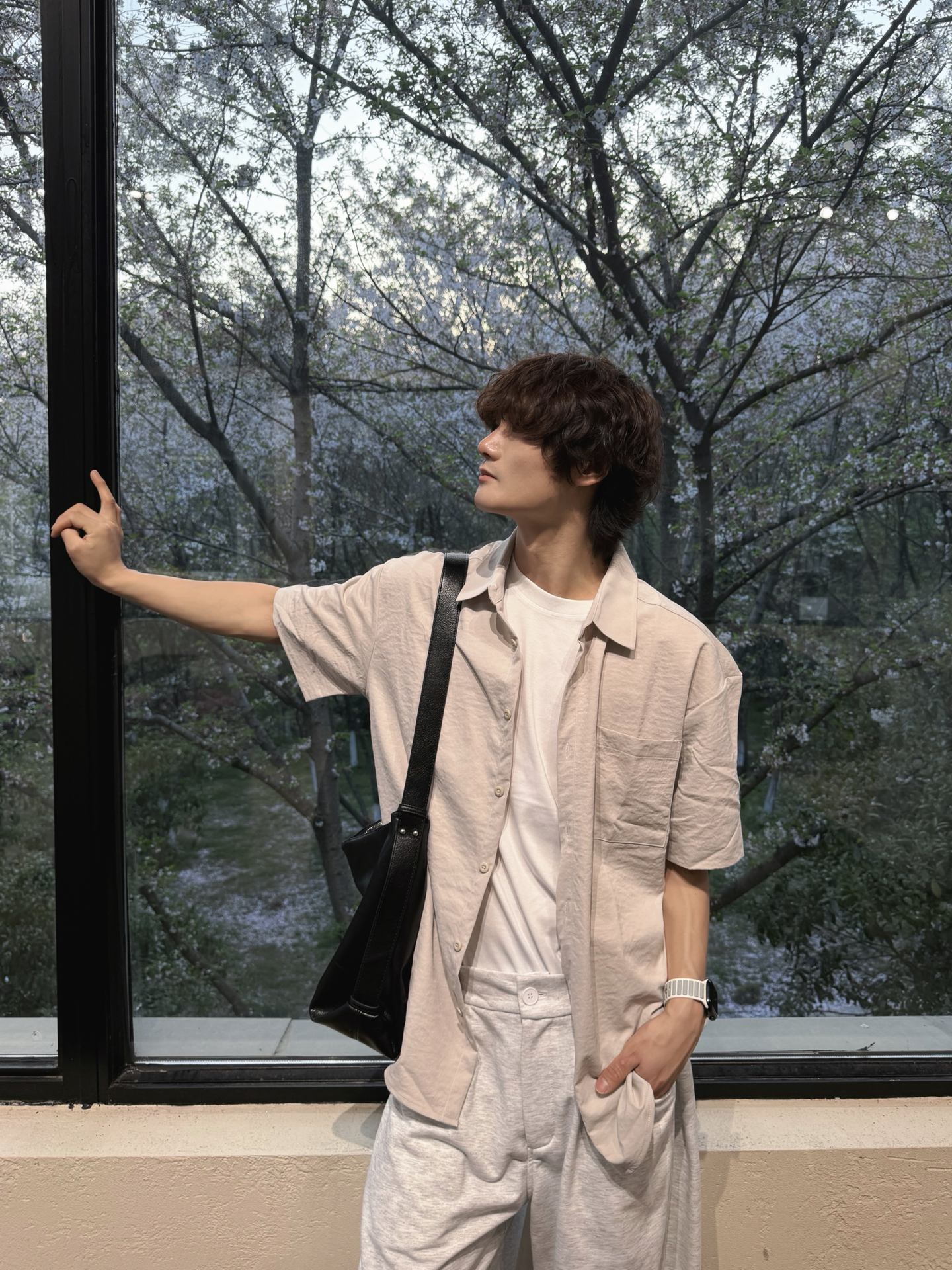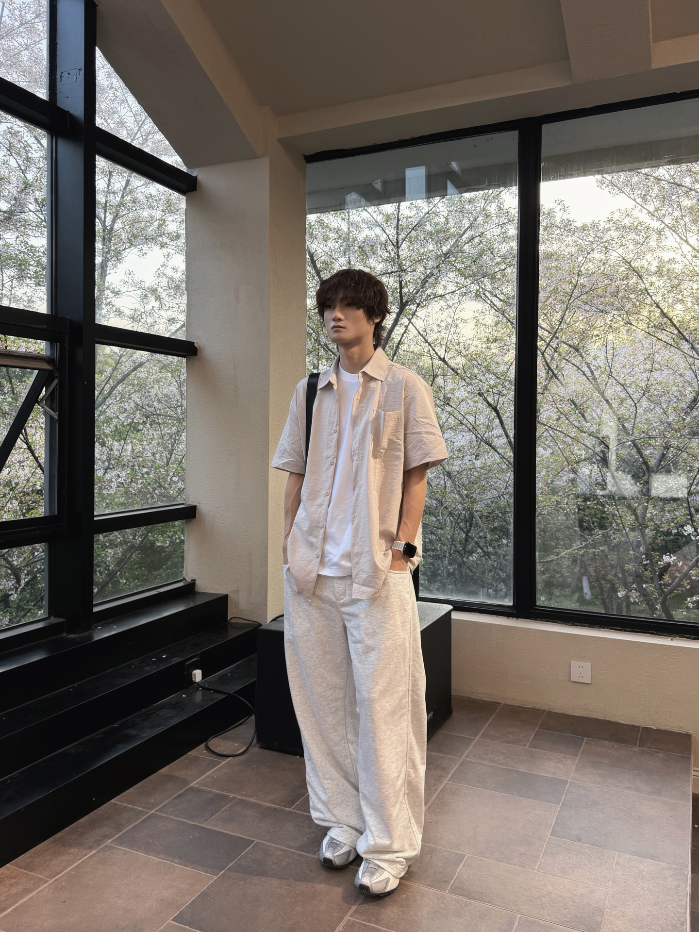 捕捉春日里的片刻宁静🍃 一身浅灰调,温柔又治愈 衬衫+阔腿裤的万能公式 干净利落,不费力的时髦感 简单穿搭,也能穿出氛围感