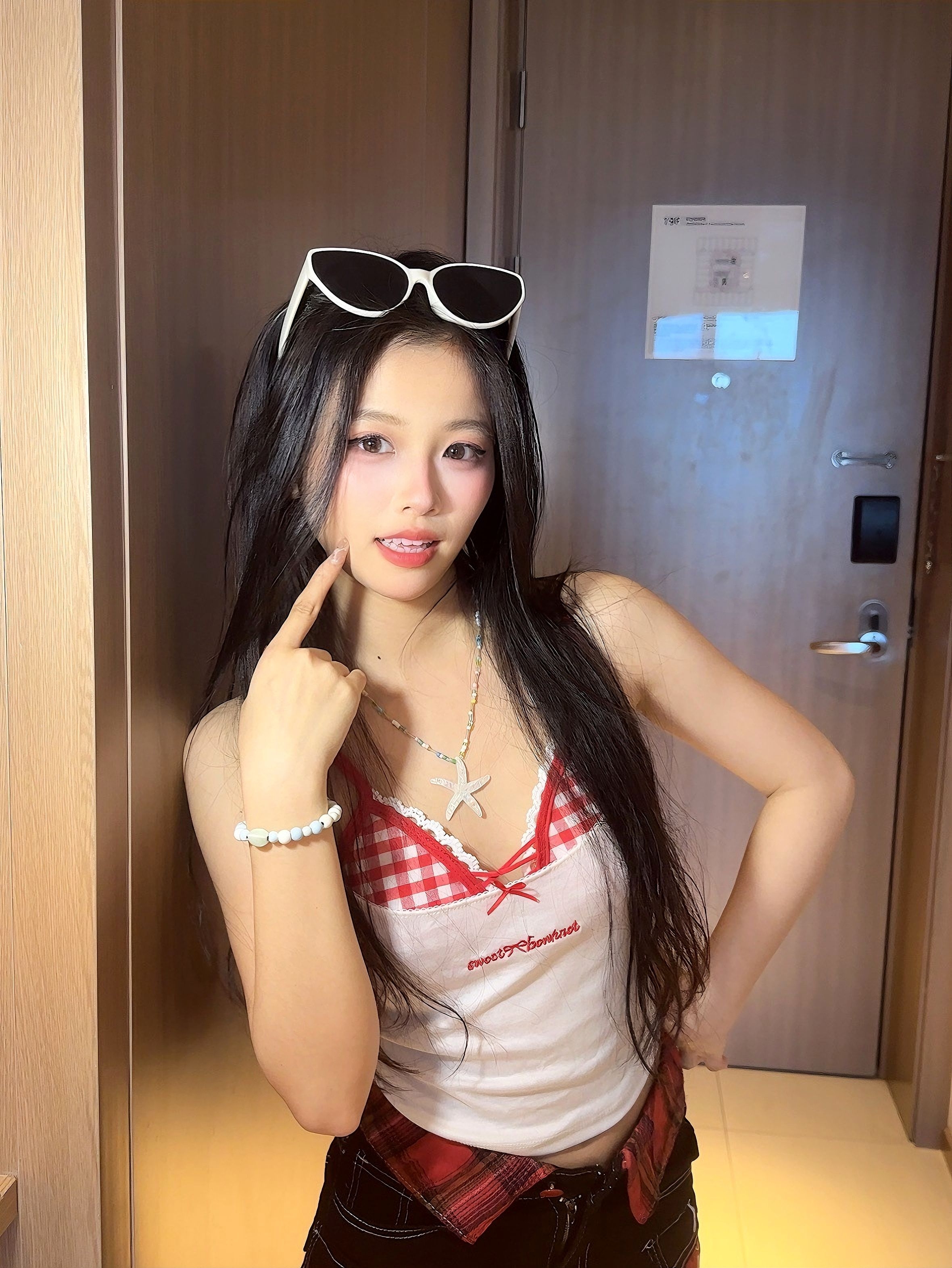 谁能拒绝甜酷双修的辣妹穿搭! 红白格纹+黑牛仔Kitty短裤 美式复古感拉满✨ 白吊带+黑长直 纯欲感和拽姐范直接拿捏 走廊随手拍都出片 甜妹也能秒变拽姐 超级美丽的一套衣服,去海边的姐妹快快安排起来吧