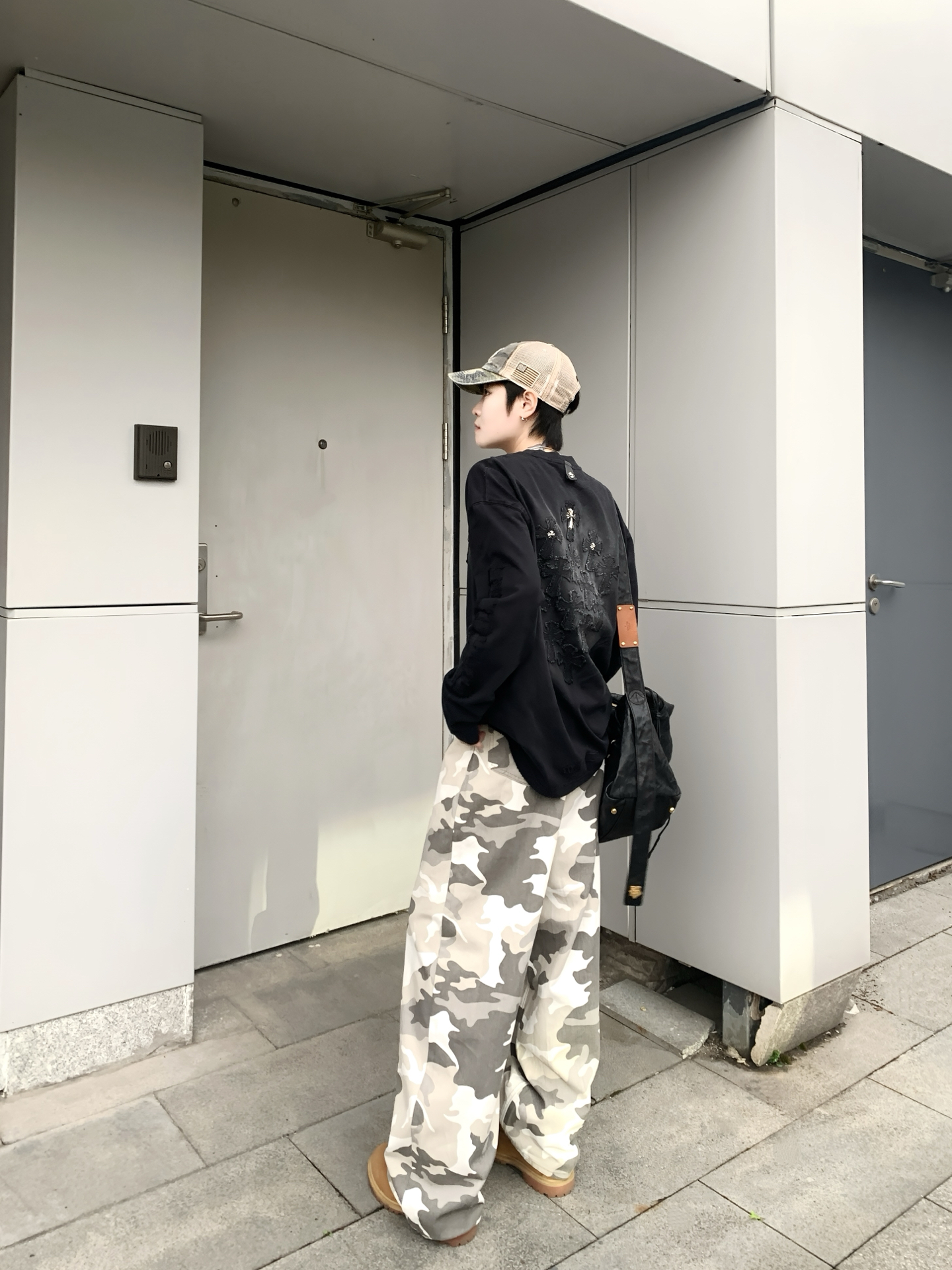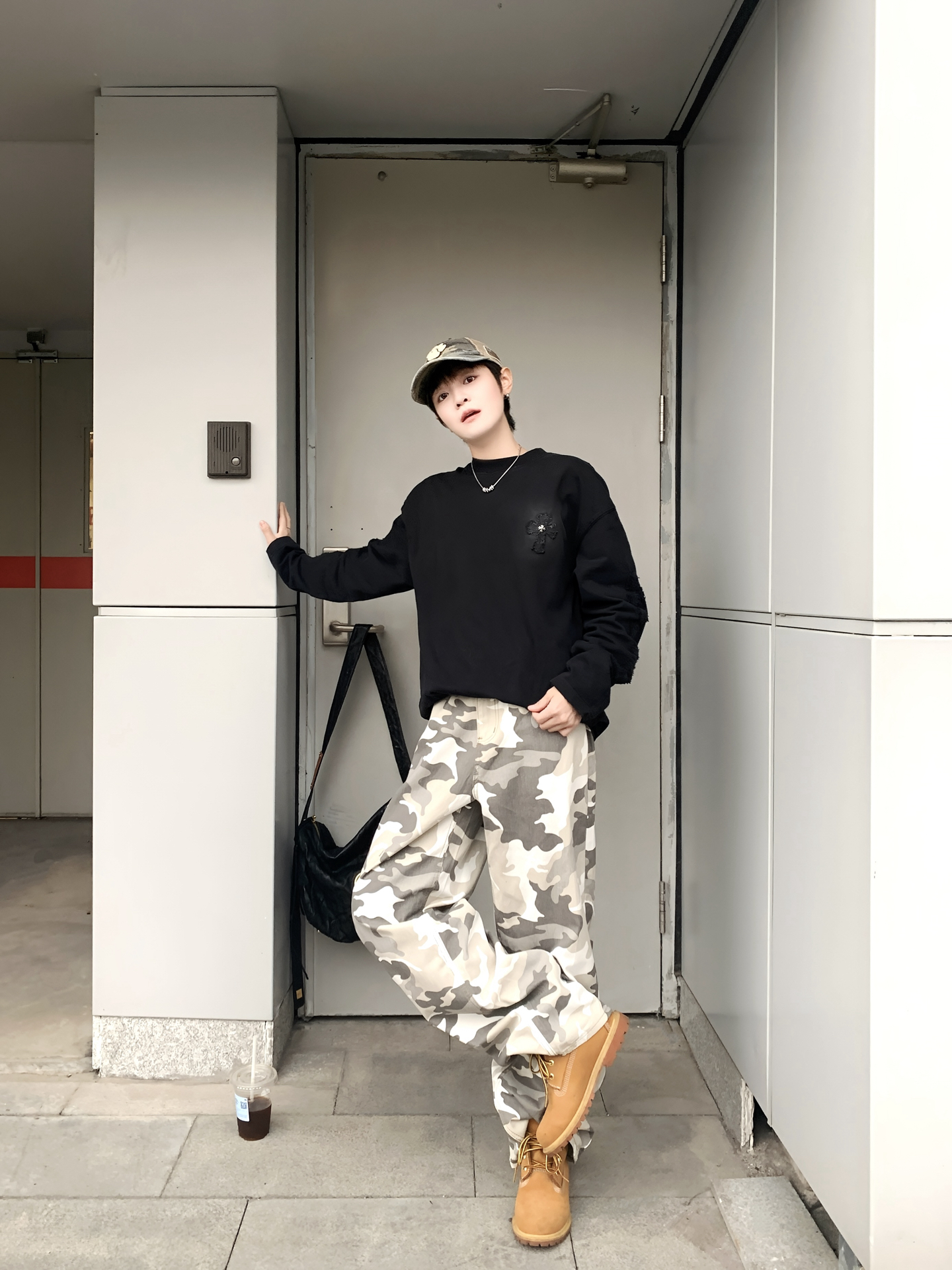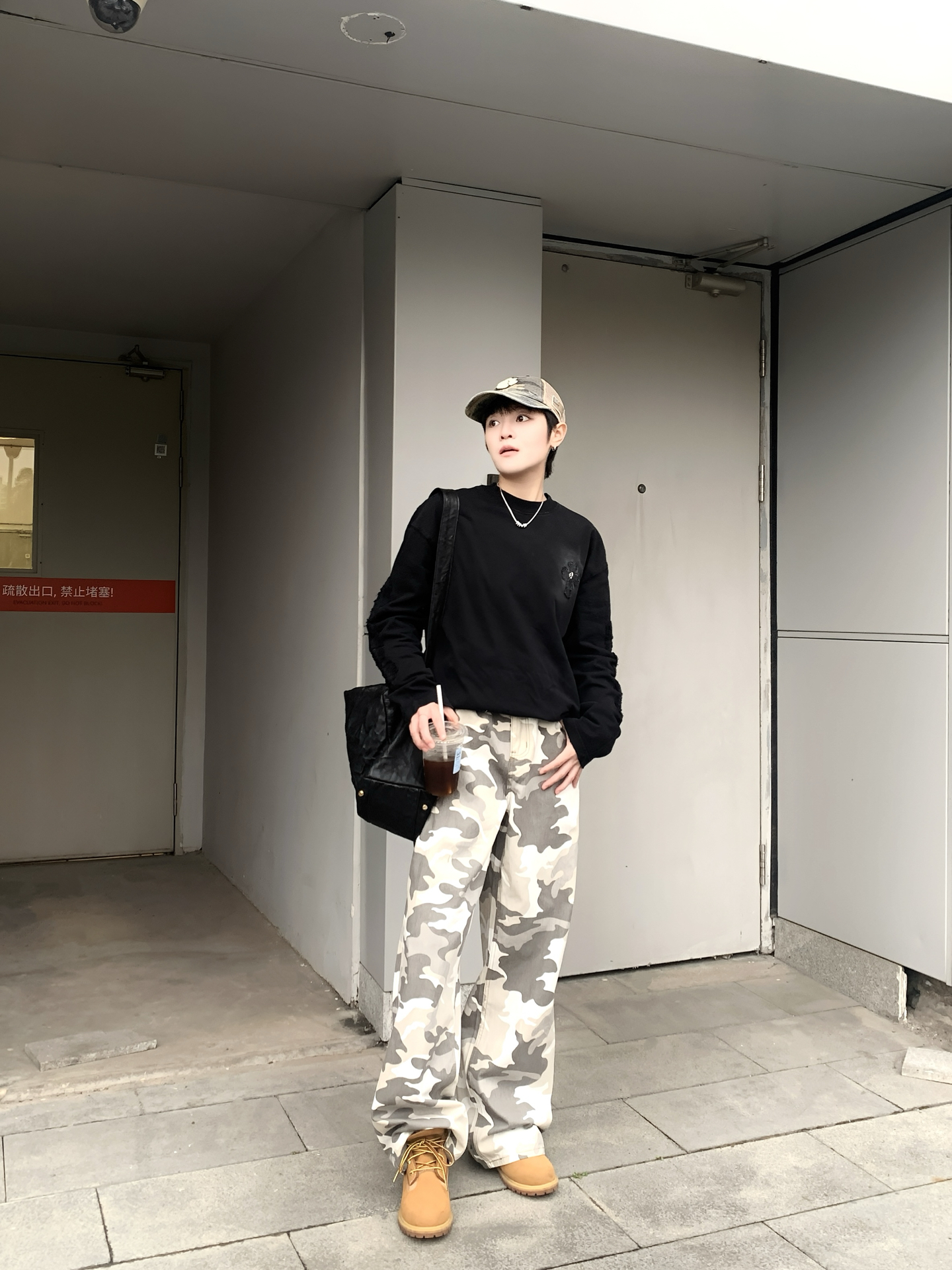 163 48 👔 Hearts 👖 👟 首选一件黑色打底T恤 可以平衡迷彩的繁杂感 整体不会太浮夸 避免花里胡哨的亮色 选择一条宽松直筒版型的迷彩裤搭配 拒绝紧身效果 松弛感最重要 控制好裤长刚刚好叠堆靴口不拖沓 春日迷彩街头vibe风 不论是日常出行还是旅游度假都很适合