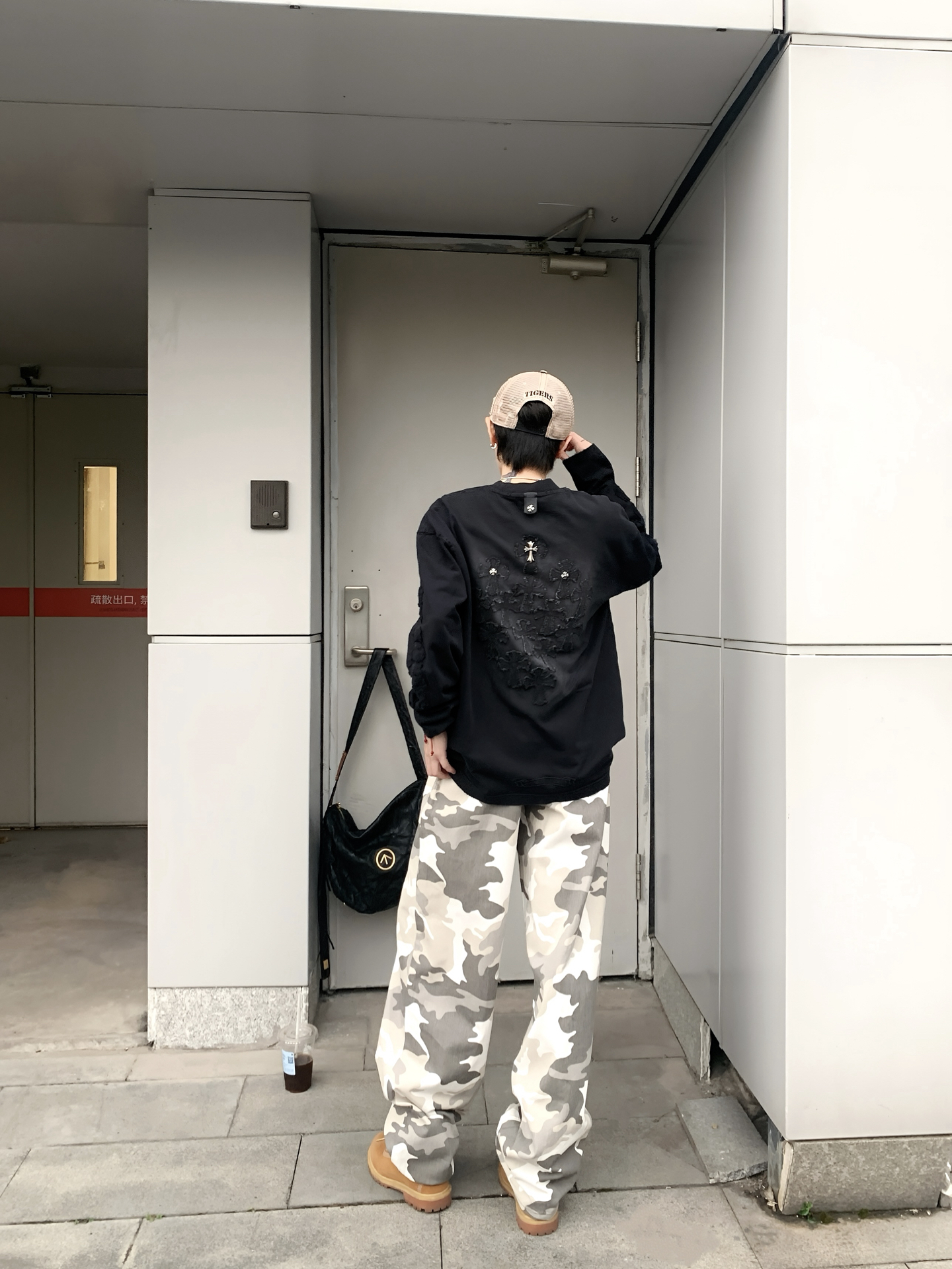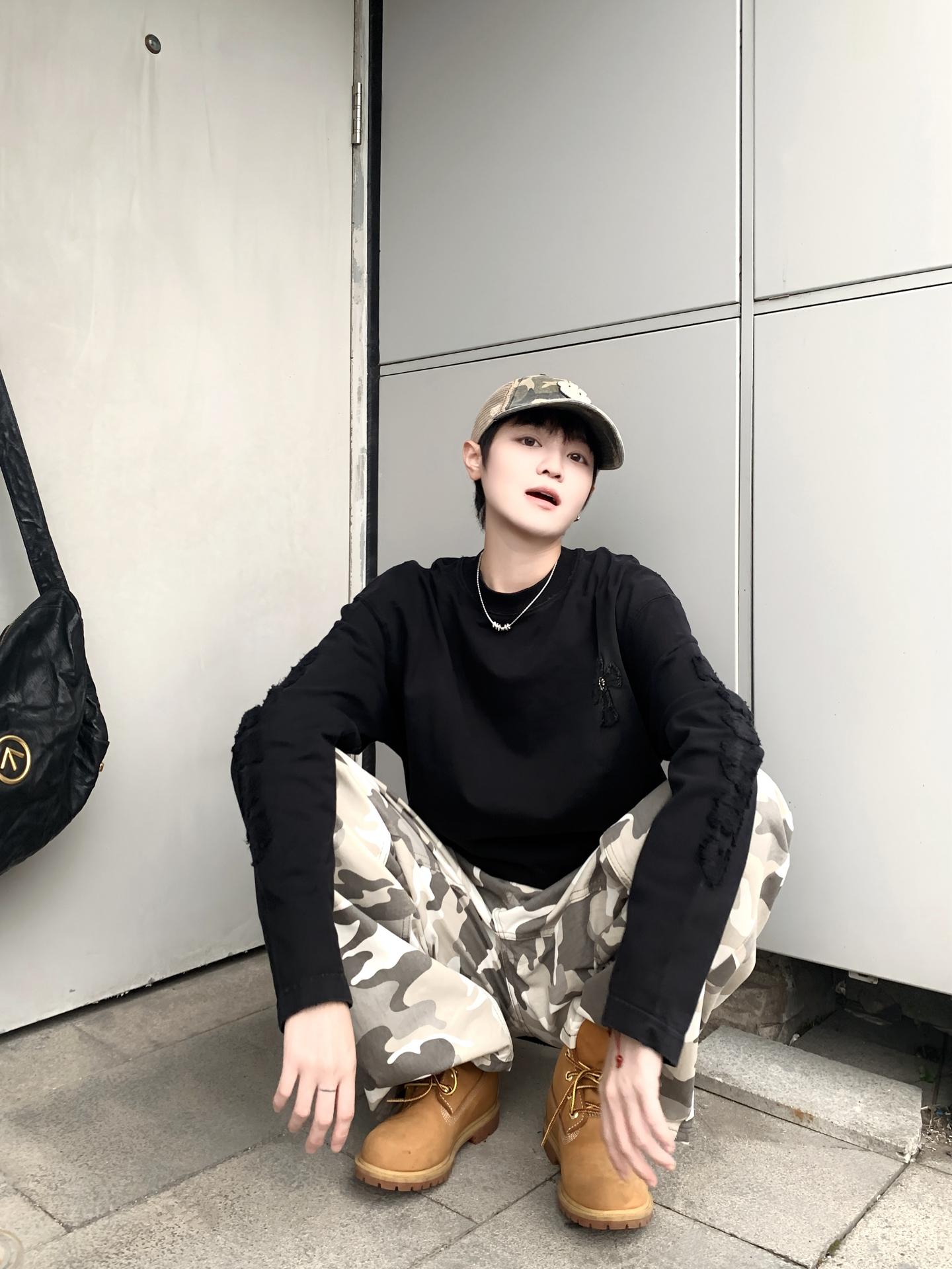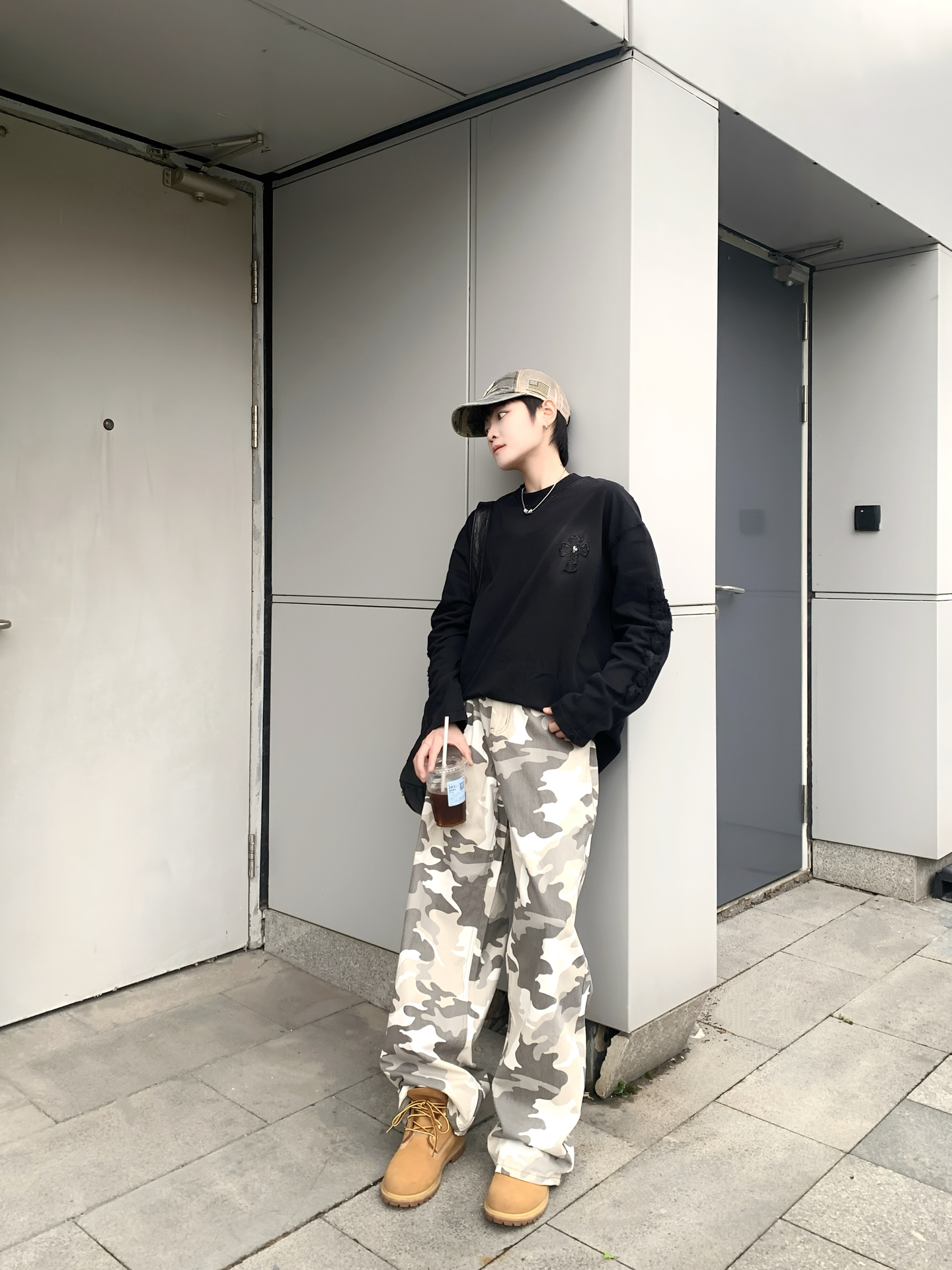 163 48 👔 Hearts 👖 👟 首选一件黑色打底T恤 可以平衡迷彩的繁杂感 整体不会太浮夸 避免花里胡哨的亮色 选择一条宽松直筒版型的迷彩裤搭配 拒绝紧身效果 松弛感最重要 控制好裤长刚刚好叠堆靴口不拖沓 春日迷彩街头vibe风 不论是日常出行还是旅游度假都很适合
