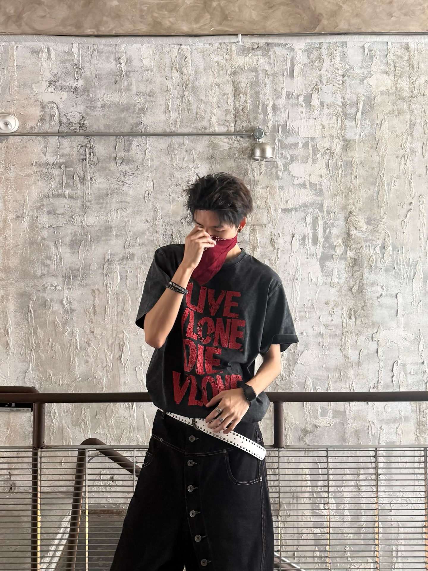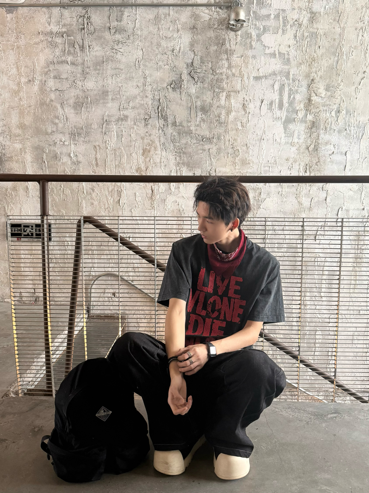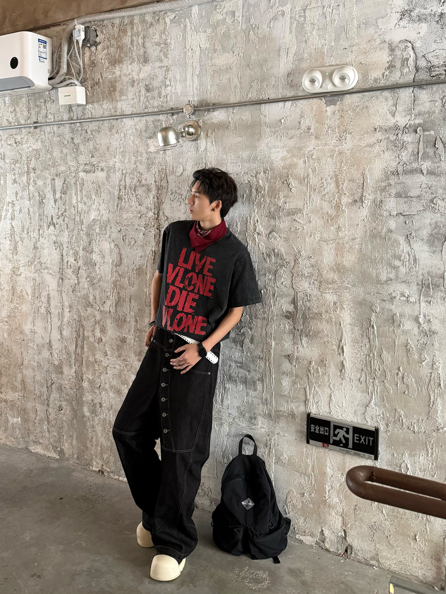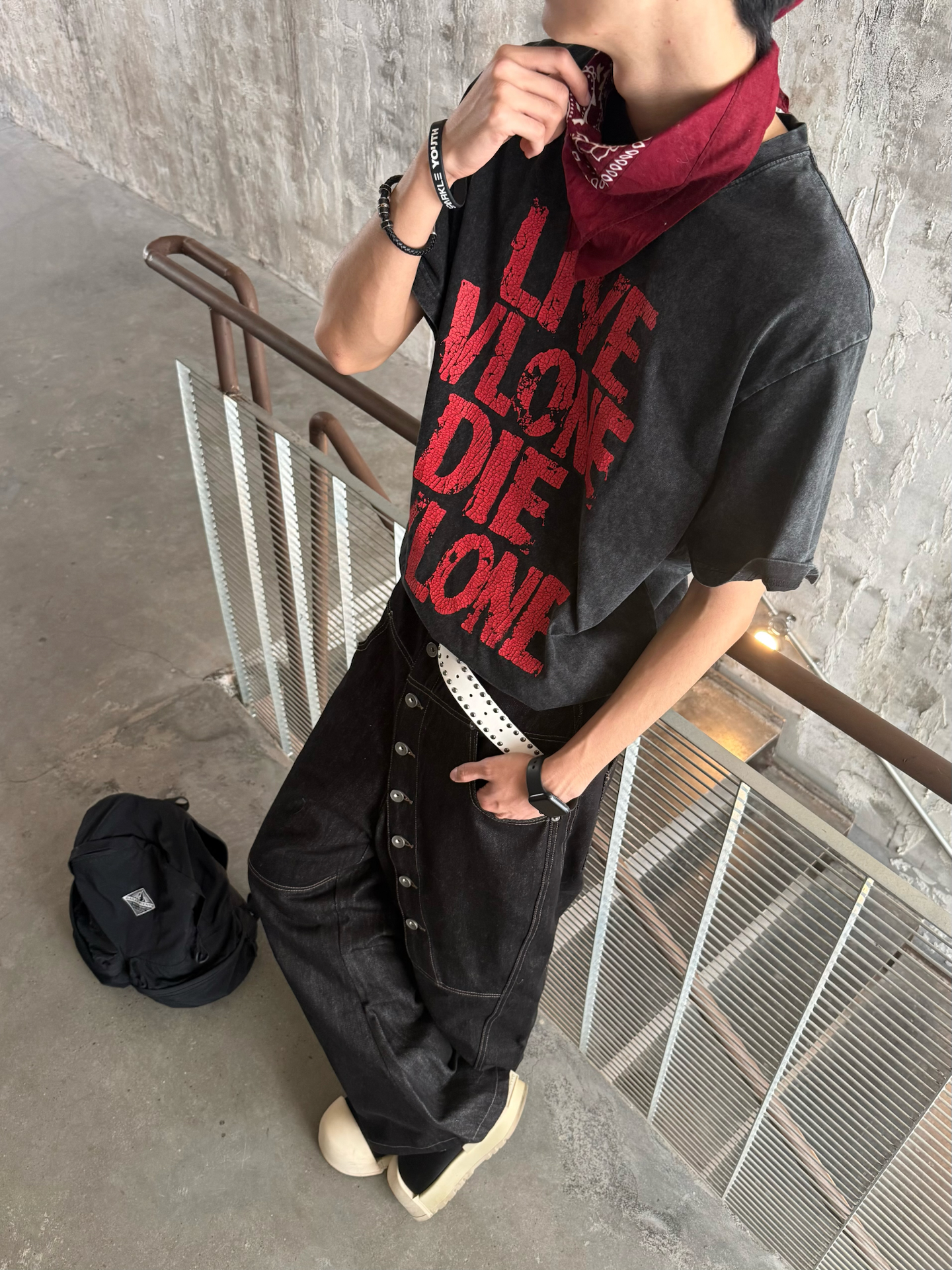 终于入早春啦🌿天气不冷不热的刚刚好 出门前冲了杯咖啡 瞄了眼窗外👀 发现人还挺多 的都跑出来晒太阳了 我也出去晃两圈 补补钙✌️ 今天穿了件vlone的做旧黑红印花T👔 配了条阔腿弯刀裤 怕一身黑太过沉闷没层次✅ 就用白腰带卡了下腰线 顺便抓条红白方巾系在脖子上😎颜色刚好和T恤的下印花做个小呼应 还挺有调性的 这两天也是兜兜转转的 试了好多风格🤔但还是觉得松弛的街头风 更适配这种随便乱晃的日子 不...