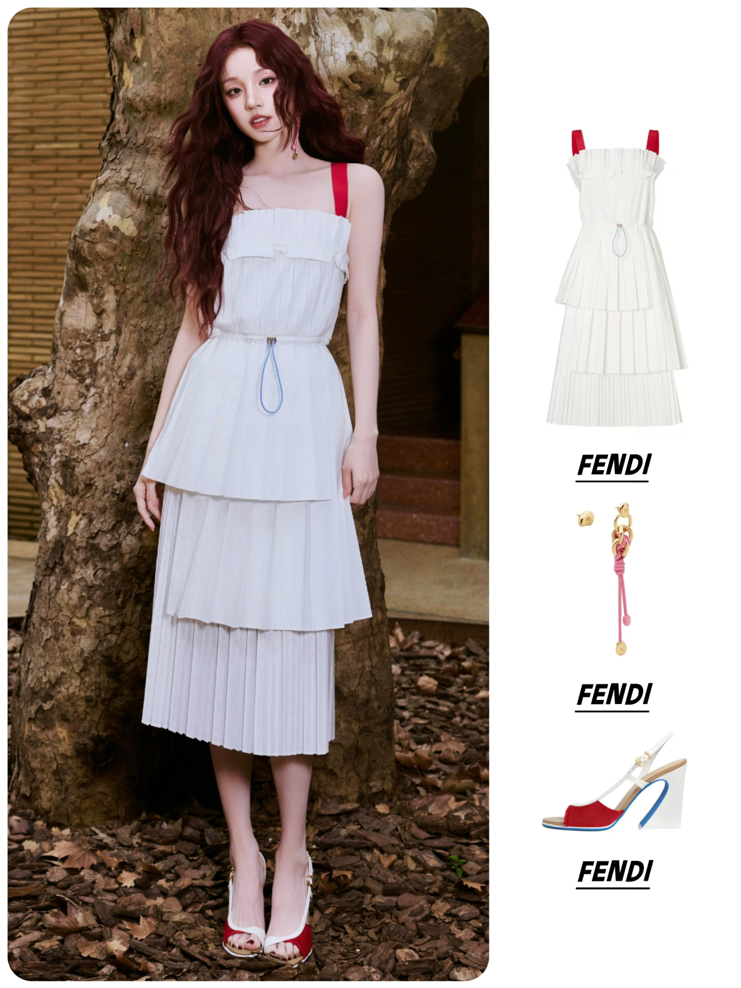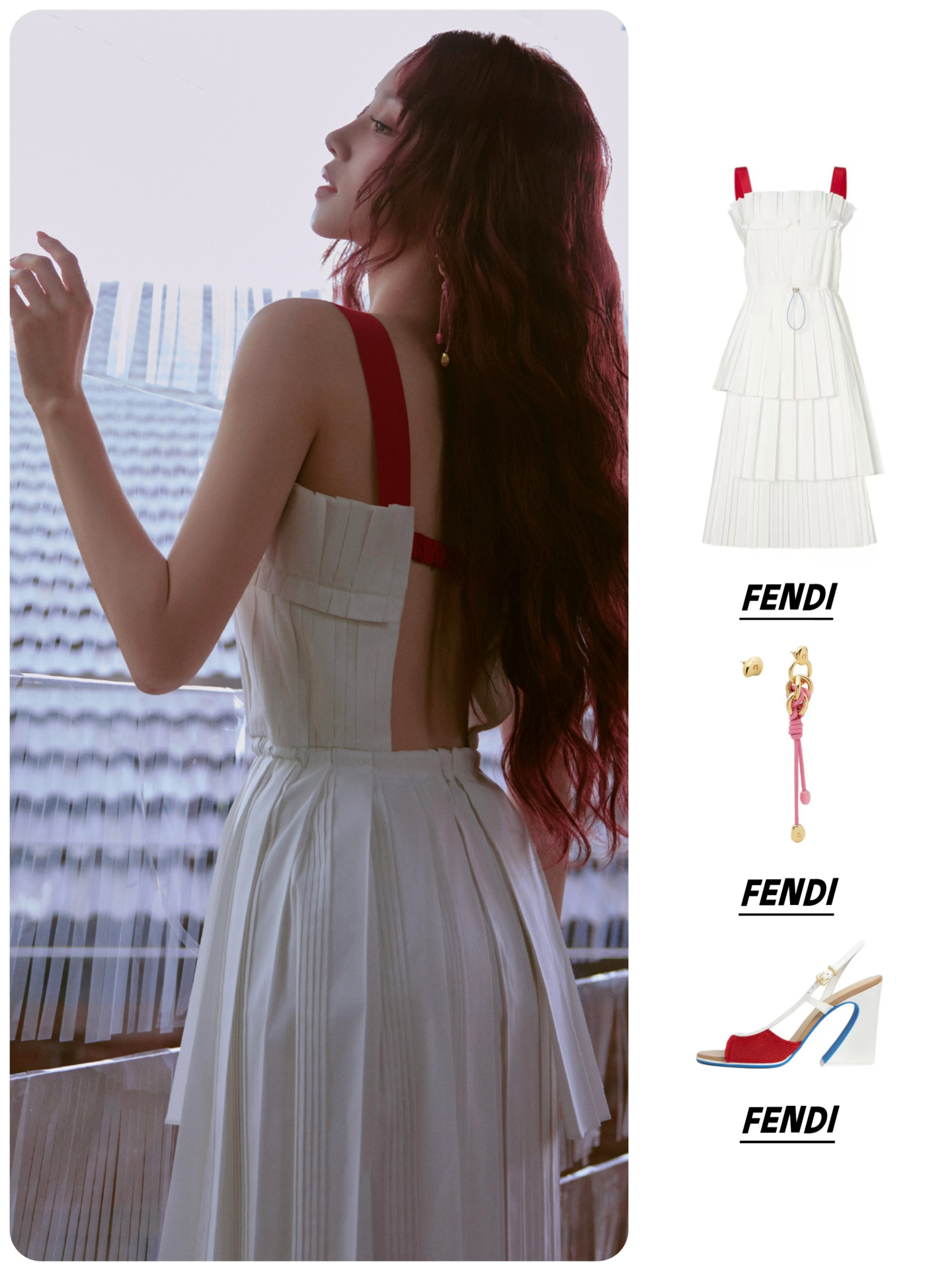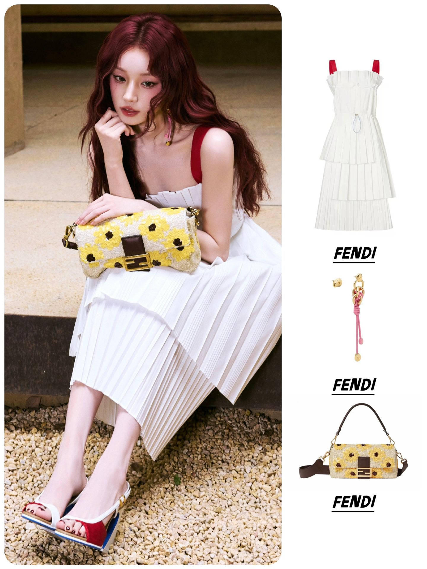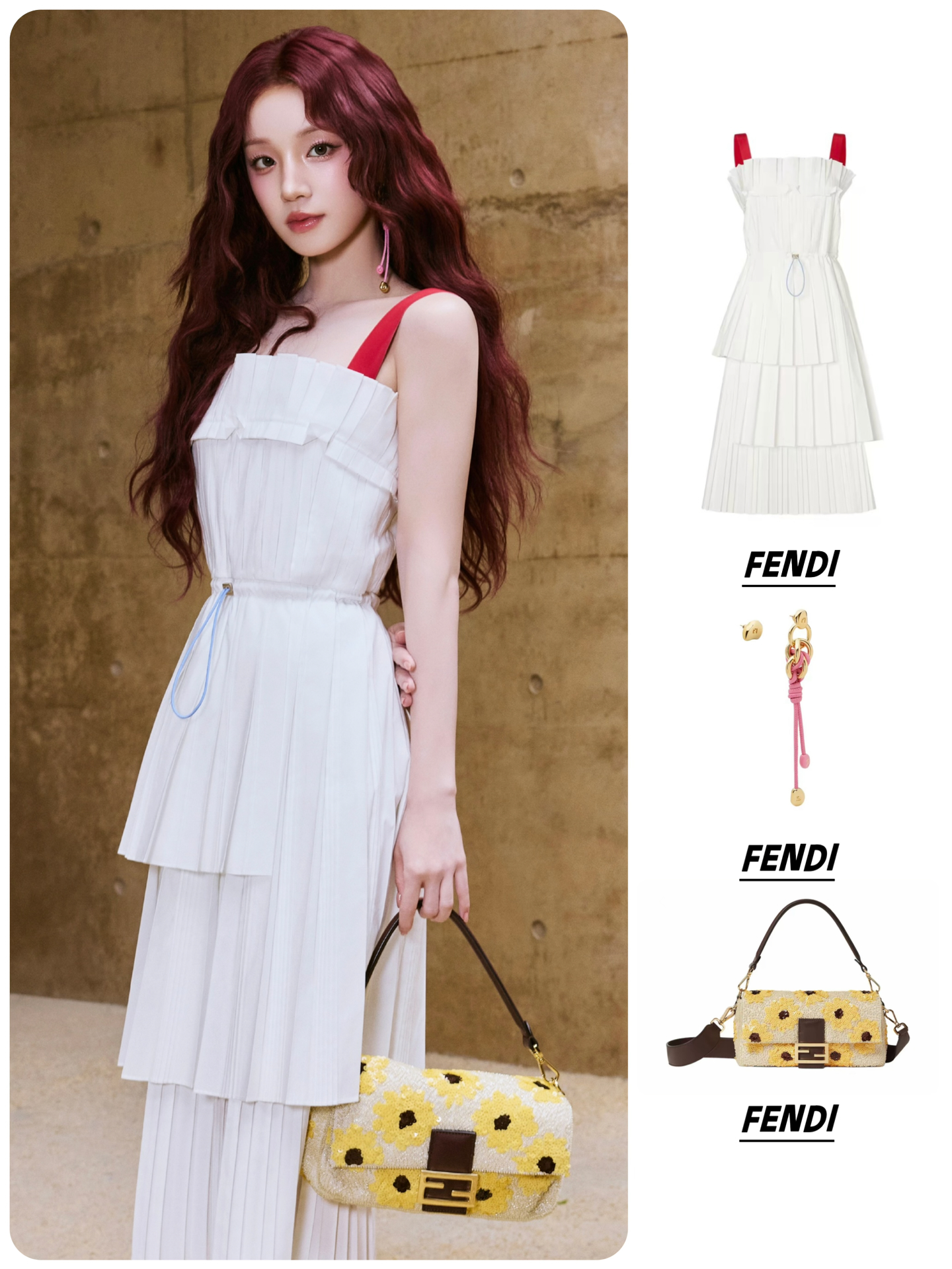 耳环:FENDI芬迪 不对称设计 铜合金 耳环 👗FENDI芬迪 SS26 不对称露背撞色肩带 无袖连衣裙 👜FENDI芬迪 Baguette 拼色花卉设计 棉拼亚麻 手提包 👠FENDI芬迪 Arco 皮革 小牛皮 圆头搭扣 一字带凉鞋