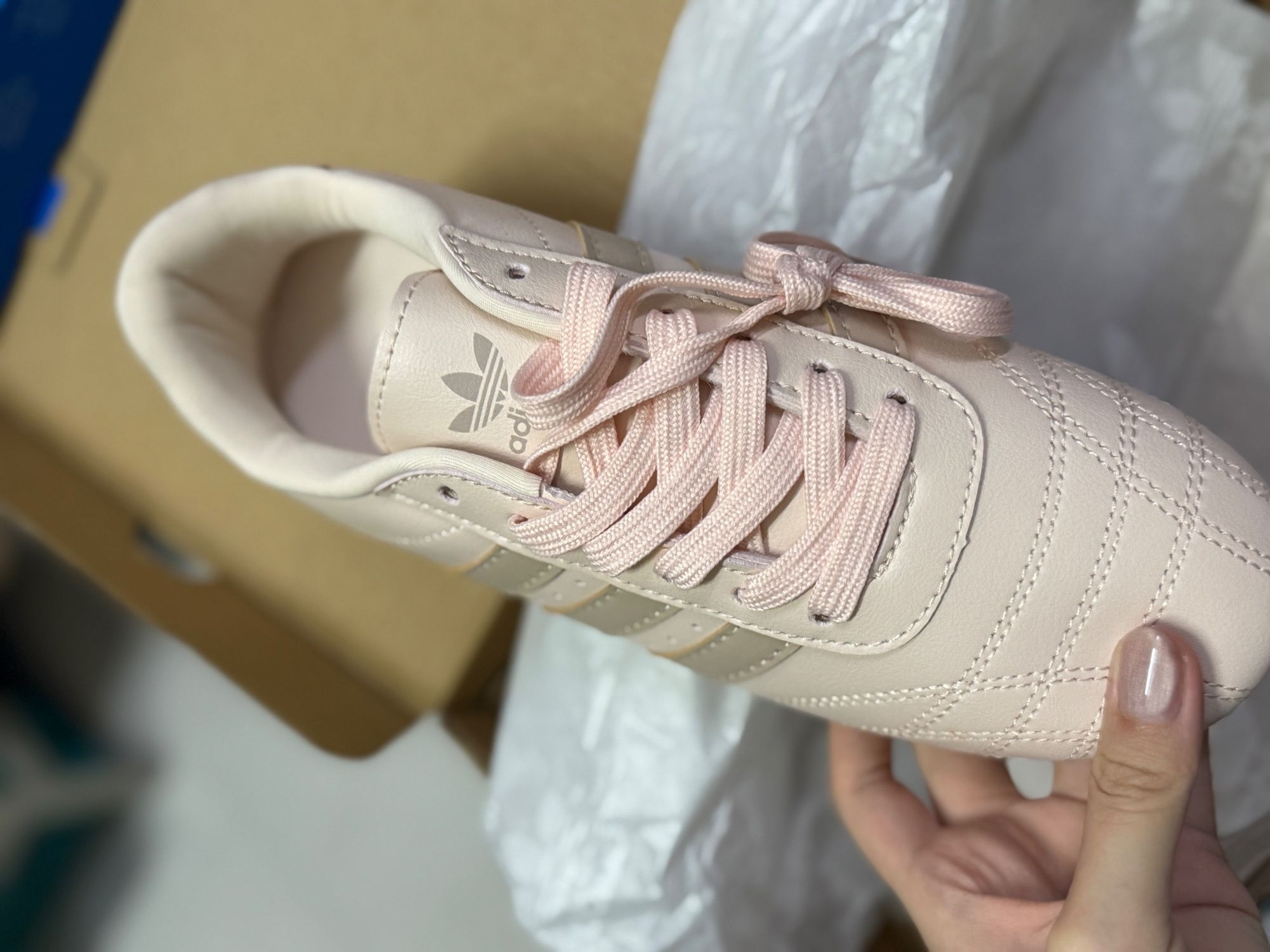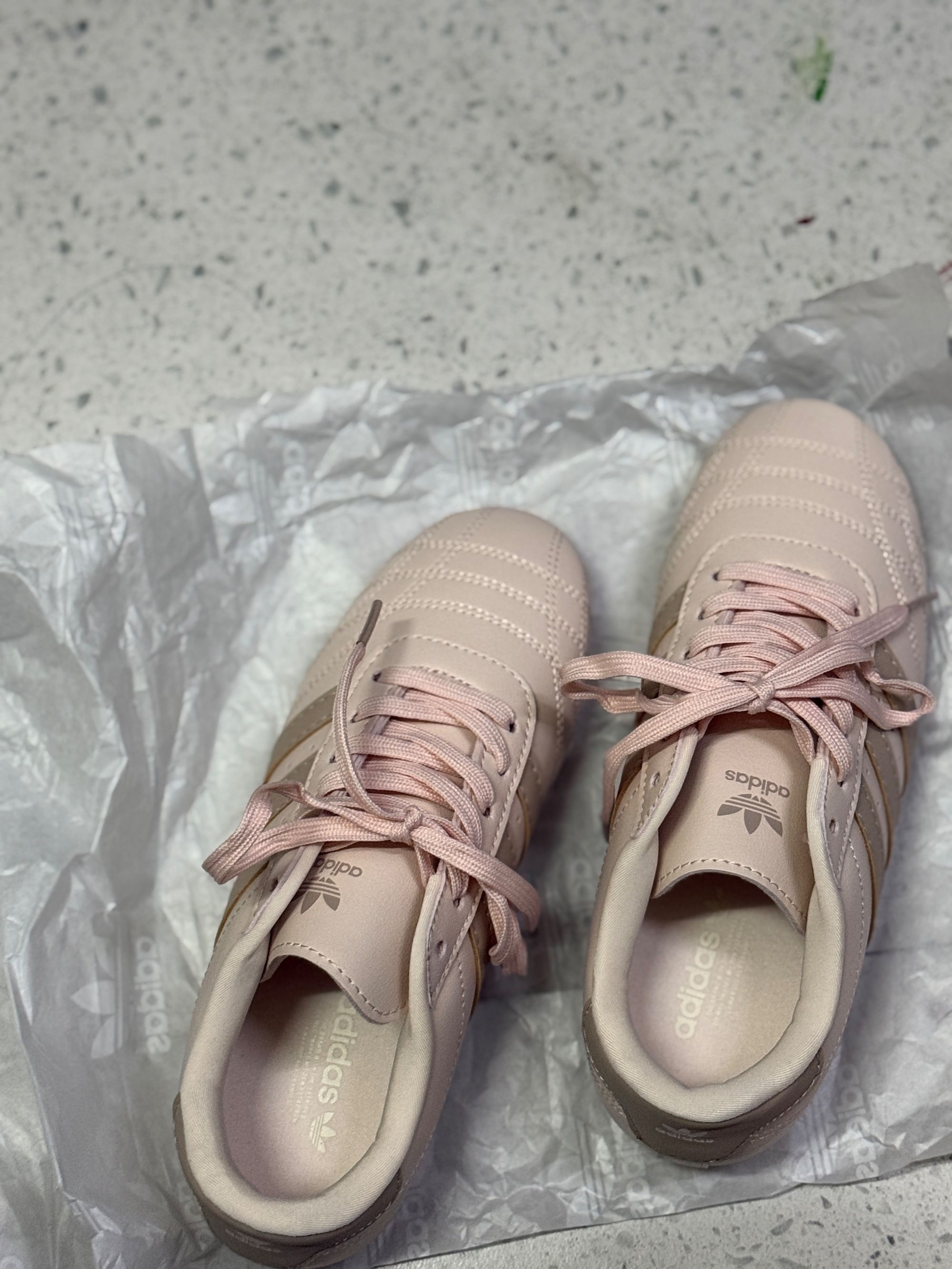 新鞋开箱宋雨琦同款阿迪达斯德训鞋浅粉色真的太嫩了,完全长在审美上! 上脚舒适不磨脚,显自又显脚小春天搭什么都好看,百搭神器无疑了
