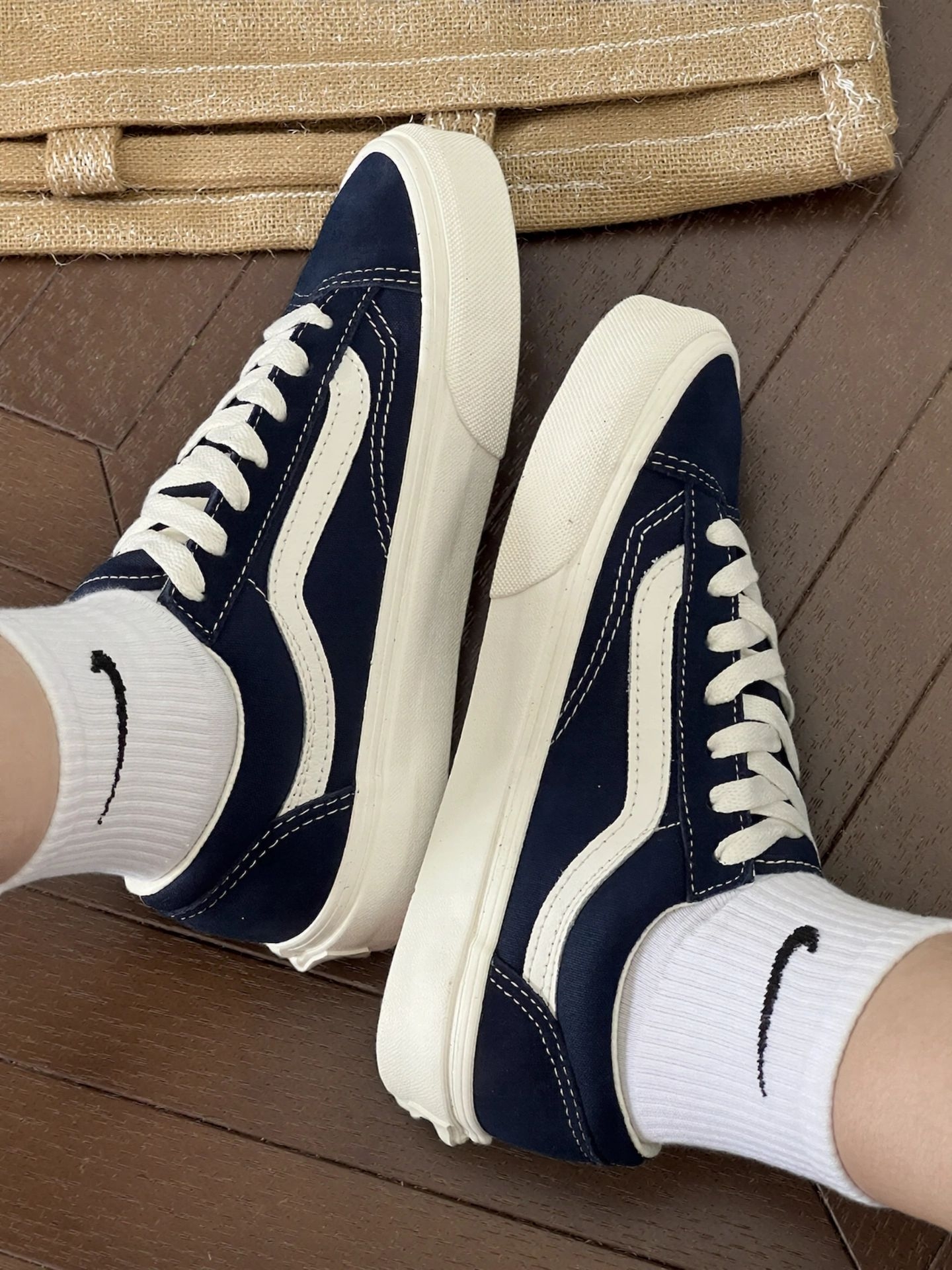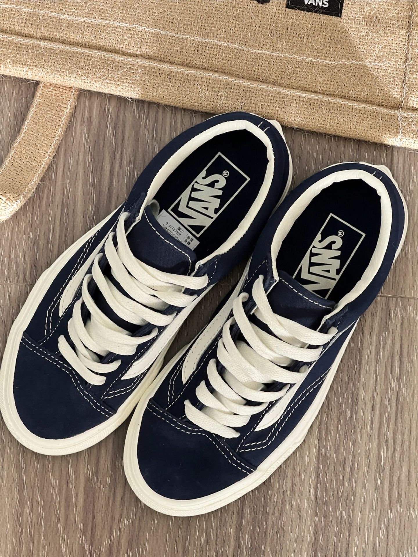 Vans藏青复古板鞋|日常穿搭百搭神器✨|||家人们!这双Vans真的长在审美上了🥹 藏青色麂皮质感,米白侧边条复古感拉满,完全不挑穿搭 米白鞋带做旧感十足,上脚韩系休闲那味儿直接拿捏🤌 鞋型秀气显脚小,搭牛仔裤、运动裤、小裙子都好看 上脚软乎乎的,走路久了也不磨脚,日常穿超舒服 经典款真的永远不会过时,喜欢休闲风的朋友可以试试~#板鞋春日氛围感ootd #蓝色系板鞋太好看了 #氛围感满满的复古板...