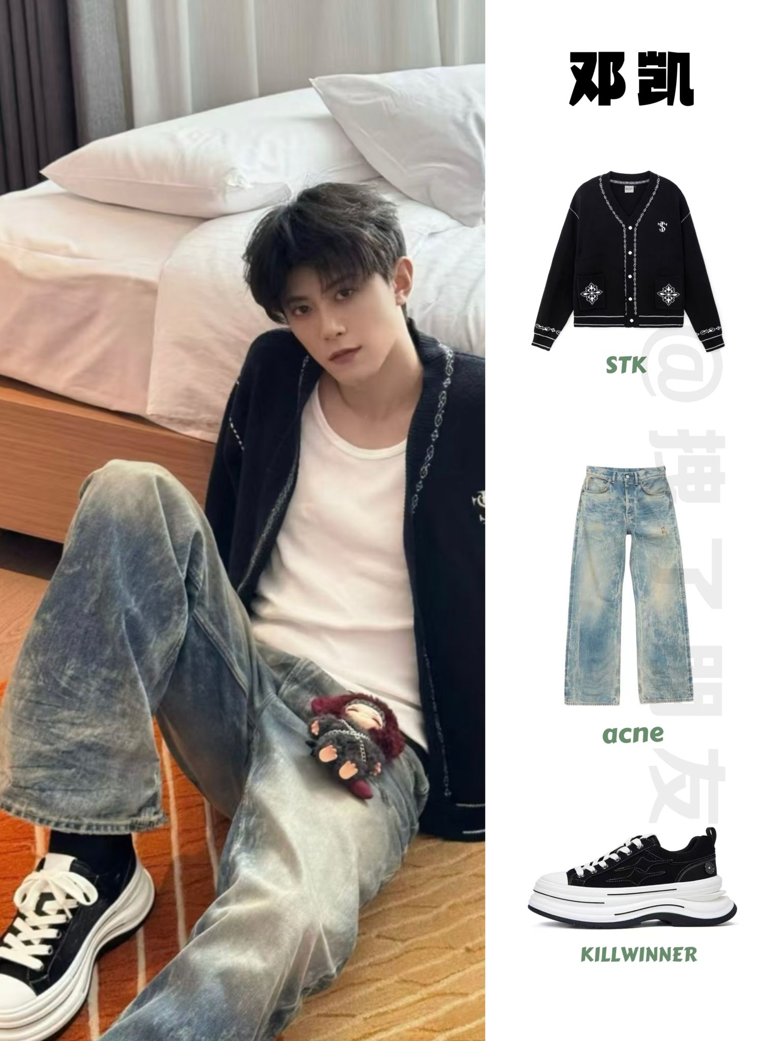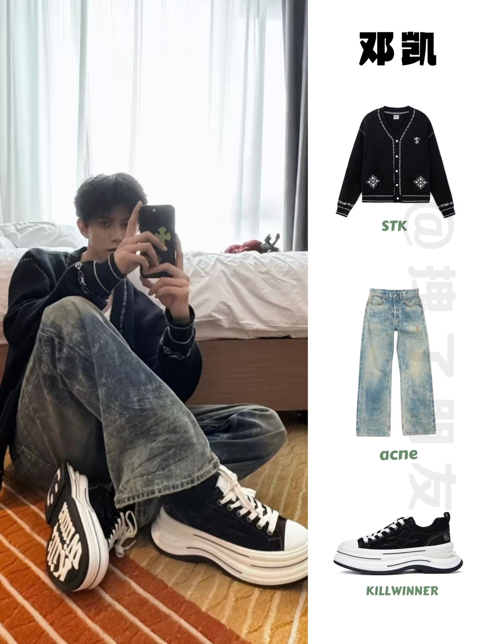 🧥STK美式复古休闲宽松西兰卡V领普明线开衫毛衣 👖Acne2021M水洗做旧拉链直筒牛仔裤 👟KILLWINNER离火系列黑色低帮帆布鞋
