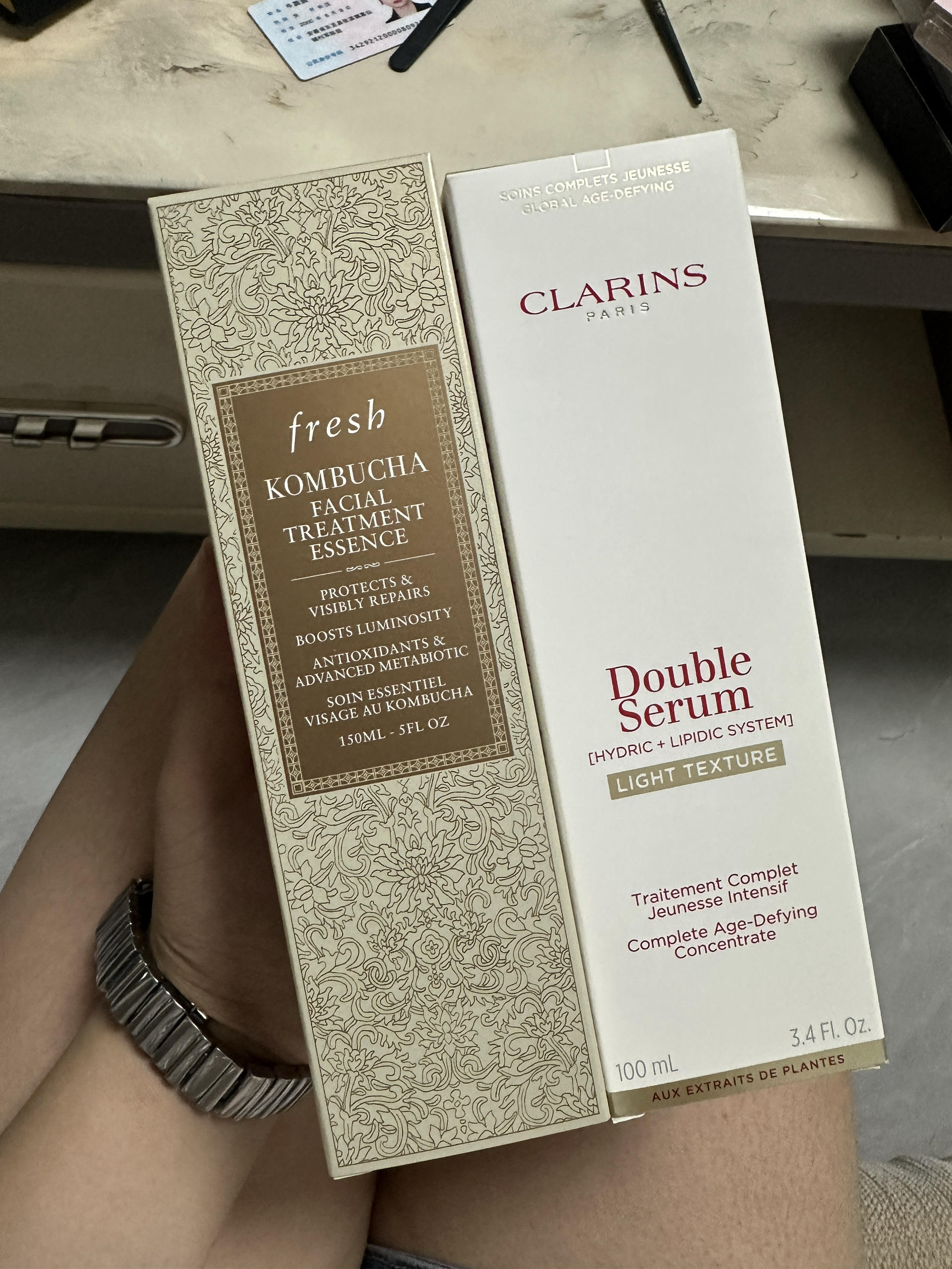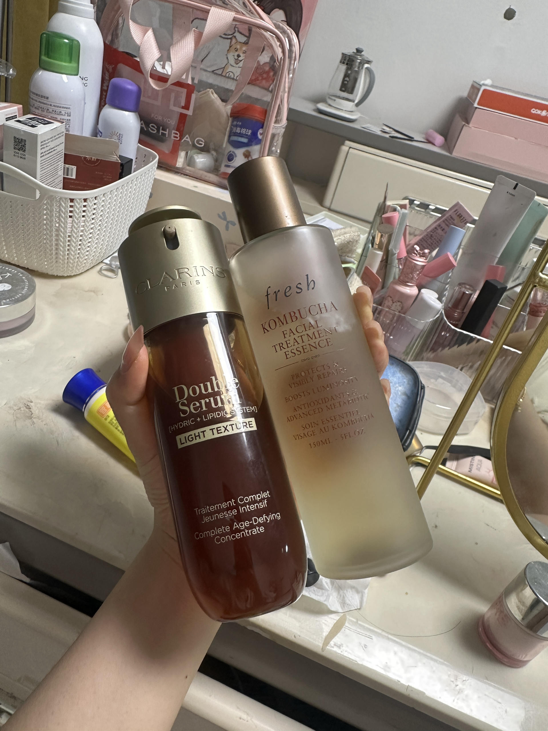 馥蕾诗红茶水➕娇韵诗双萃精华 作为入手的第一批抗老产品 搭配一起用绝了,用了两天脸上摸着滑嫩很多 去黄我不知道是不是心理原因 ,好像有点效果 看不太出来 ,可能一个月才有效果 ,空调房睡醒脸也不会干,水很容易吸收,精华抹着不粘腻,干皮本命水➕精华 ,干皮冲就行了