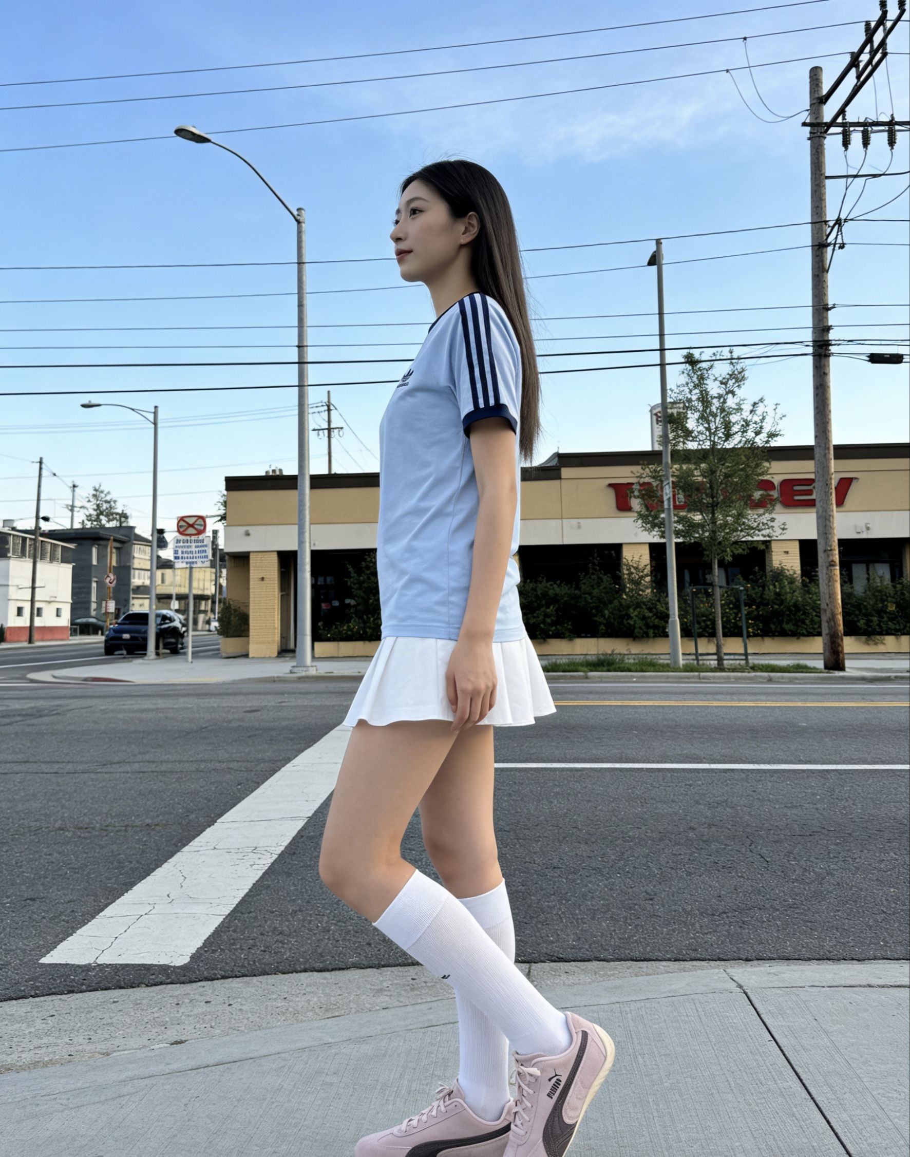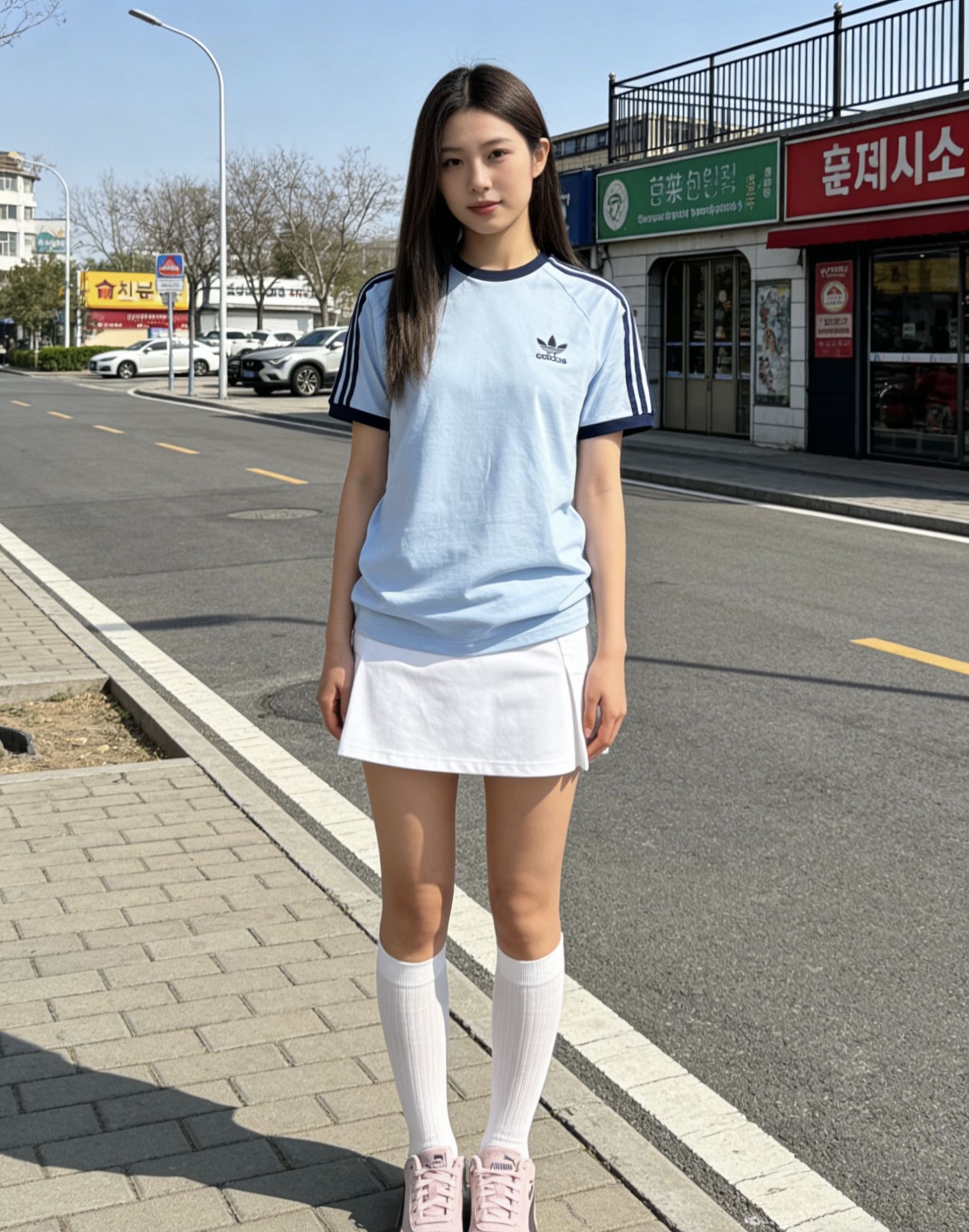 🔥复古运动风yyds!阿迪三叶草浅蓝短袖太懂辣妹了!经典三条纹+藏蓝包边,纯棉质感柔软挺括,短款剪裁对小个子超友好。搭配白短裙+白袜,纯欲感拉满! 粉棕彪马Speedcat赛车鞋直接封神!绒面质感高级,上脚软乎乎还显腿长,蓝粉撞色太有夏日氛围,全程挡脸自拍都挡不住的好身材,出街回头率百分百!
