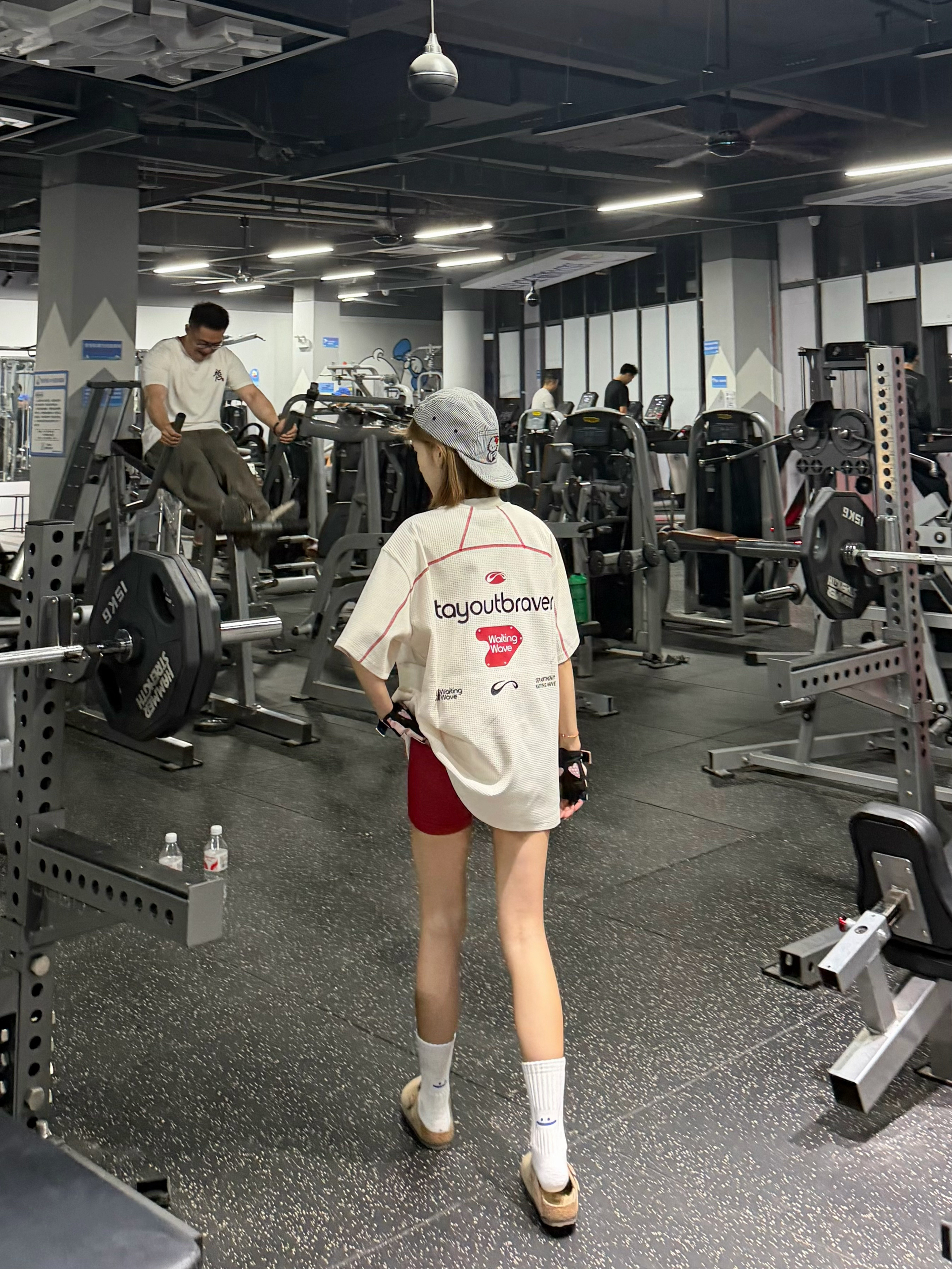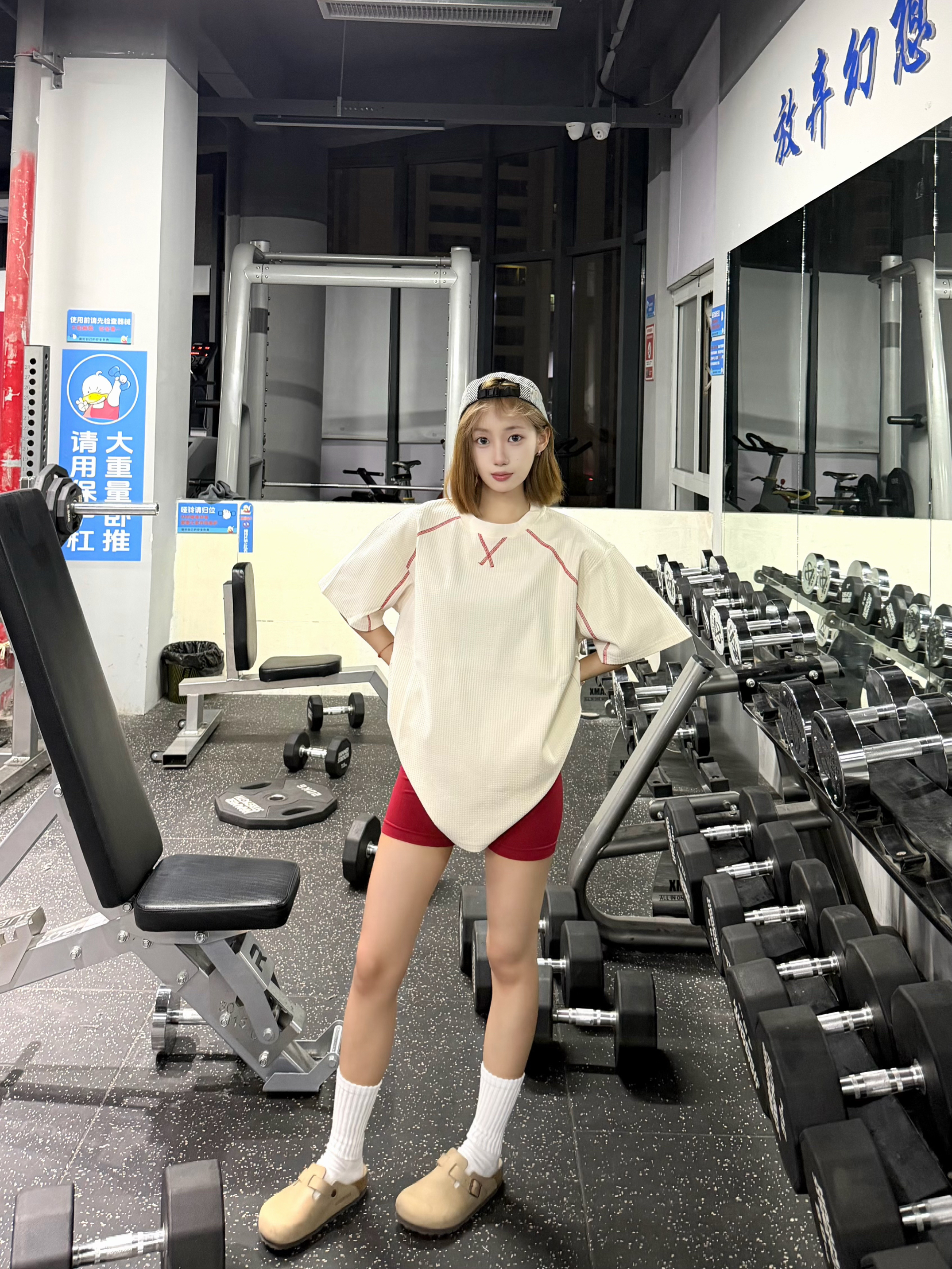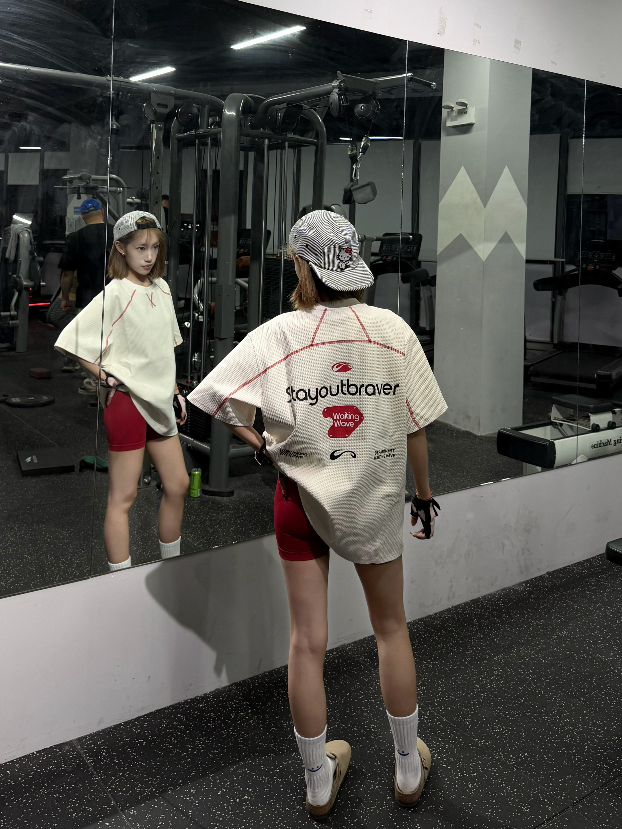 谁懂啊!这件华夫格短袖真的是健身穿搭神助攻!宽松版型藏肉又透气,背后印花潮到犯规,配红短裤+白袜勃肯鞋,休闲感拉满!撸铁时自在无束缚,出片率直接拉满,健身房回头率爆表,运动也要做最靓的崽~