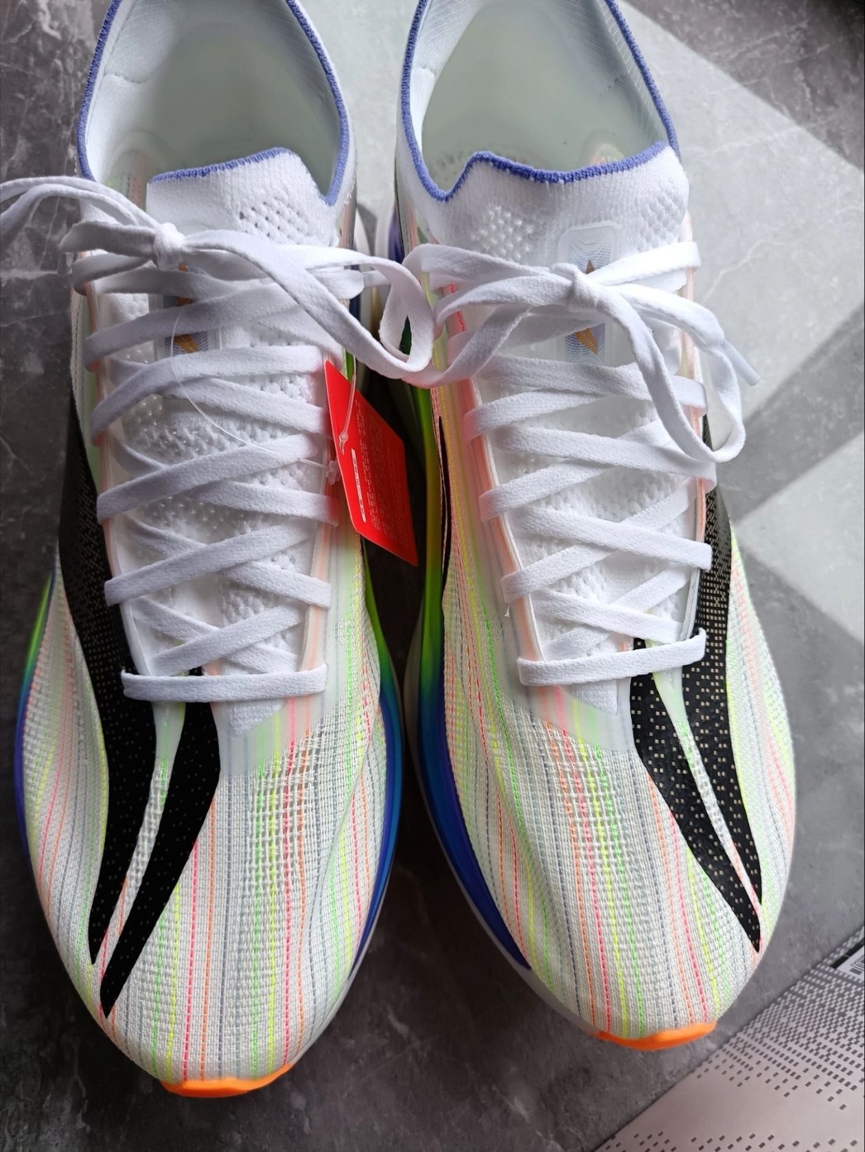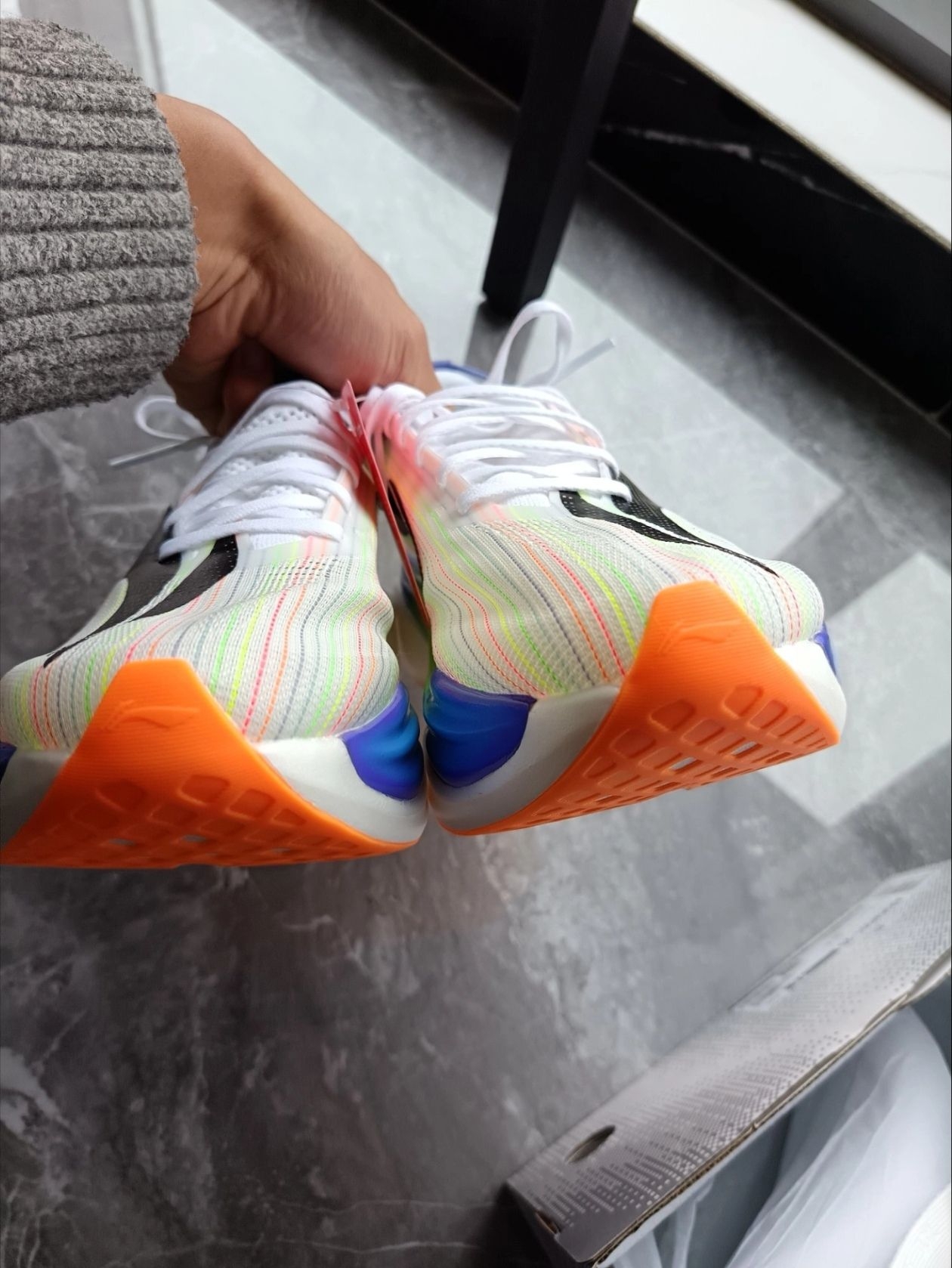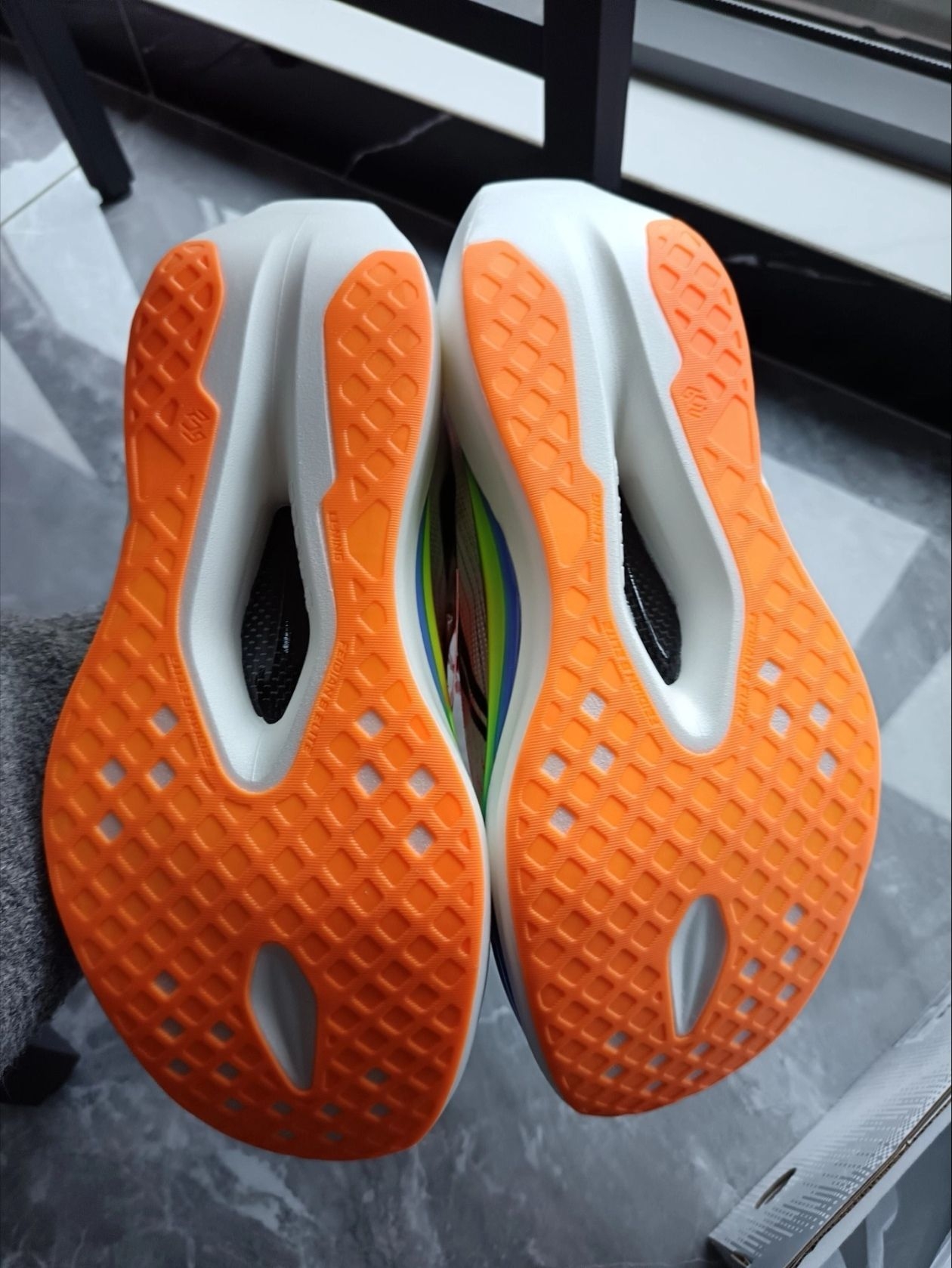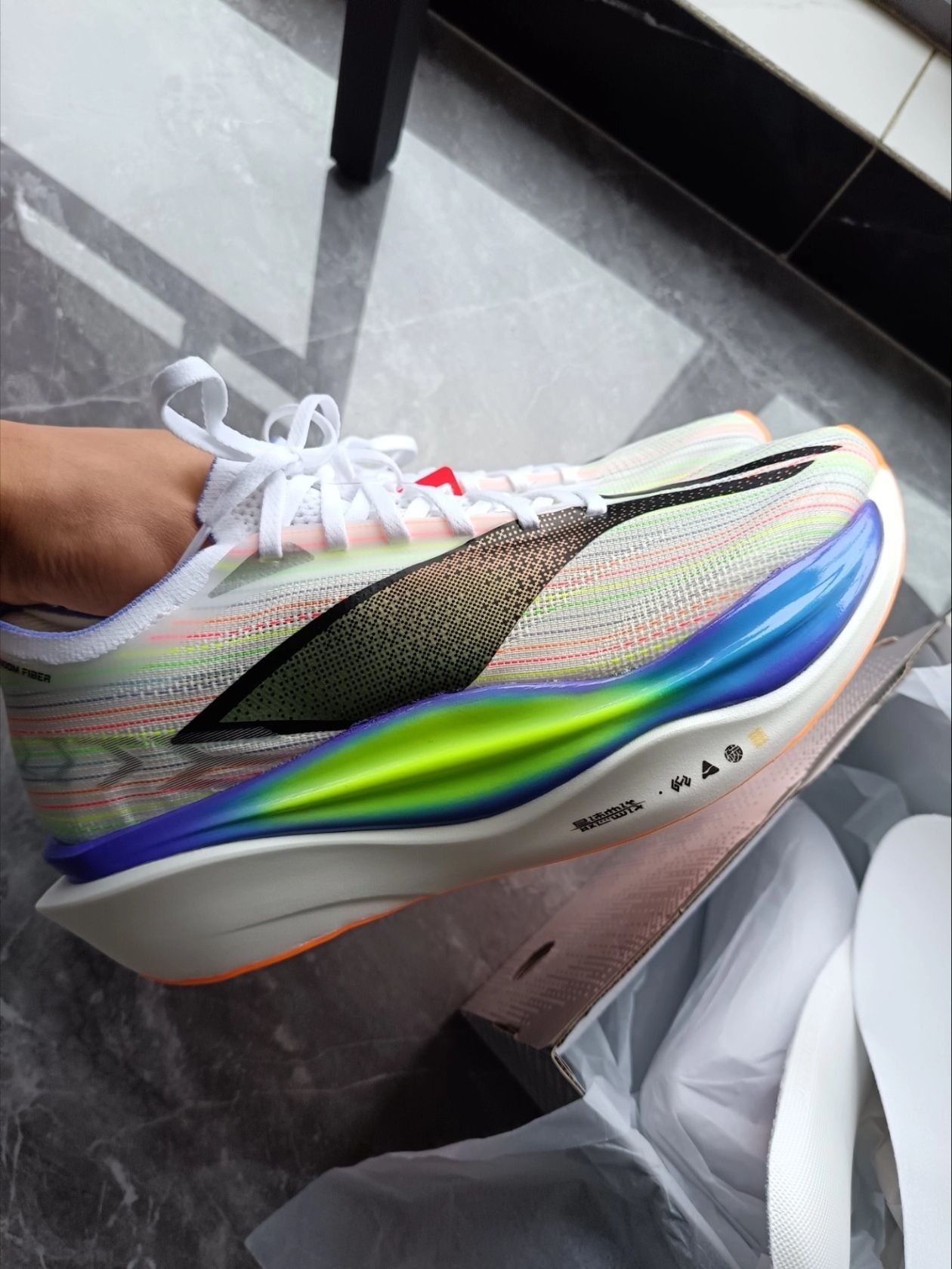 这个是大迫杰东京马拉松同款配色,真的非常帅,而且穿搭方面也很好,这个鞋面色彩非常丰富,穿着软弹,对于pb有很大的帮助,我平时穿鞋都44码的,这双鞋李宁码数太偏大了,然后建议买小半码或小一码,我买的是小一码,我买的43码,然后就多了一点,这双鞋前掌很宽,对瘦脚并不好,这个颜色好看极了,这个李宁新科技胶囊非常软