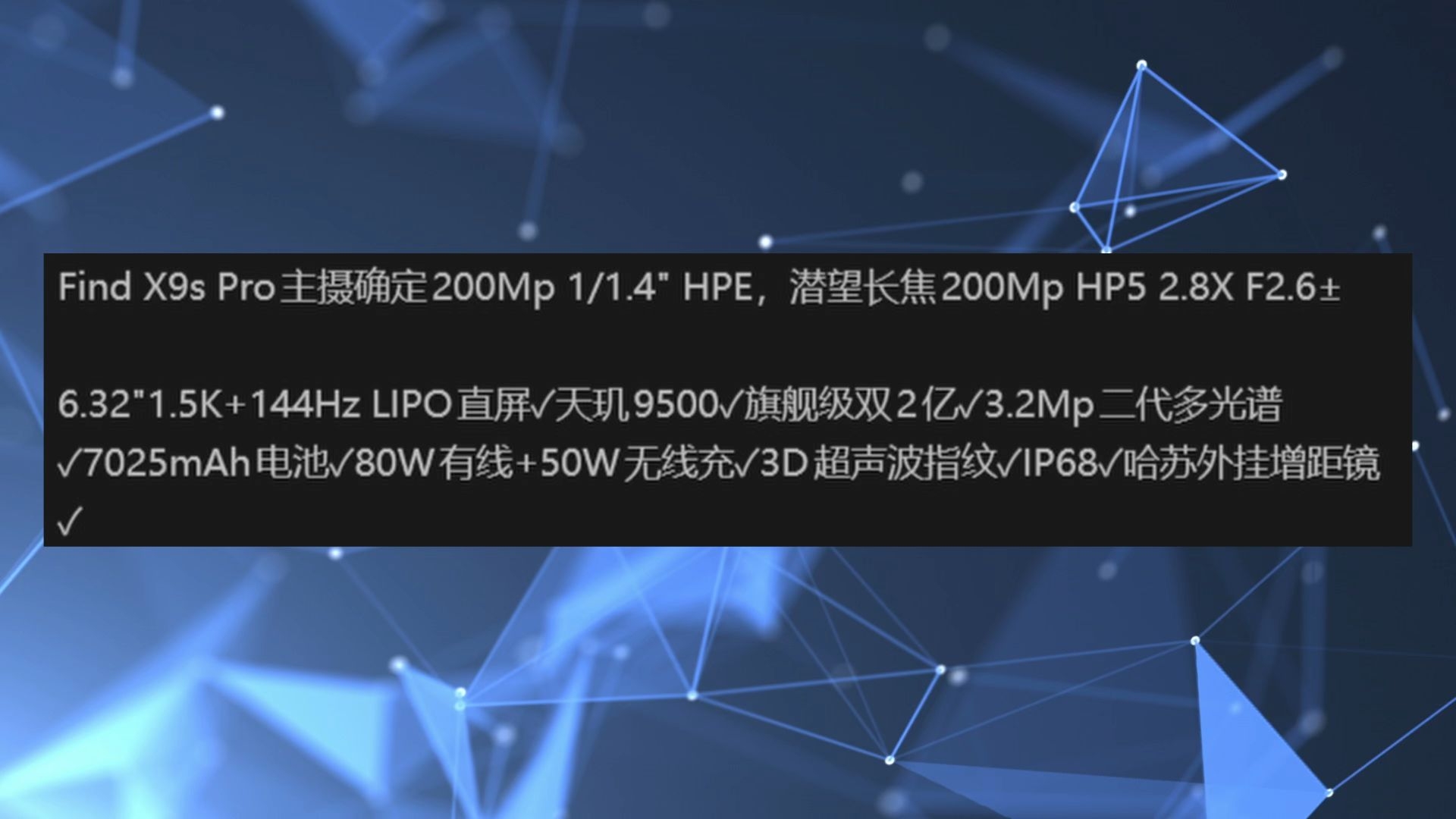小屏影像旗舰?OPPO Find X9s Pro 配置曝光 OPPO这台会在这个月发布 配置网上已曝光 不一定准确 这可能是小屏里影像最强 将会搭载双2亿像素的镜头 主摄2亿像素HPE 1/1.4英寸 带有OIS防抖 潜望长焦2亿像素HP5 光圈F2.6左右 大约2.8X 等效 65毫米焦距 短一点 不过2亿像素有更多裁切空间 带有OIS防抖 和一个超广角 和一个多光谱传感器 也支持哈苏增距镜...