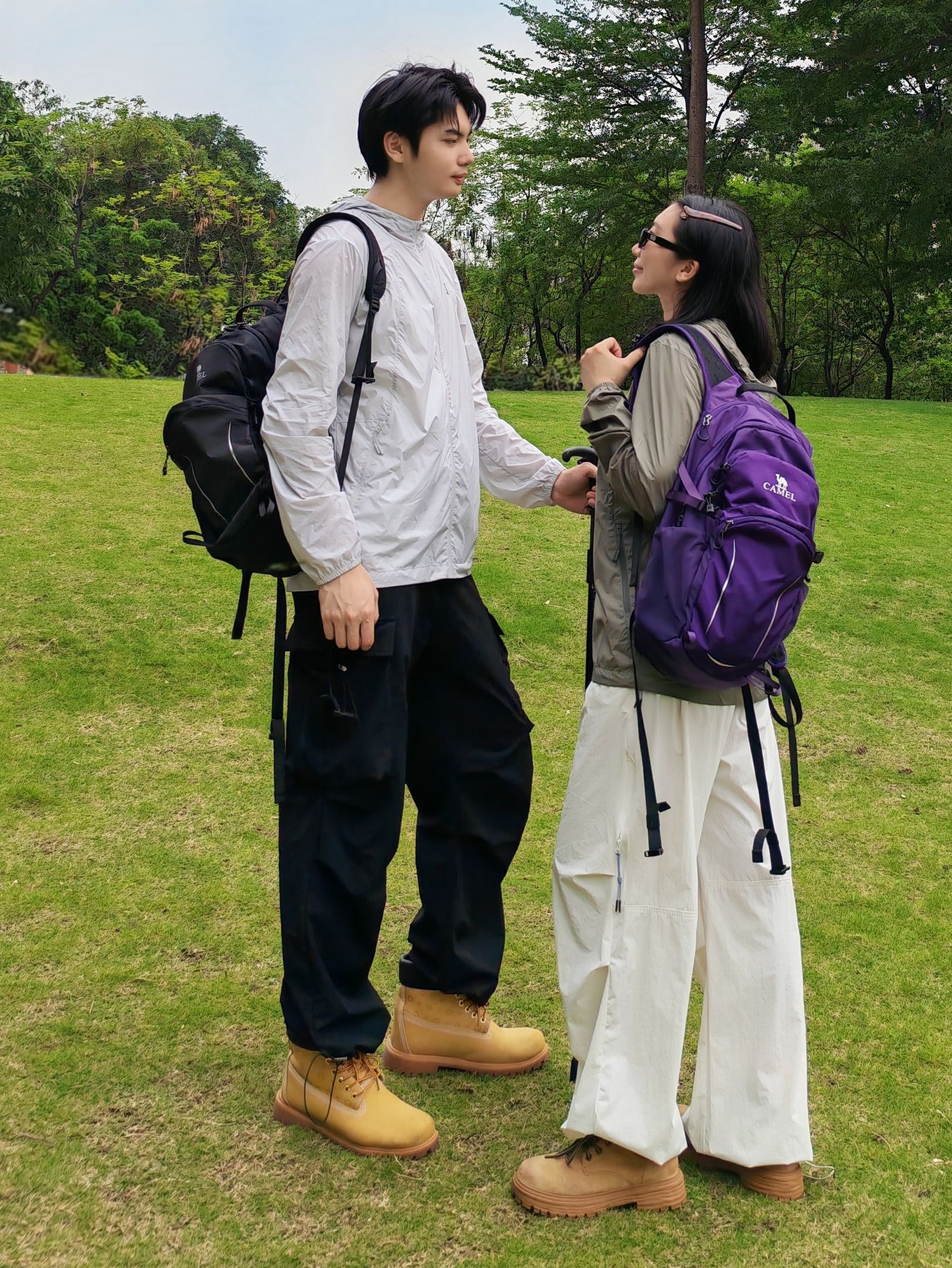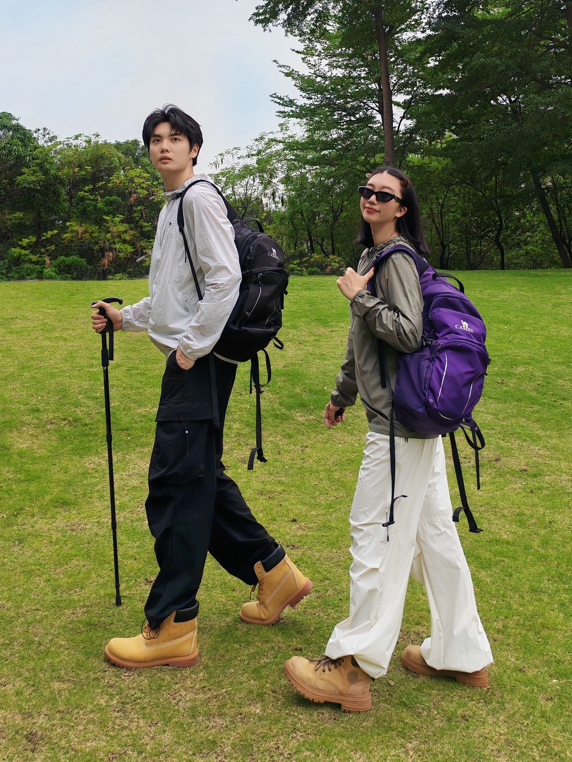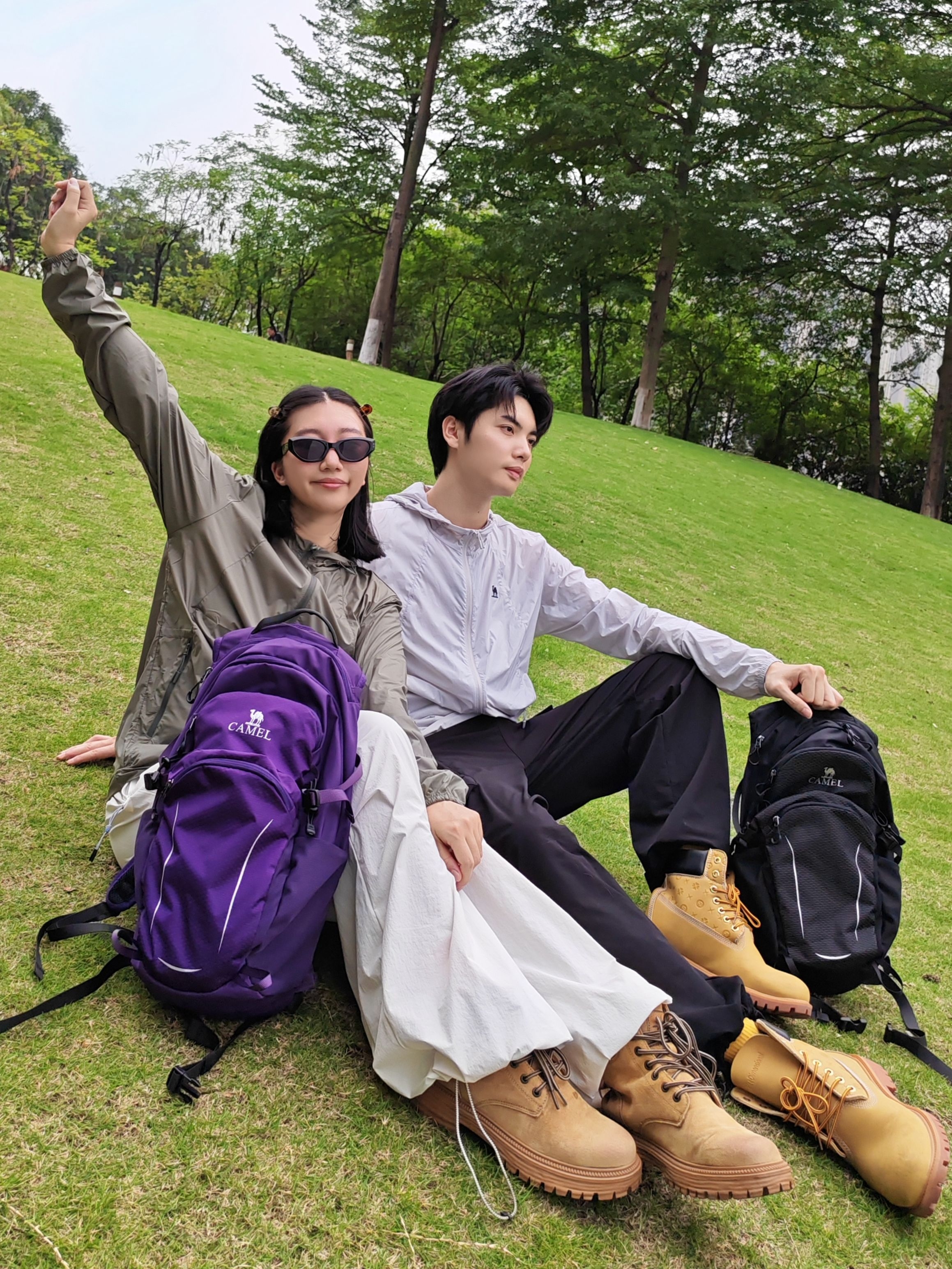 和喜欢的人一起徒步太治愈啦! 男生白冲锋衣+黑速干工装裤,黑背包利落帅气; 女生卡其冲锋衣+米白阔腿速干裤,紫背包+墨镜松弛感拉满。