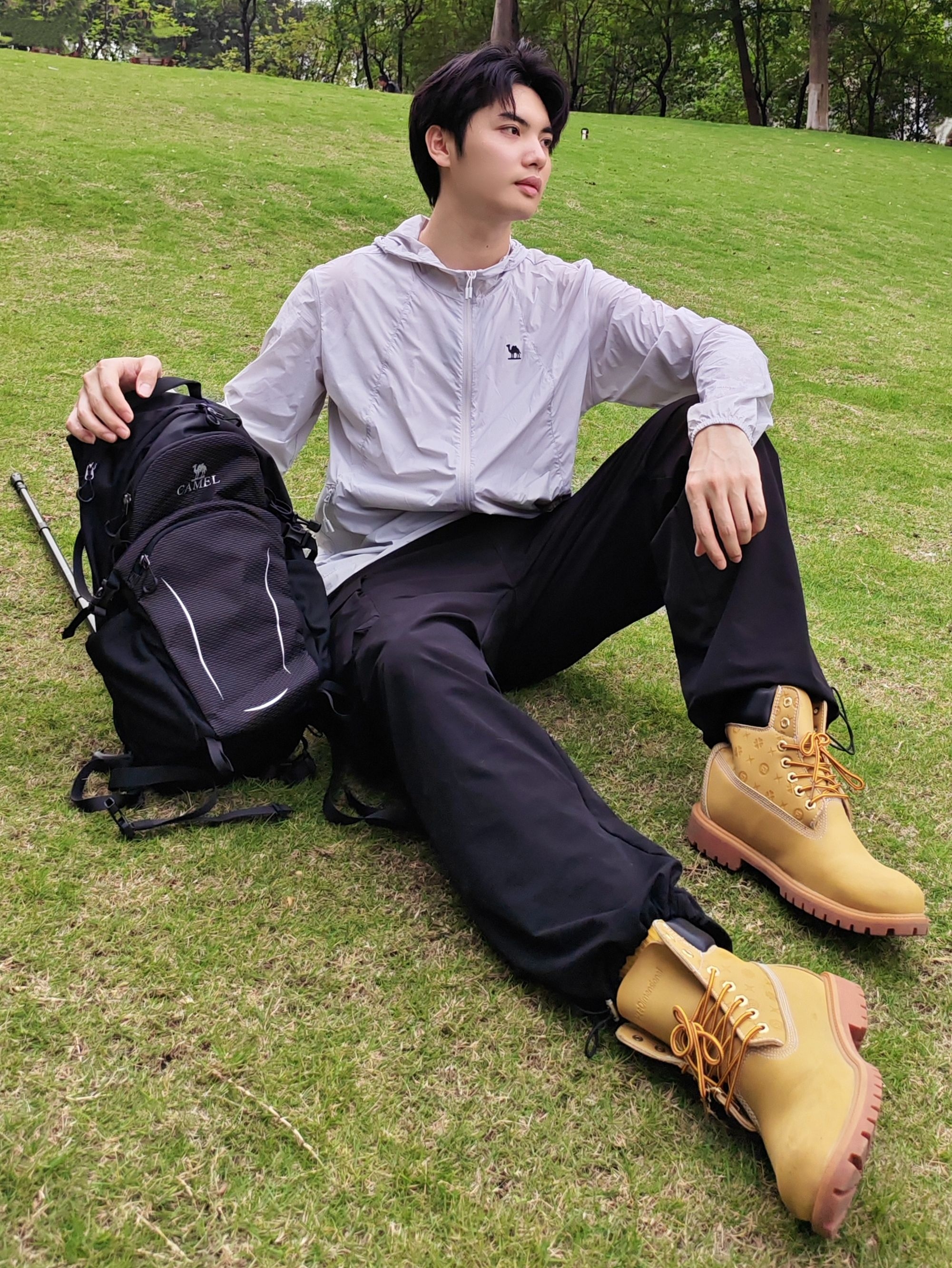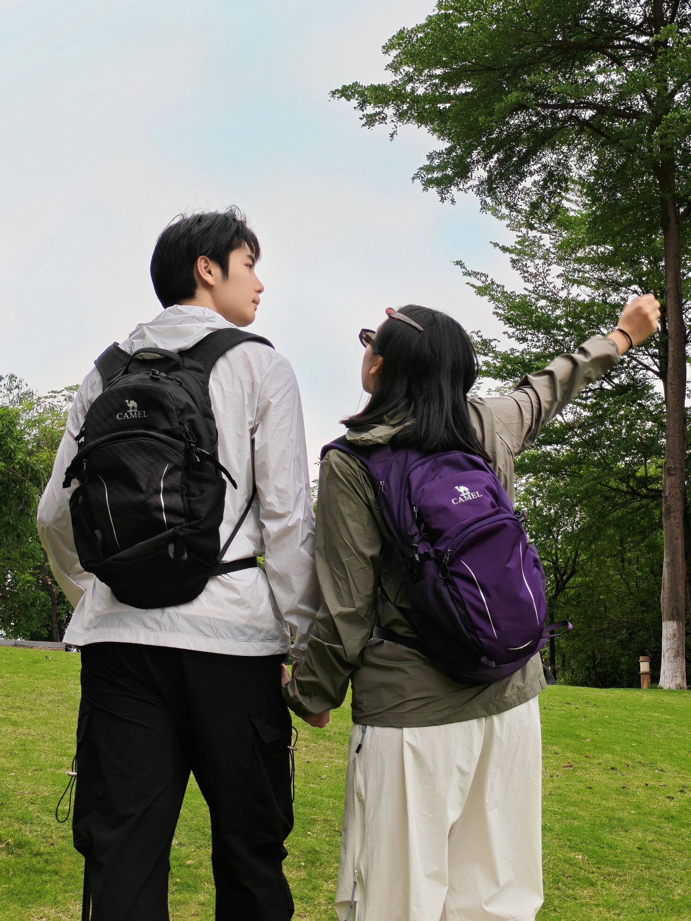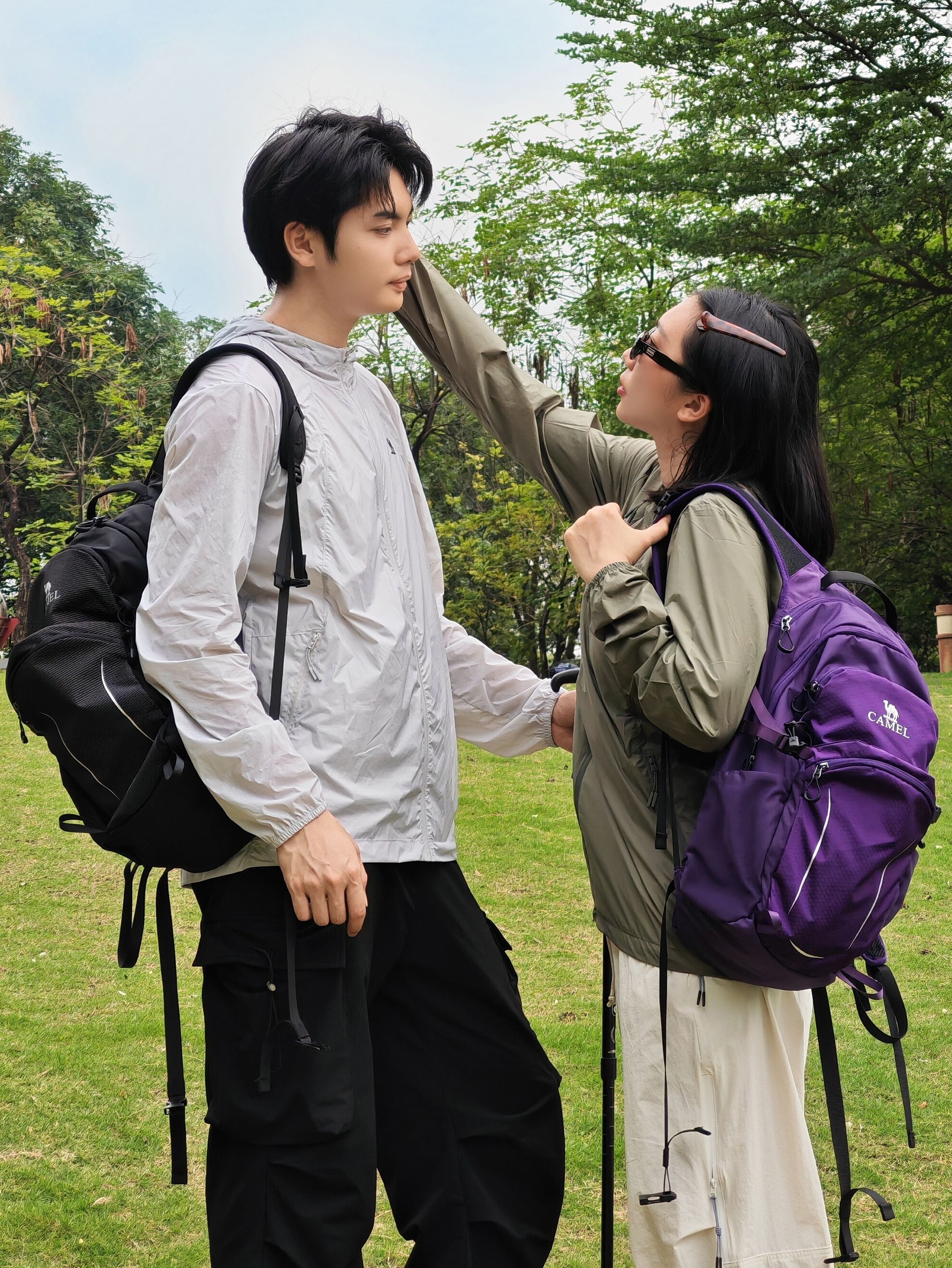 和喜欢的人一起徒步太治愈啦! 男生白冲锋衣+黑速干工装裤,黑背包利落帅气; 女生卡其冲锋衣+米白阔腿速干裤,紫背包+墨镜松弛感拉满。