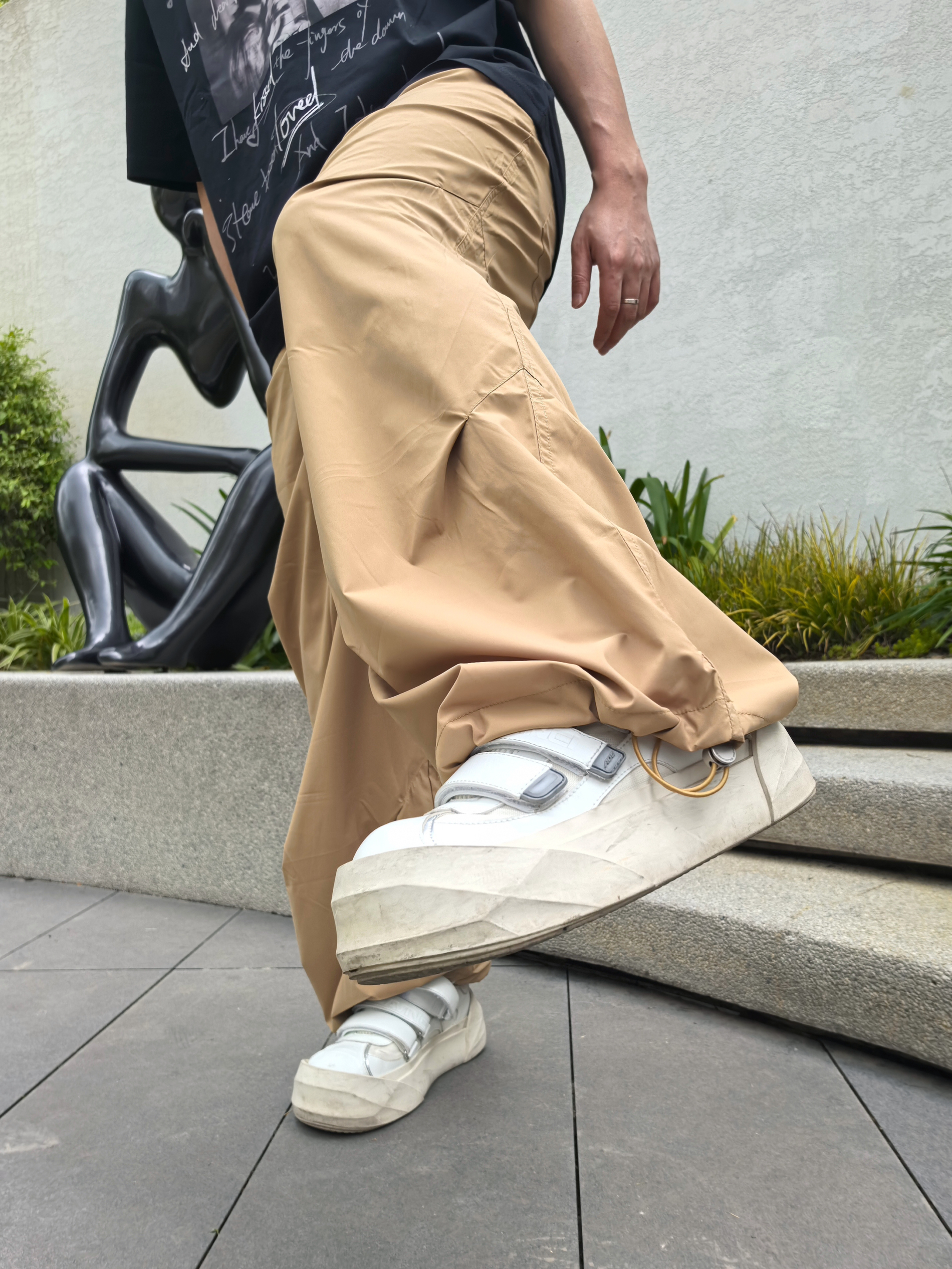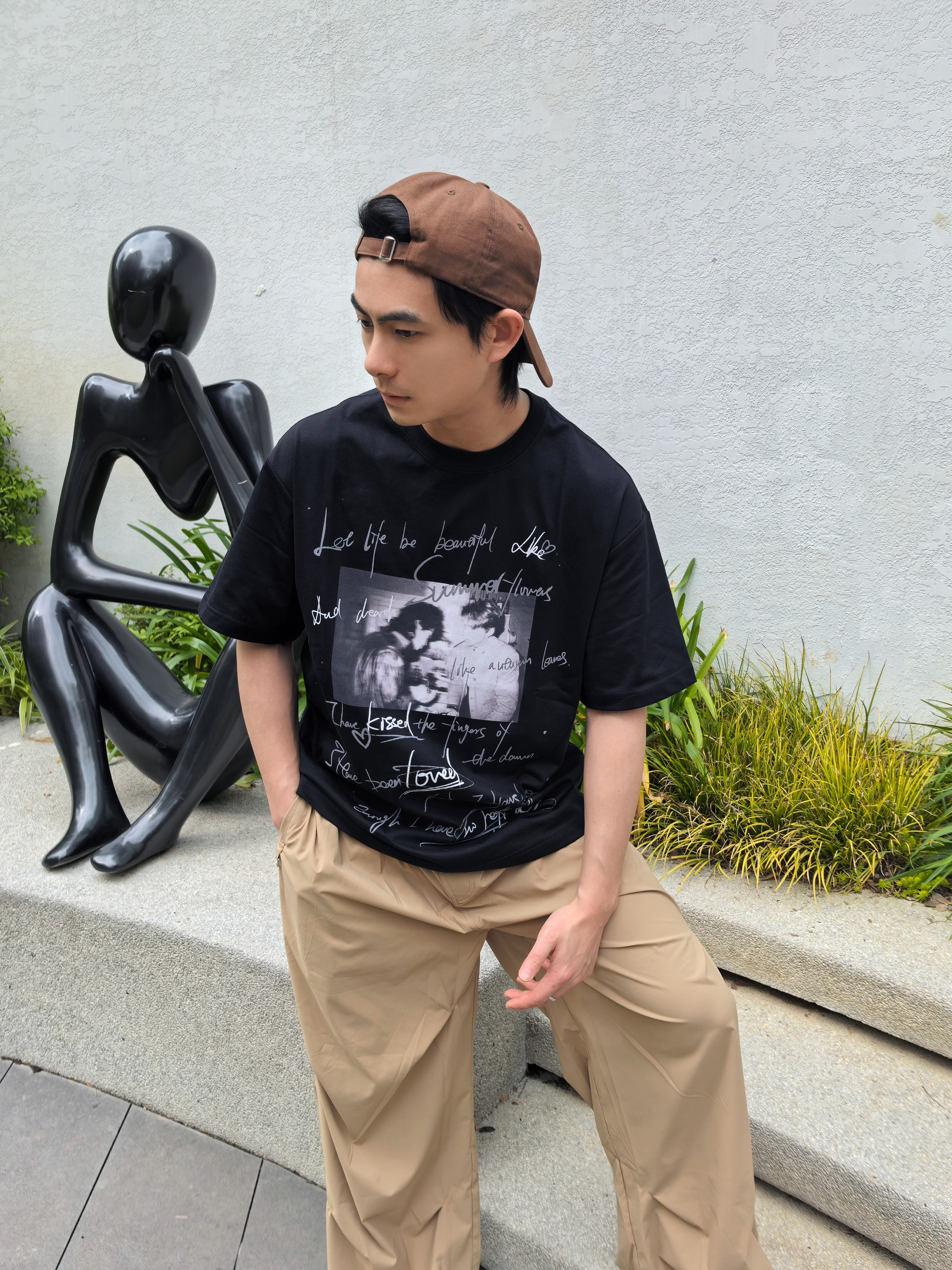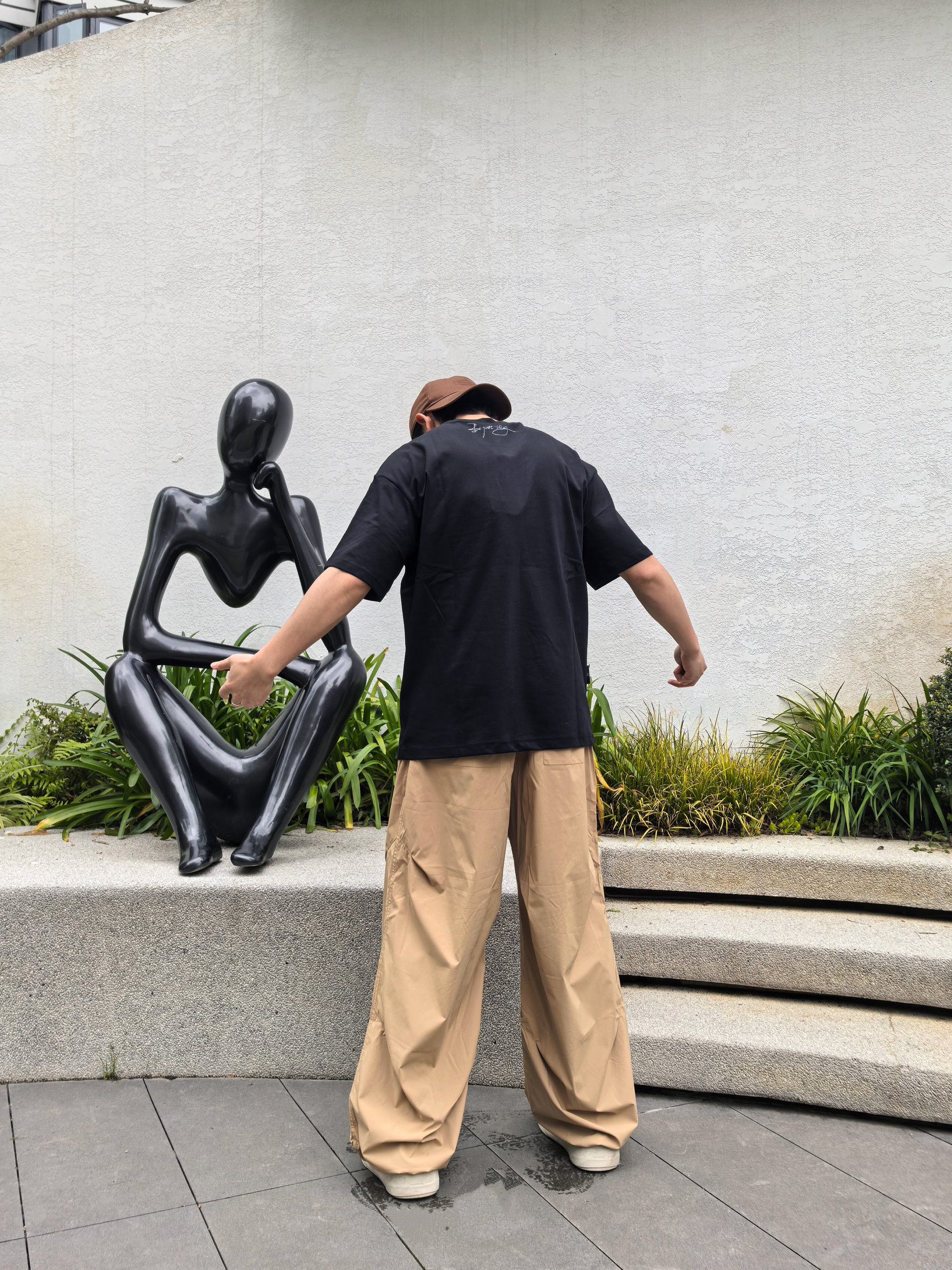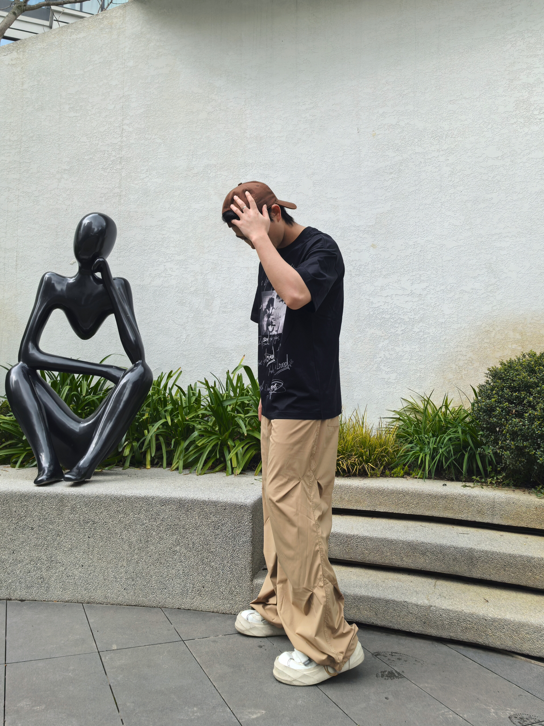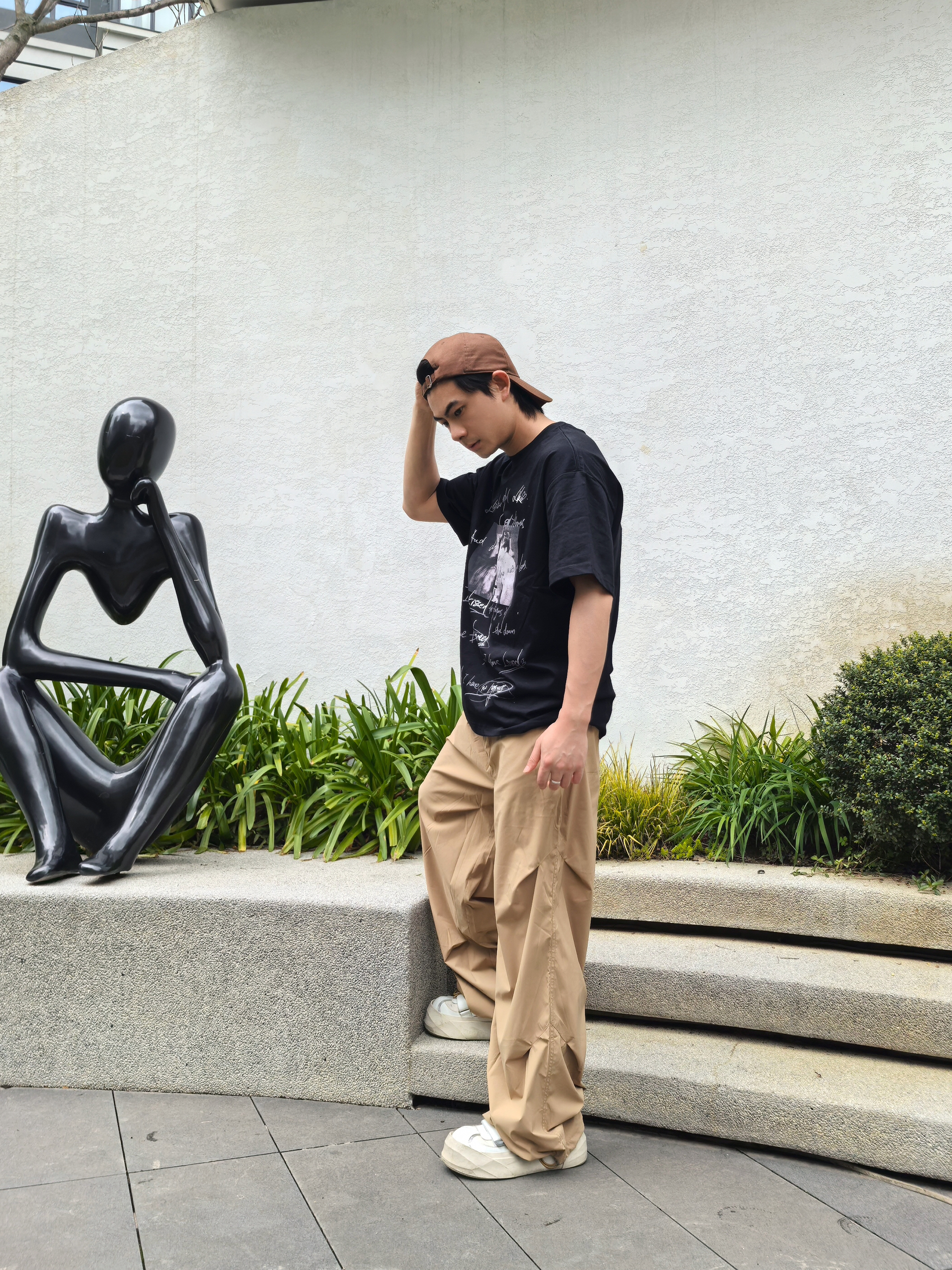 🩵最近我在尝试各类颜色的裤子来搭配 今天我上身这套就是来自BJHG的短T以及一条休闲裤 🏃相对来说整套搭配,我会觉得这条裤子更出彩,一个伞兵裤版型,属于特轻薄的质感,风吹就能明显感受到它的松弛感 而上衣我则是搭配到复古感Te浓的纯黑T,身前的字母印花是比较特别的 这几天穿这套户外徒步⛰️的话,如果是有太阳我觉得正合适,但是也需要带件轻薄外套更合适 🏷️衣服M裤子L,整体偏宽松