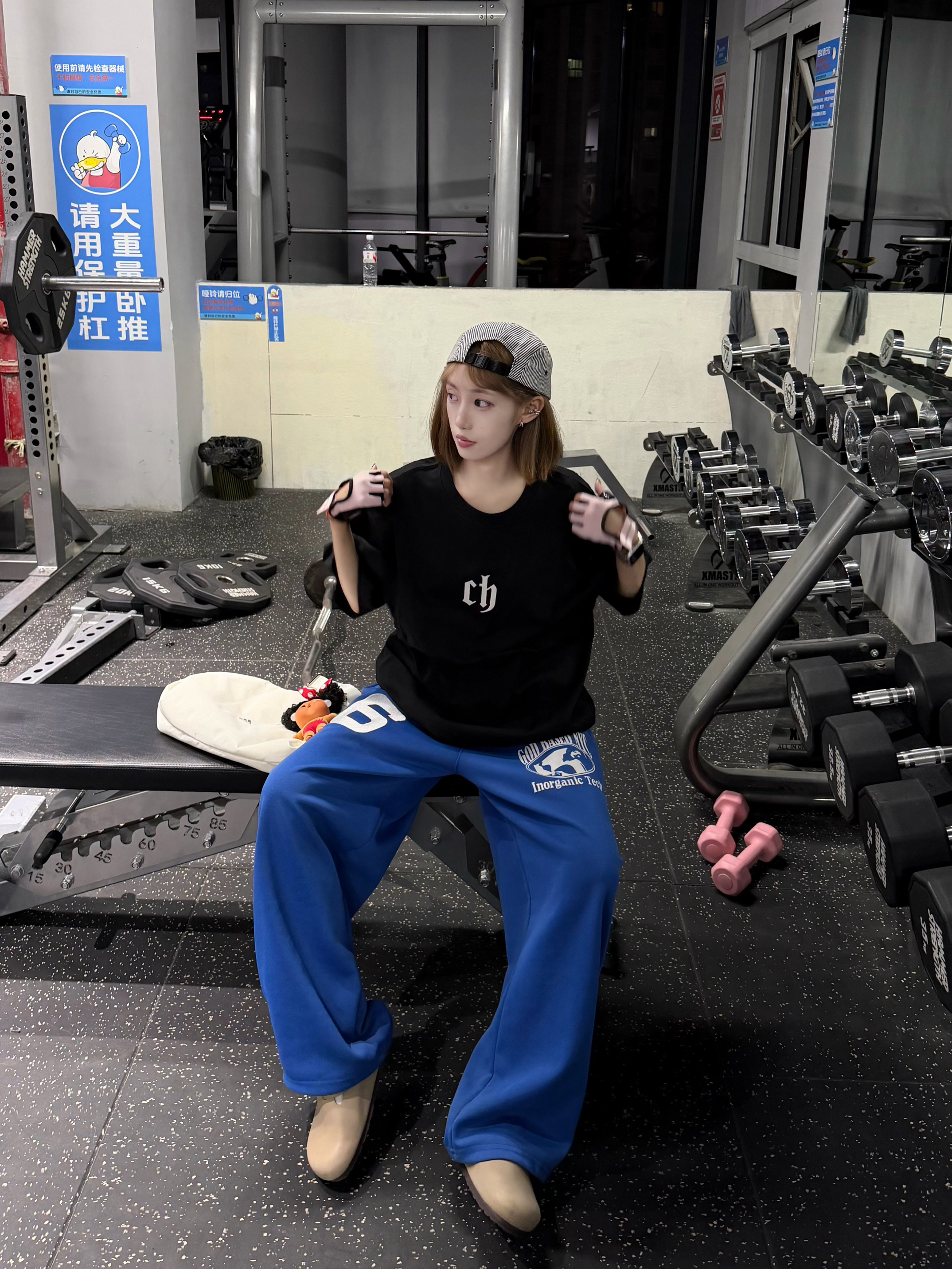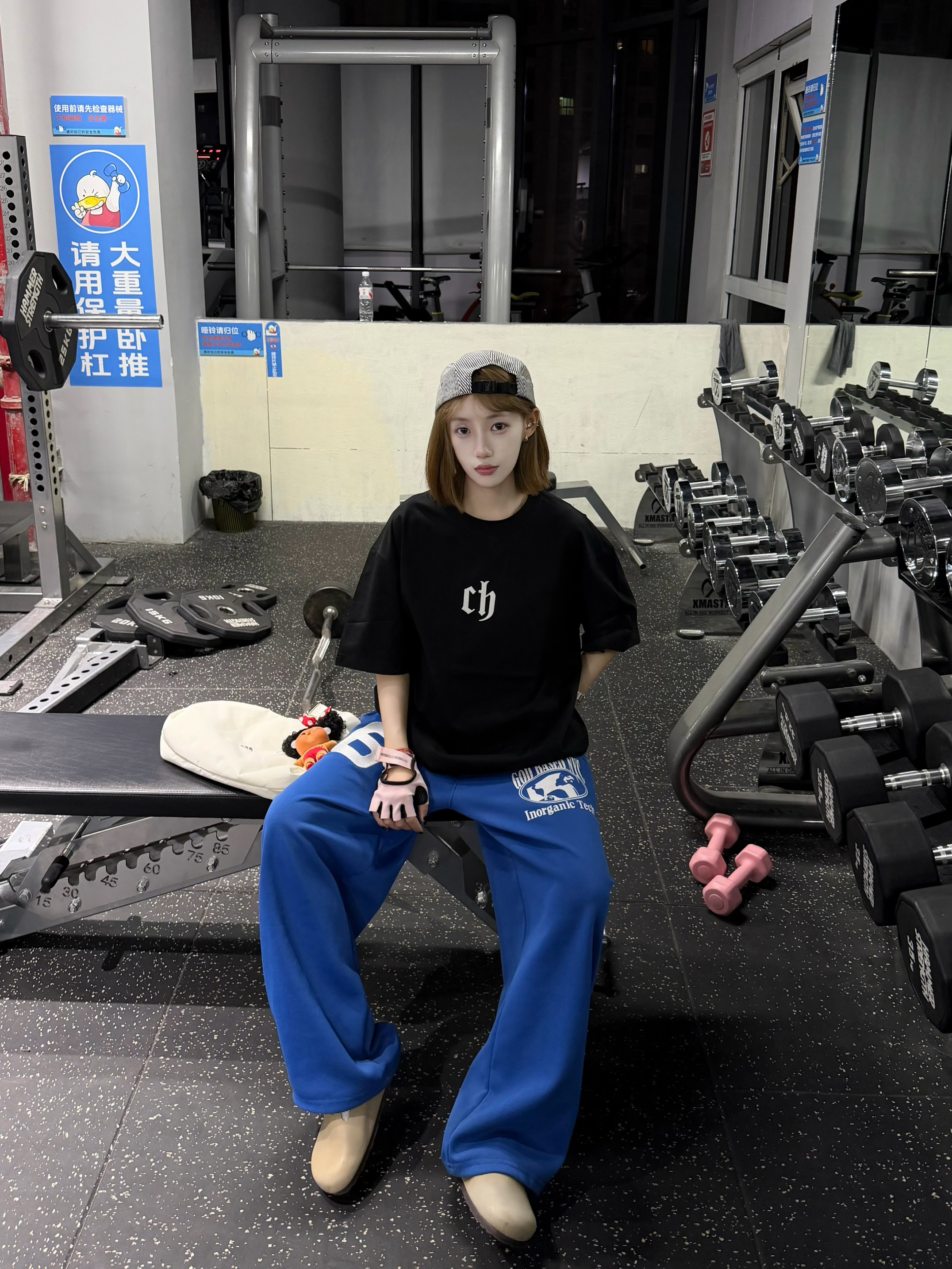 家人们谁懂啊!这件简约黑T真的是健身人本命!宽松版型藏肉又不闷汗,小logo设计低调又潮,撸铁摆拍都超上镜✨ 搭克莱因蓝运动裤,健身房直接变身穿搭博主,舒适感拉满还显腿长,日常出街也能直接穿,懒人辣妹穿搭直接抄作业!