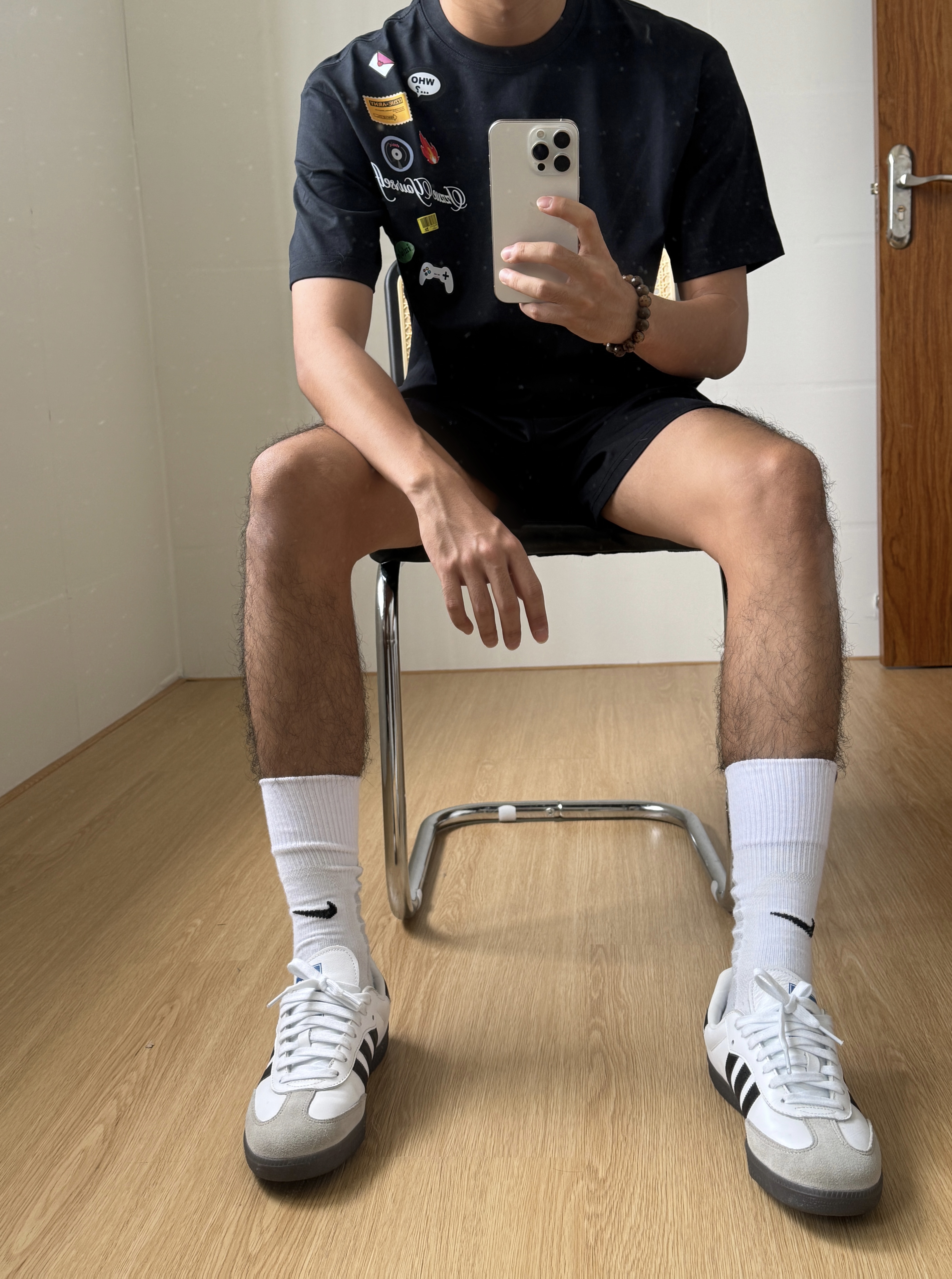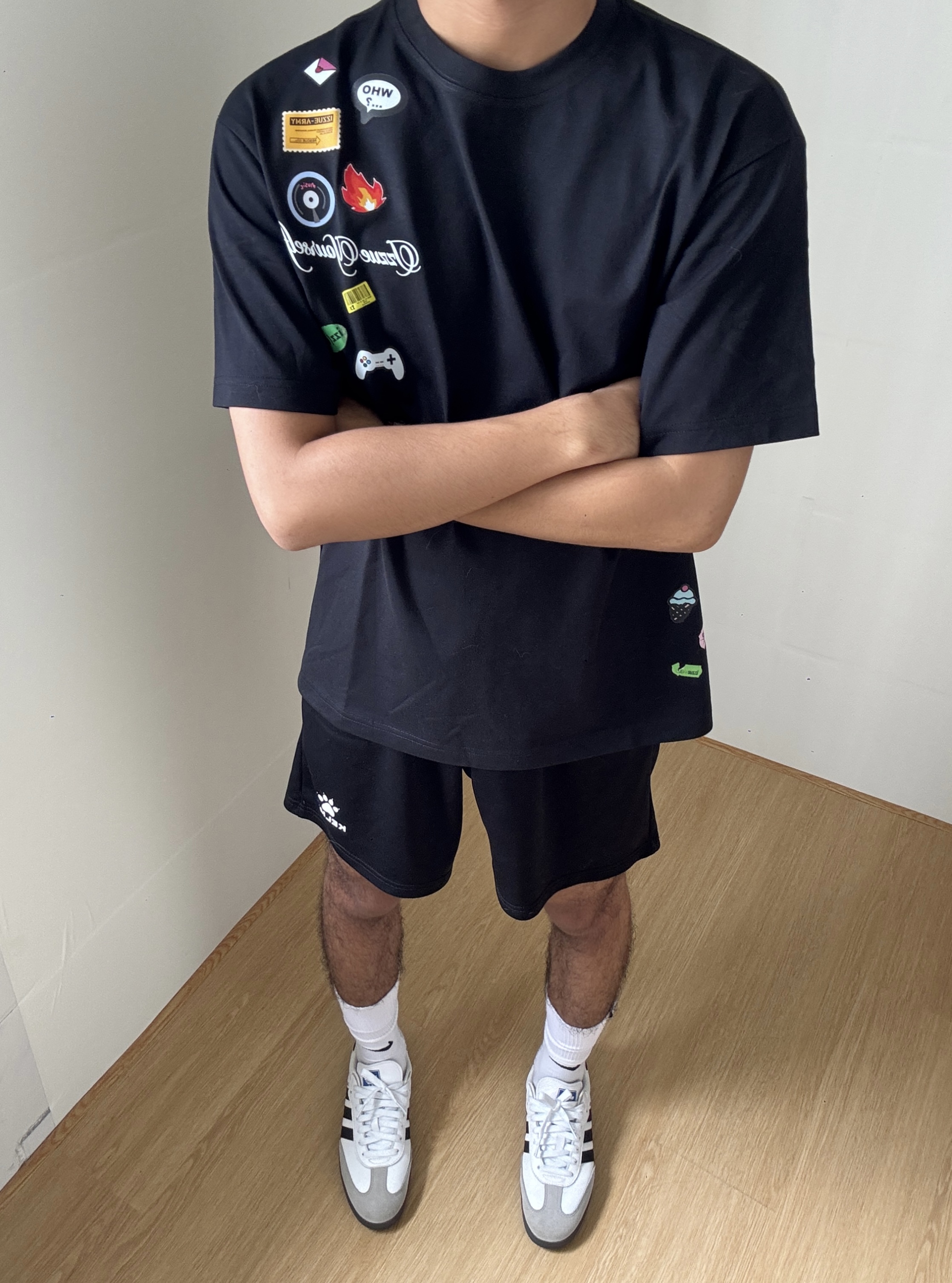 基础款真的是穿搭常青树!满印的趣味小图标黑T够吸睛,夏日适配,细节感拉满又不浮夸,上身宽松不挑身材。 搭配同色系运动短裤,清爽利落,白袜+德训鞋充满少年感日常出街、运动通勤都适配。 舒服自在,简单干净的松弛感✅