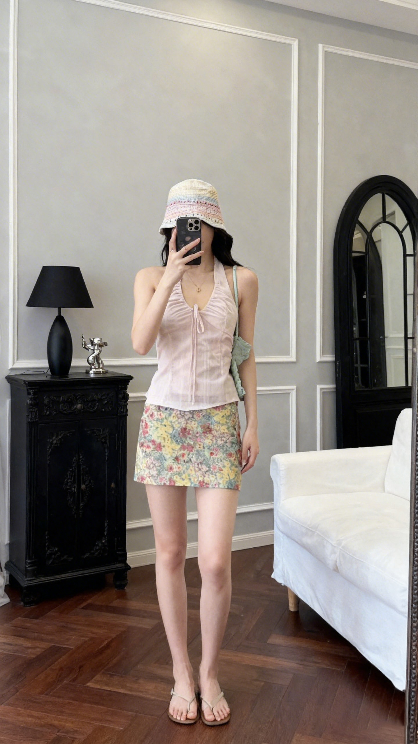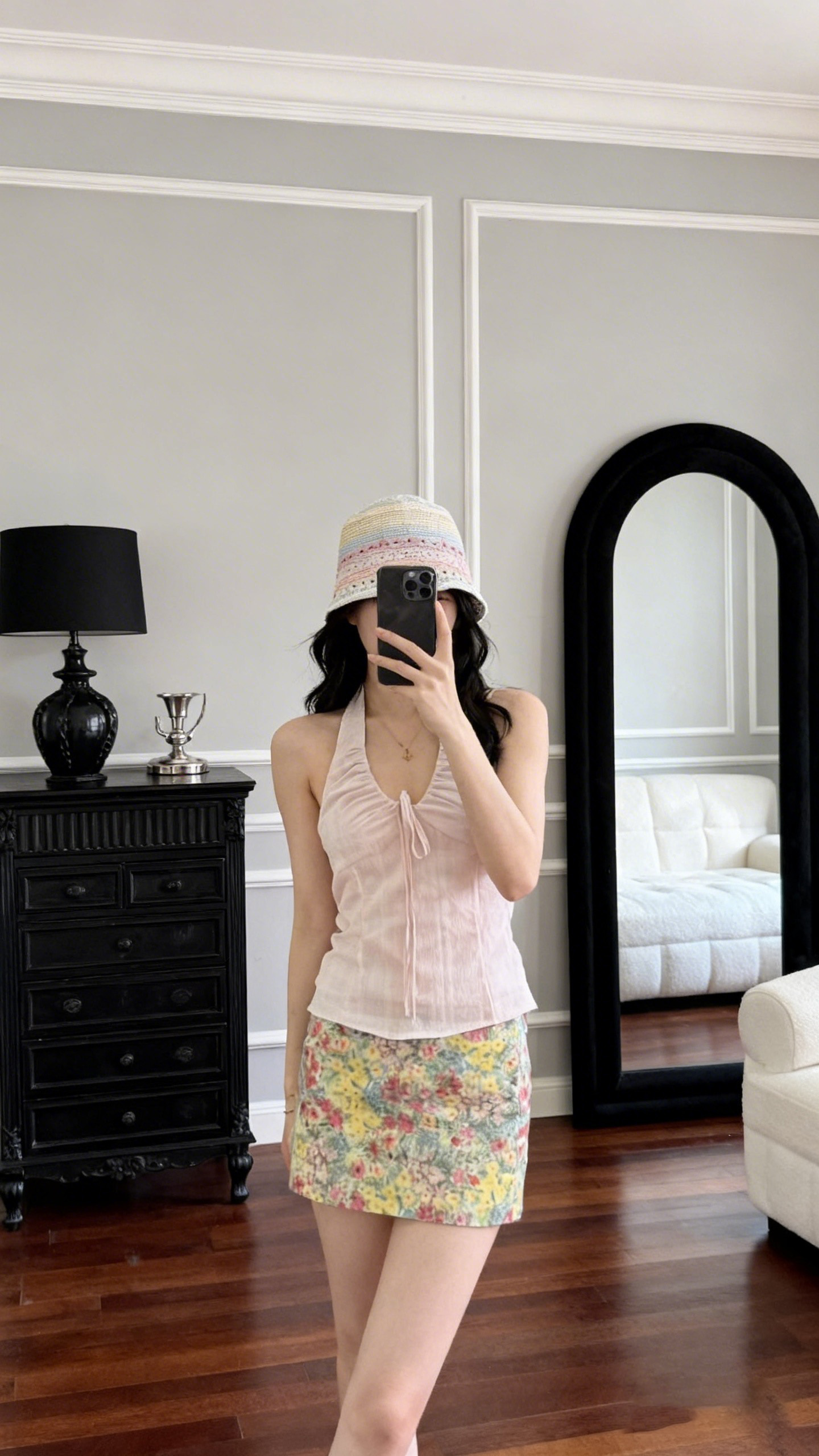 淡粉色挂脖吊带自带纯欲感🪷 抽绳设计超显腰细油画感碎花半裙复古又灵动 彩虹草编帽👒直接把度假感拉满一套上身温柔又松弛通勤约会出街都适配,夏天穿清爽又出片 # 韩系穿搭 #夏日 ootd #松弛感穿搭 #挂脖上衣 #碎花半身裙