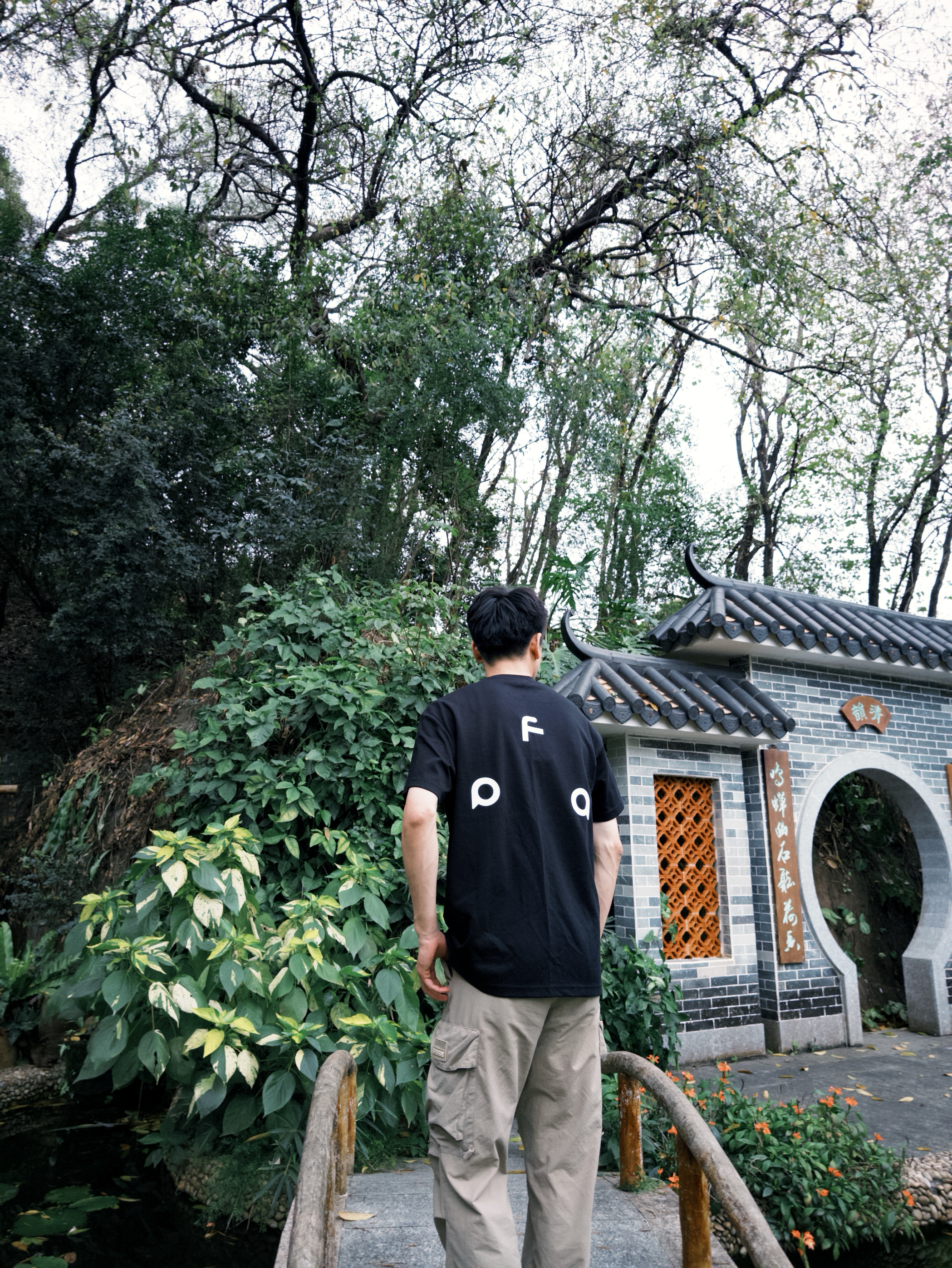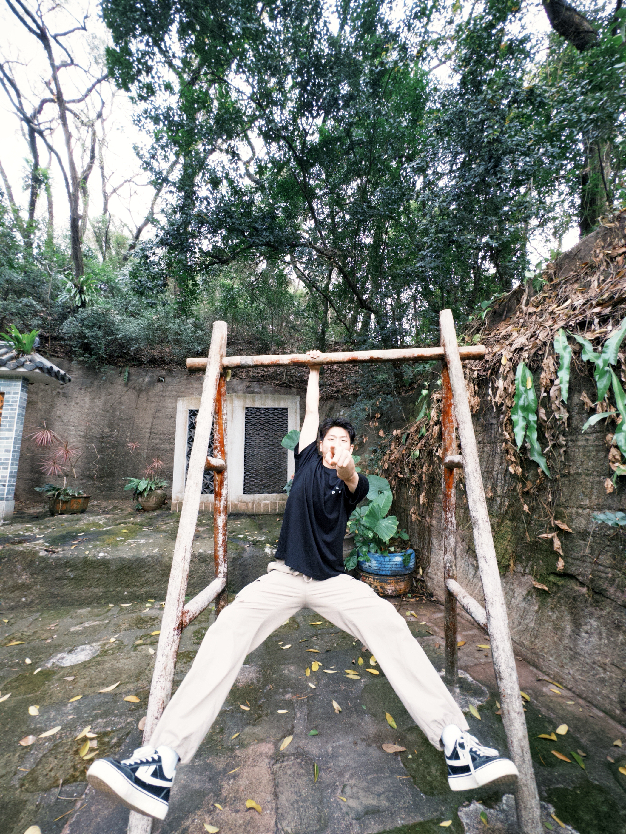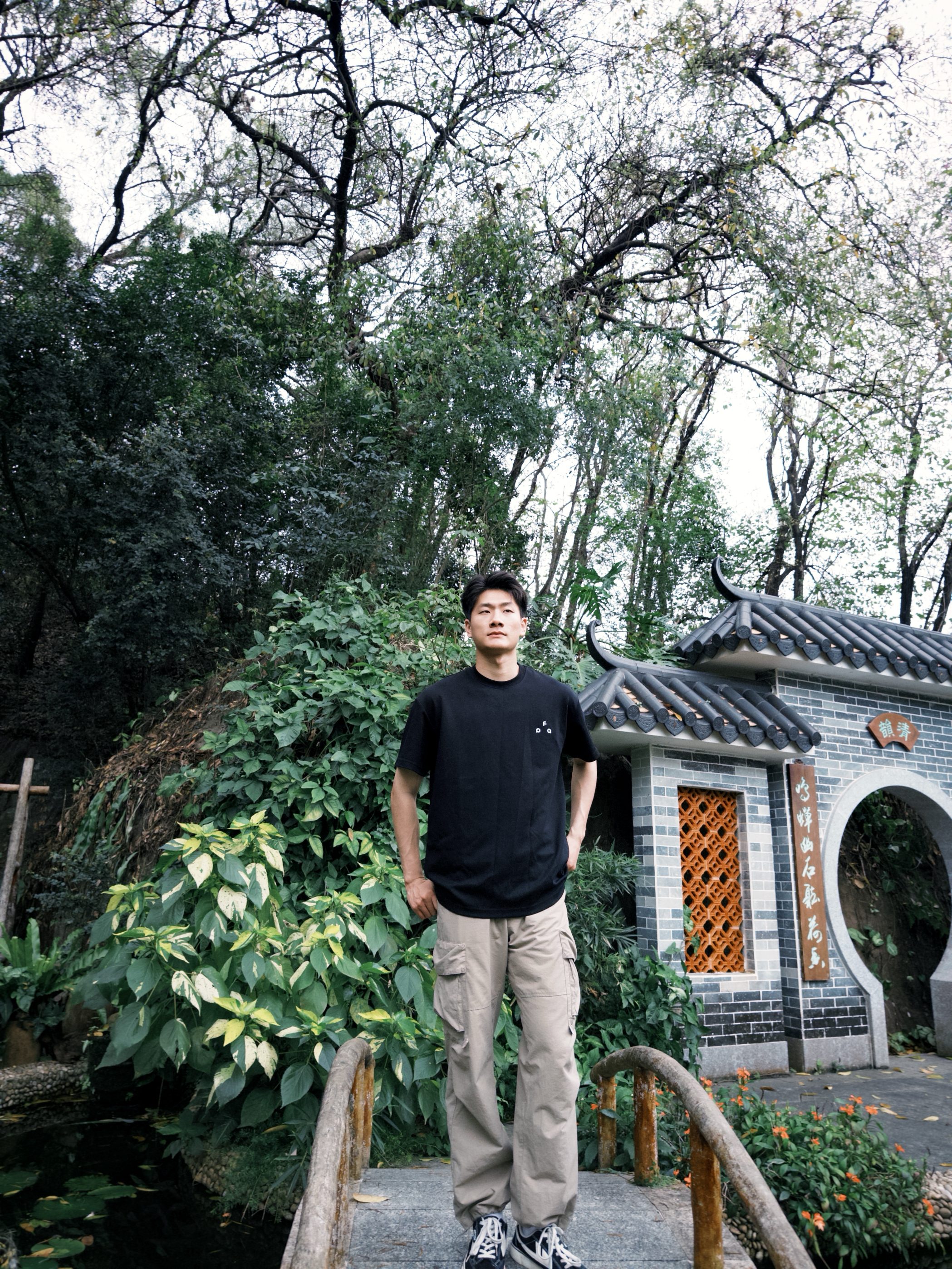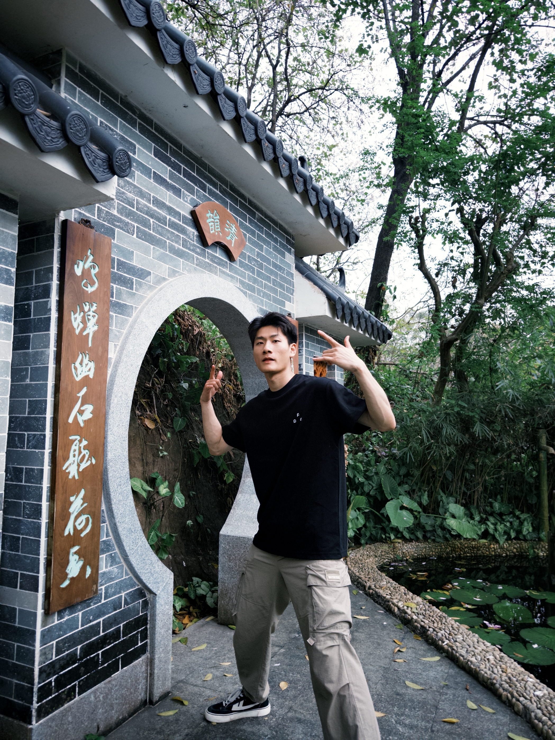跑到这个园子里摆个pose,穿这套真的太对了! 黑色短袖简简单单,却很显精神,面料透气不闷汗。卡其色工装裤一搭,日常走路、晃悠完全没束缚,口袋设计还挺有细节感。配双帆布鞋,逛公园、打卡这种古风建筑,舒服又出片,谁穿谁好看