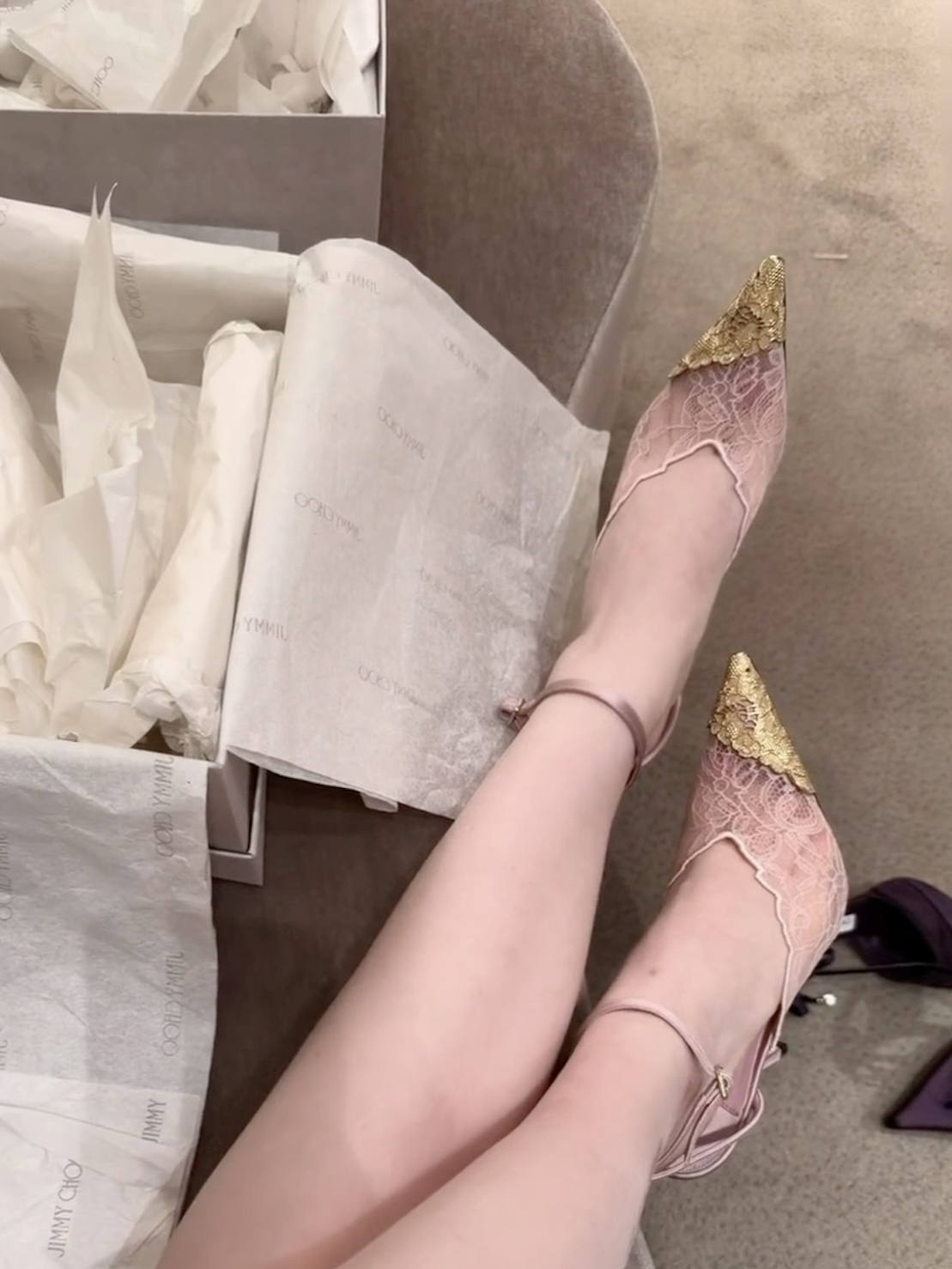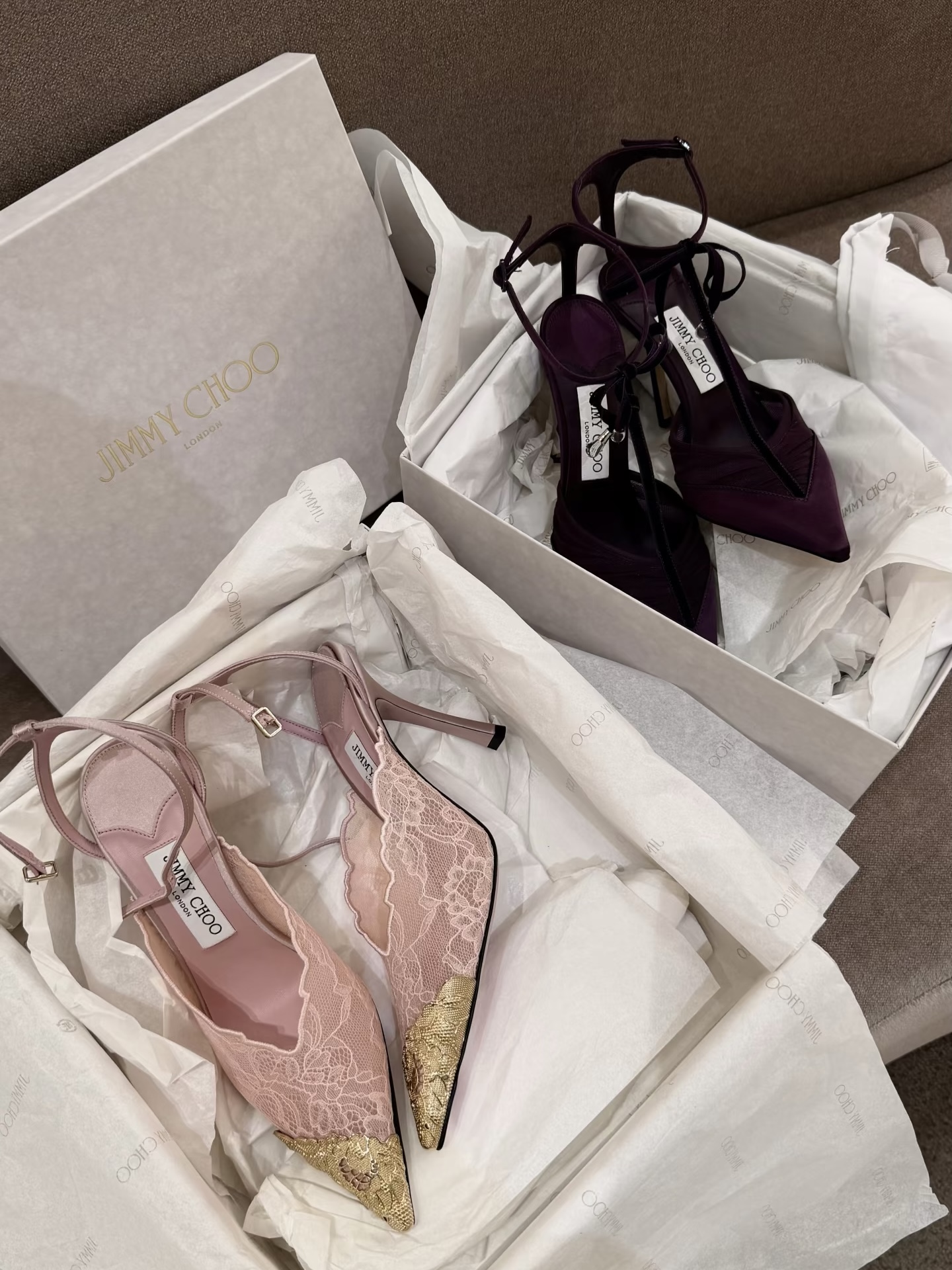 成年人无法做选择,蕾丝金箔,紫色缎面,我都好爱!太美了太美了,狠狠拿捏我的心 日常出门或约会都能穿,非常纯欲性感,后绊带能稳住脚,走路相对稳当,金饰点缀和紫色缎面不会太夸张,Jimmy Choo 你放过我的钱包吧!!
