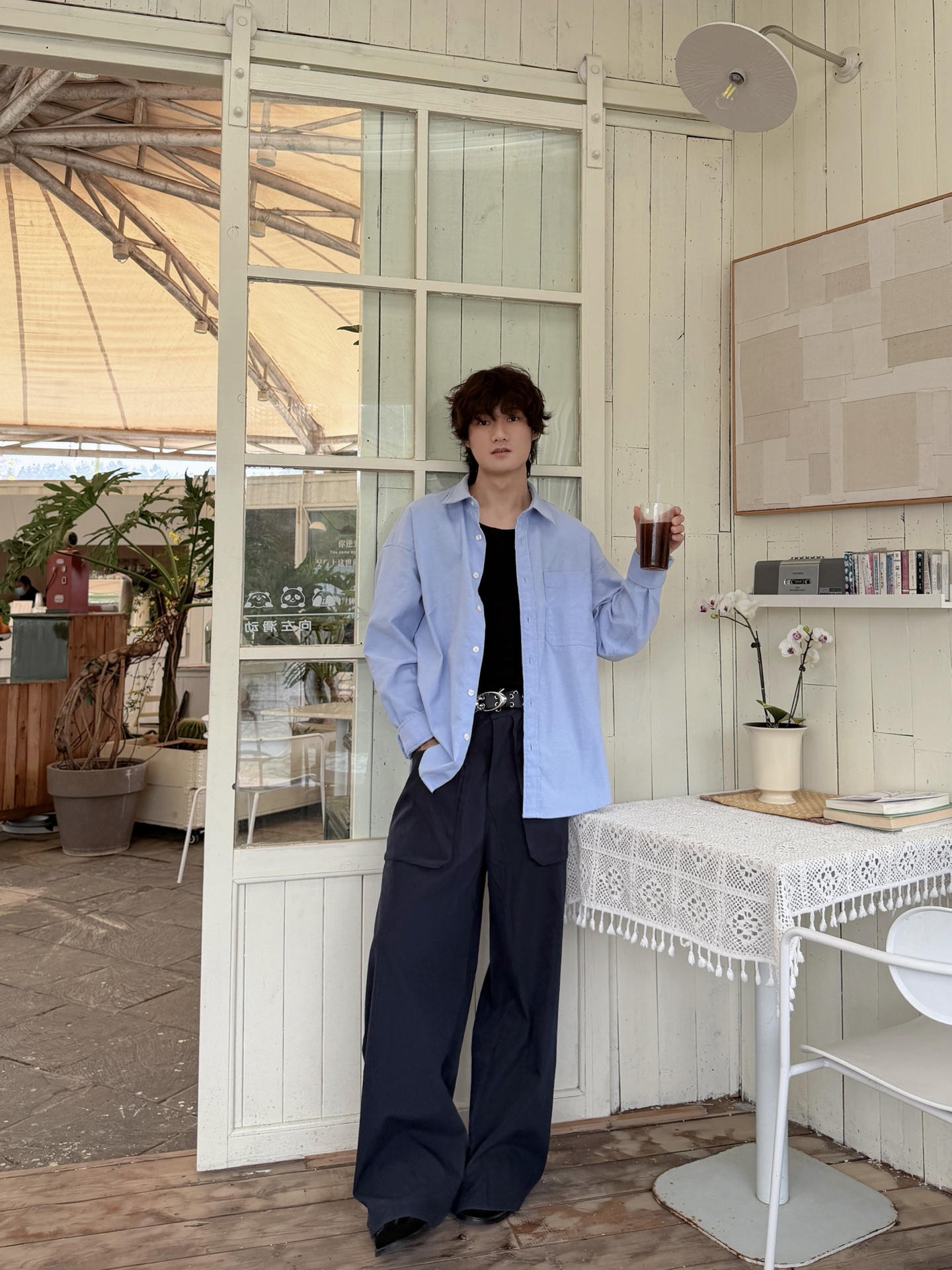 春天就该穿得清清爽爽出门呀✨ 浅蓝衬衫+黑内搭+藏青阔腿工装裤 一套直接把韩系松弛感焊在身上 衬衫是软乎乎的棉感,单穿叠穿都合适 阔腿裤垂感绝了,藏肉又显腿长 随便搭个金属腰带就很有细节感 在湖边的小咖啡馆坐一下午 吹着风喝着冰美式,舒服到不想走 这才是春天该有的样子嘛~