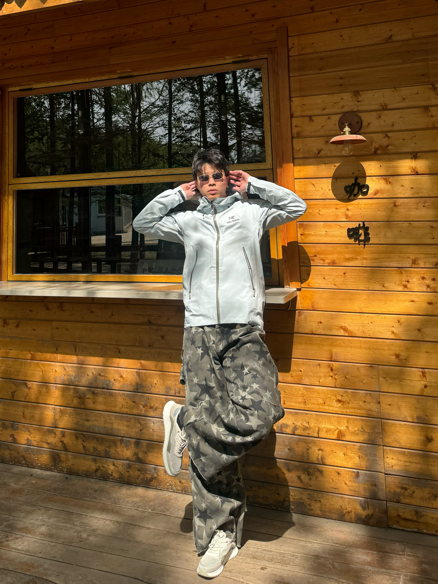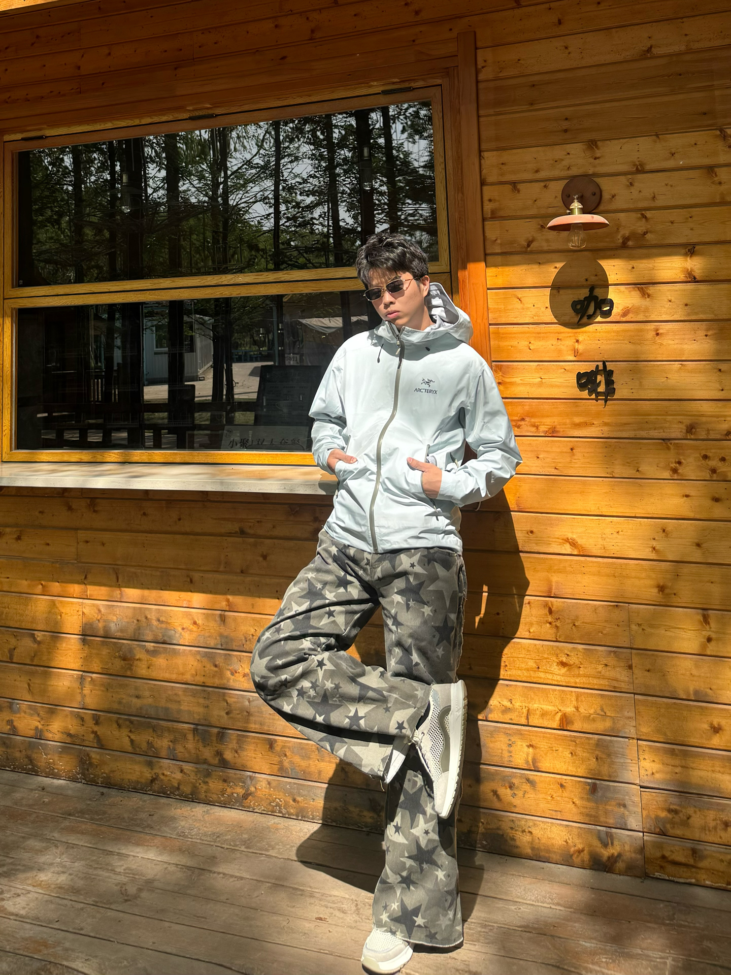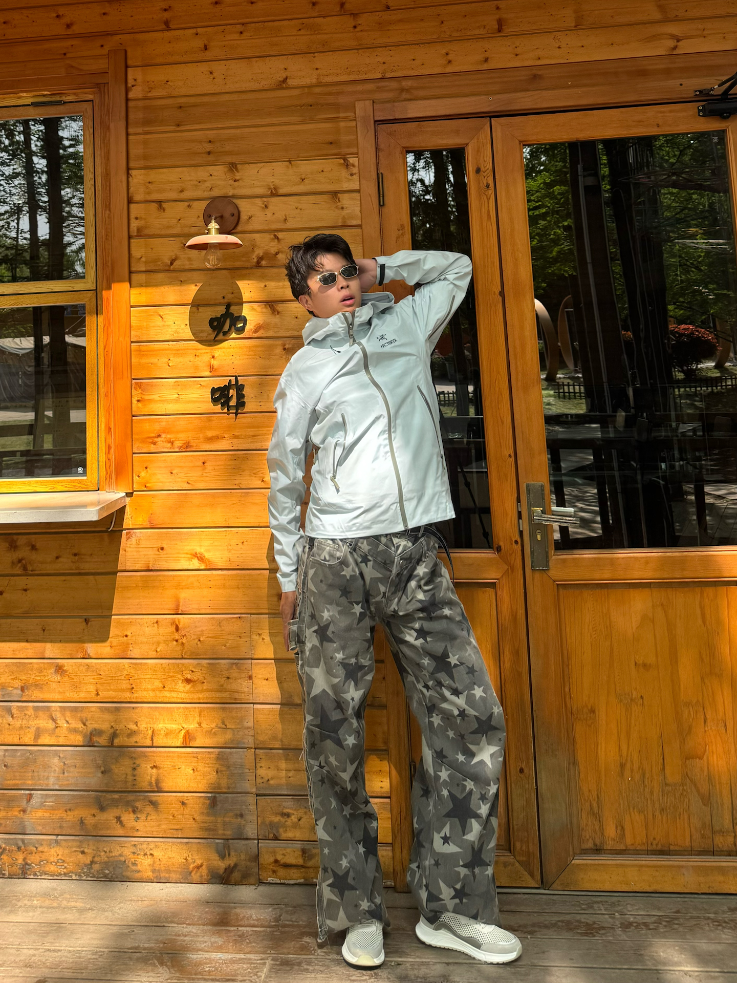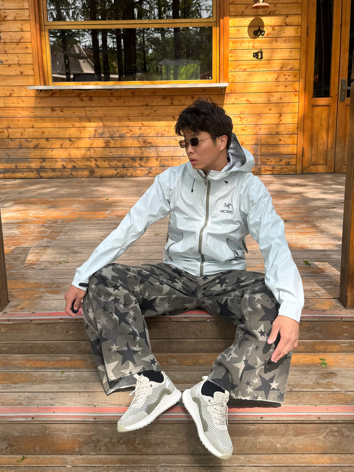 今日穿搭~来自(183 160) 👔上身搭配始祖鸟浅蓝连帽冲锋衣 👖下身搭配星星迷彩阔腿工装裤 👟脚上搭配网面透气厚底休闲鞋 SPIRIT 高个子男生松弛感穿搭 冲锋衣简约利落星星裤氛围感拉满 这双网面鞋是整套亮点 透气不闷脚厚底显高不笨重 和复古裤装完美适配日常穿舒服又出片