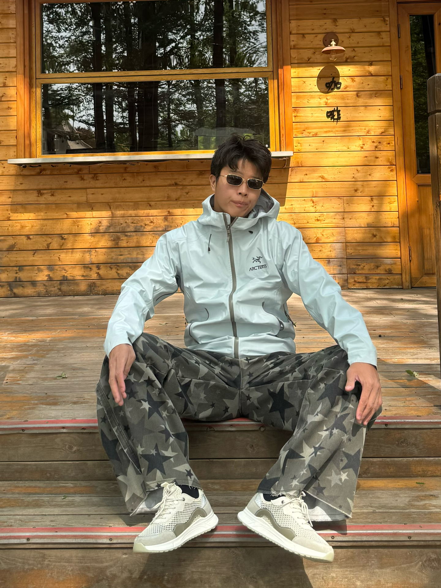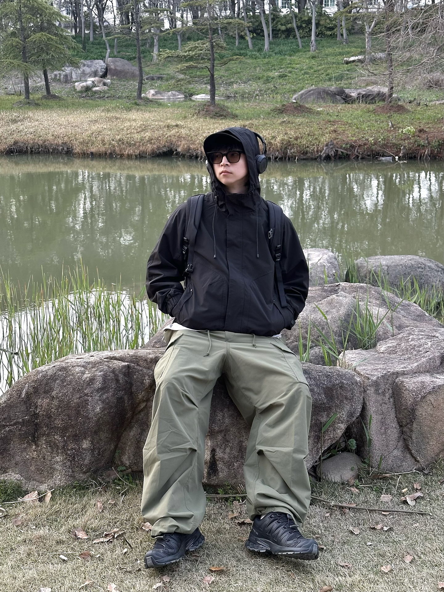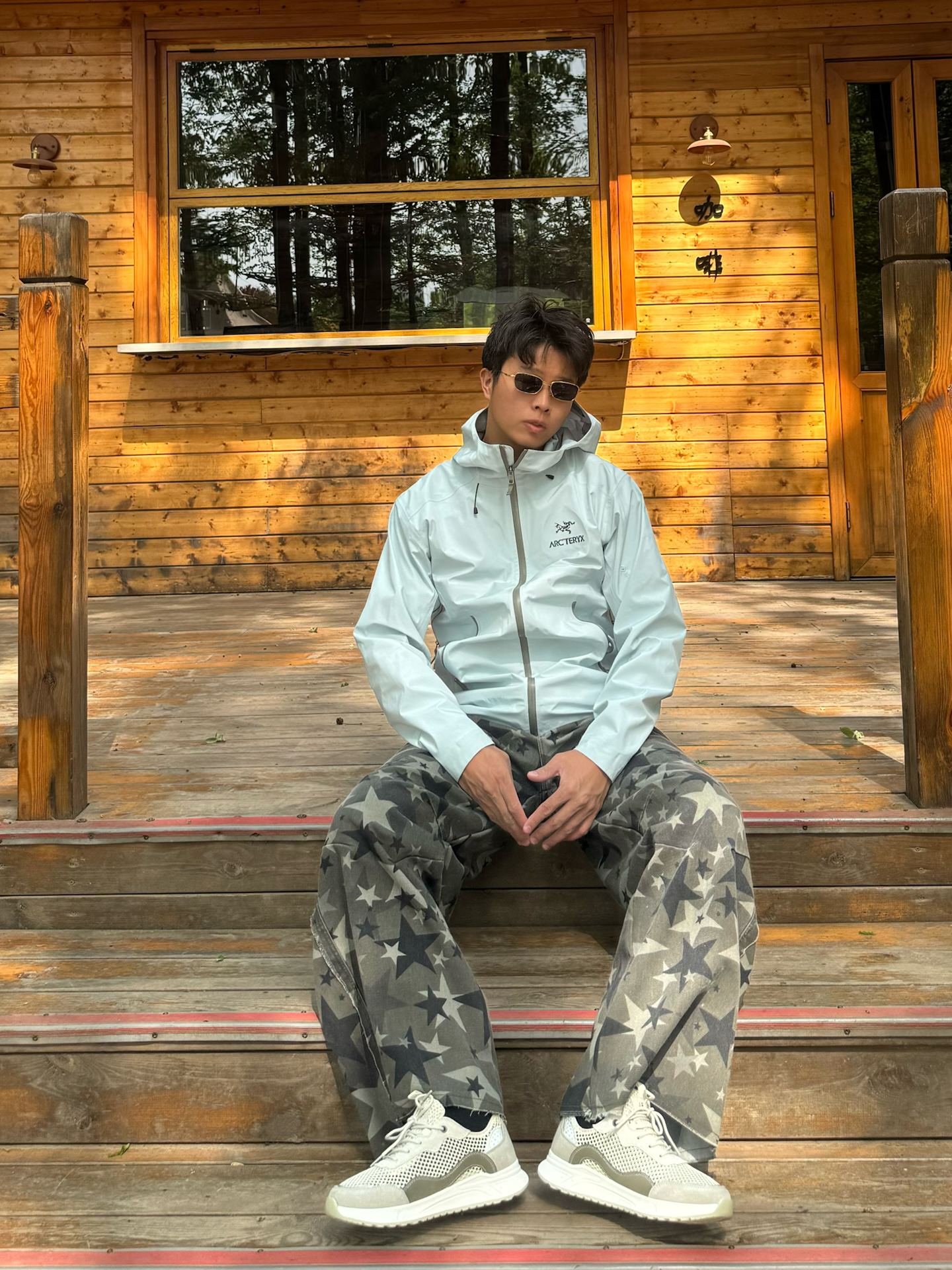 今日穿搭~来自(183 160) 👔上身搭配始祖鸟浅蓝连帽冲锋衣 👖下身搭配星星迷彩阔腿工装裤 👟脚上搭配网面透气厚底休闲鞋 SPIRIT 高个子男生松弛感穿搭 冲锋衣简约利落星星裤氛围感拉满 这双网面鞋是整套亮点 透气不闷脚厚底显高不笨重 和复古裤装完美适配日常穿舒服又出片